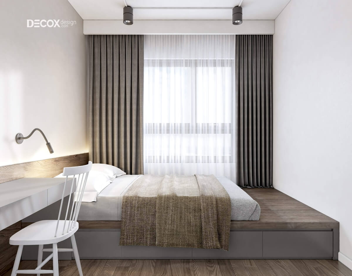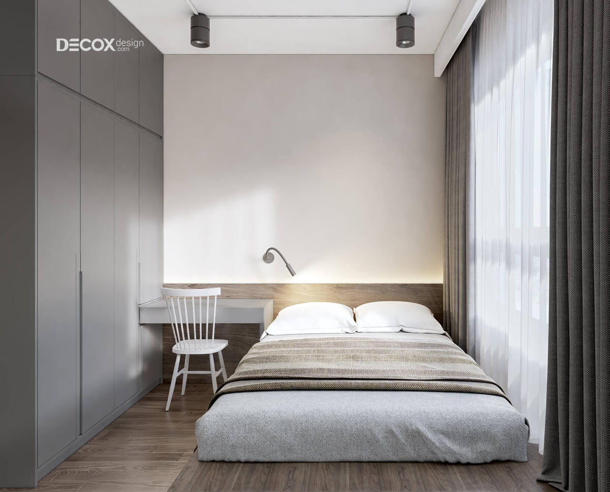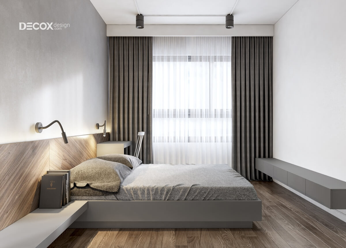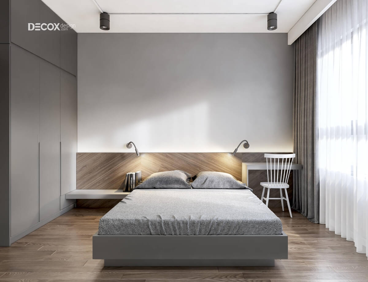 Sàn gỗ với màu nâu quý phái hòa quyện điệu nghệ cùng màu trắng của trần nhà và màu xám của giường ngủ tạo nên sự cân bằng trong phối trộn màu sắc. Khu vực đầu giường ngủ được thiết kế thêm một kệ sách kệ sách nhỏ rất duyên dáng giúp cho chủ nhân có thể thư giãn trước khi đi ngủ.