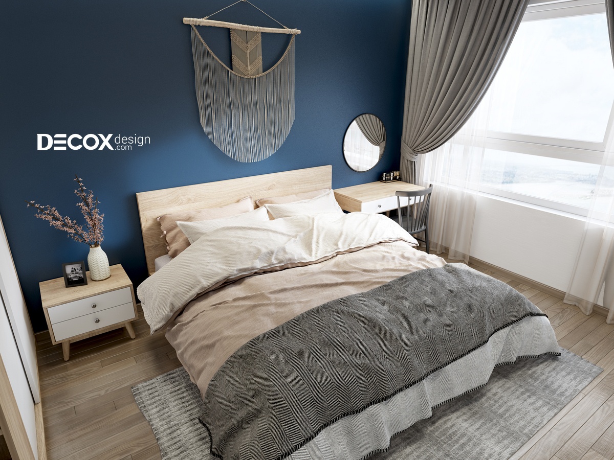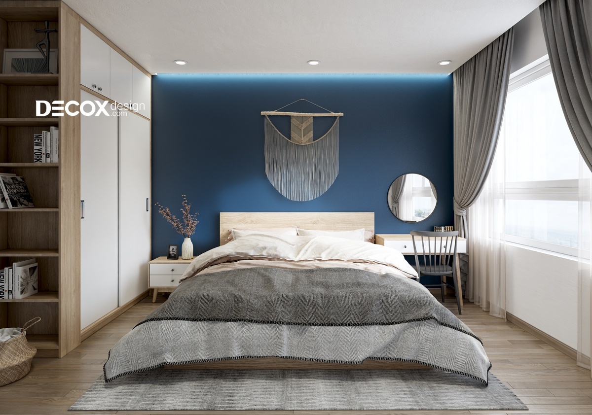 Màu trắng của trần nhà hòa cùng màu xanh sang trọng và nét tự nhiên của gỗ đã tạo nên một phòng ngủ thoáng đãng và đầy cá tính. Kệ sách được tích hợp cùng tủ đựng quần áo mang đến cảm giác mới lạ trong thiết kế. Ngoài ra, với cửa sổ rộng sẽ giúp cho chủ nhân luôn cảm thấy tràn đầy năng lượng.