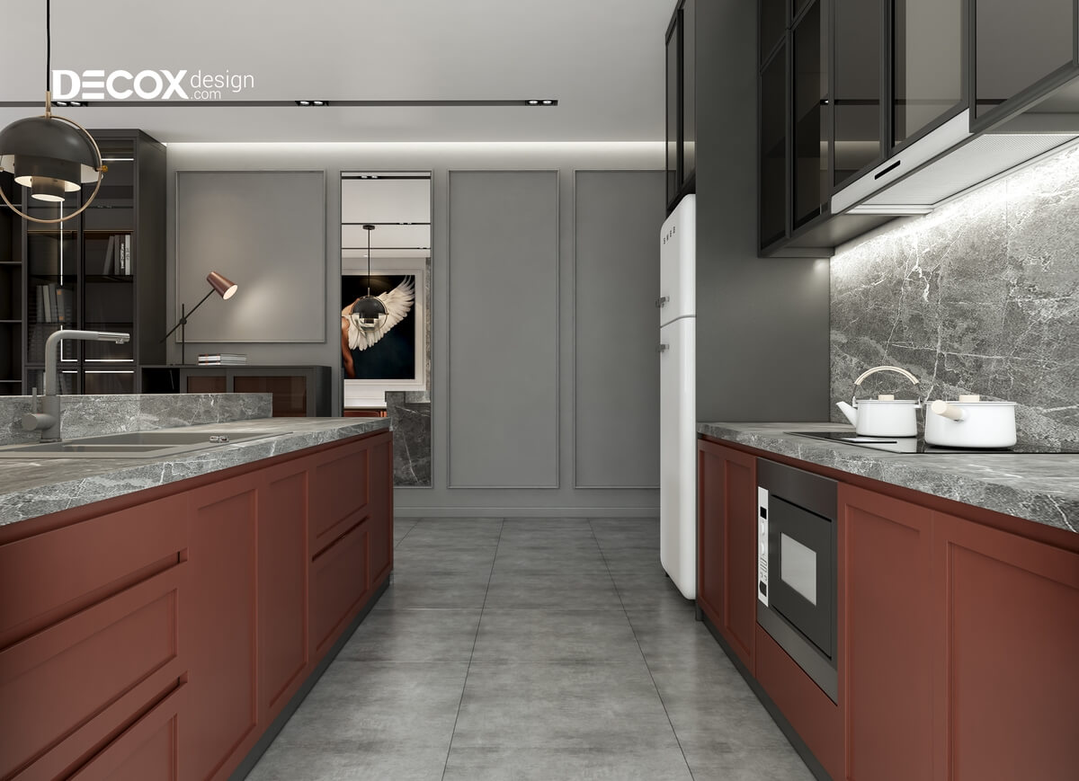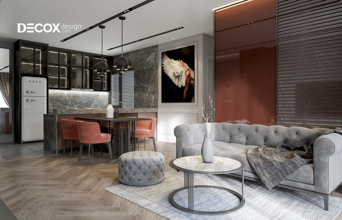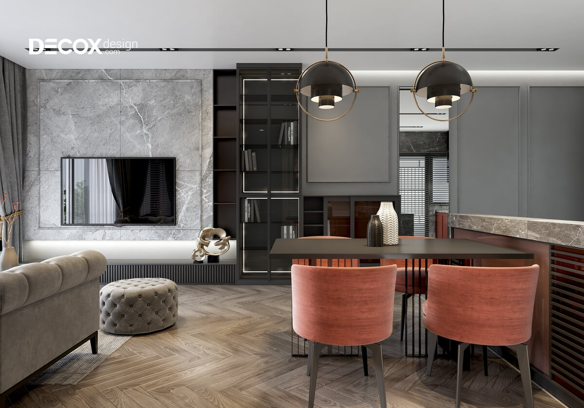 Với mẫu thiết kế nội thất chung cư đầy màu sắc hay trầm lạnh thì tùy vào sở thích của cá nhân. Decox Design đã không ngừng đưa ra những ý tưởng cho căn hộ của bạn. Thiết kế nội thất căn hộ Palm Heights có diện tích 85m2 de012 với phong cách bán cổ điển với đường nét sắc xảo, nội thất hiện đại cùng với sự kết hợp của màu đỏ nung và xám đã tạo nên lối thiết kế mới lạ, đẳng cấp và lôi cuốn thị giác. Thiết kế nội thất căn hộ Palm Heights 85m2 de012 hứa hẹn mang đến một không gian sống đẳng cấp và sang trọng.