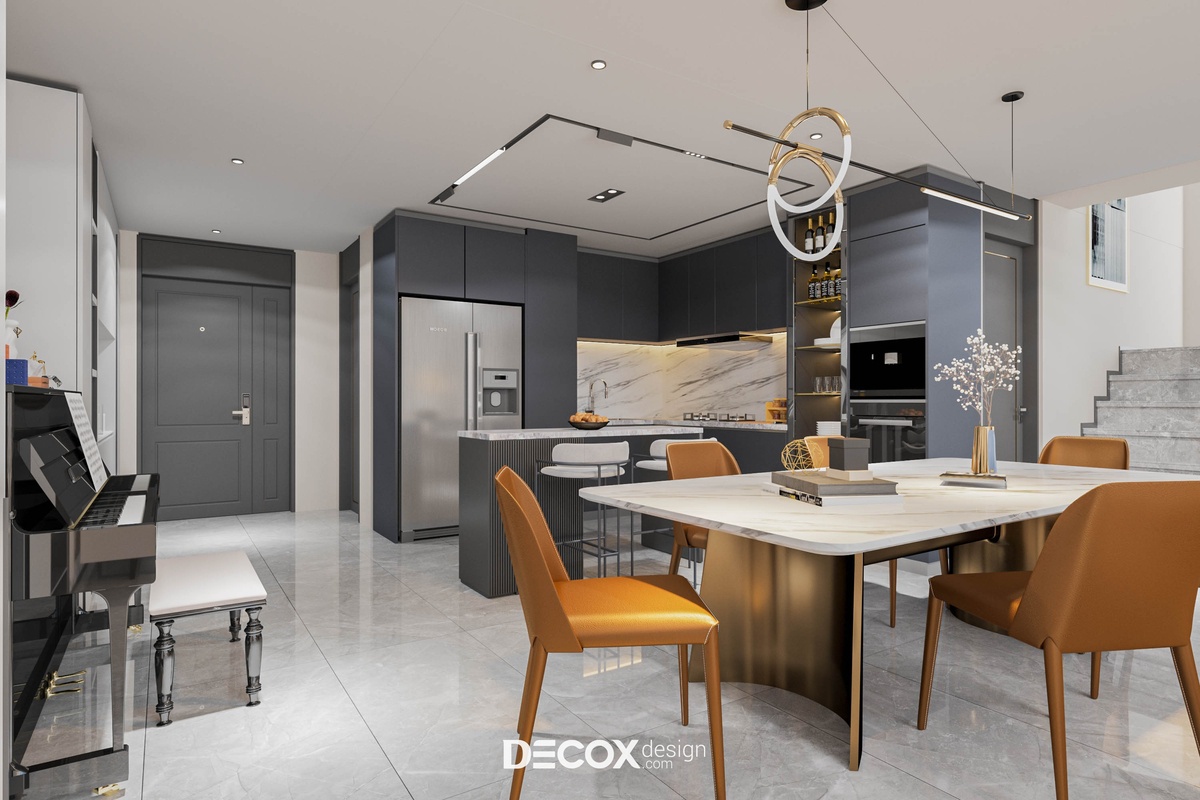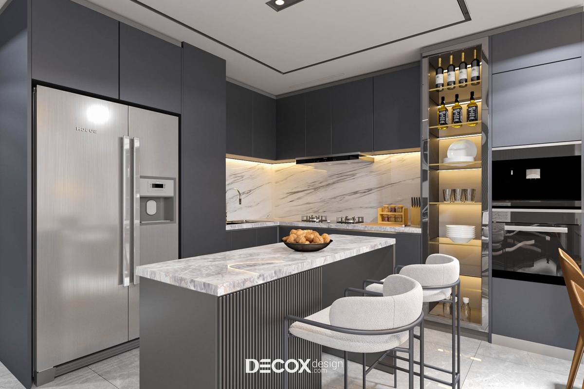 Khu vực khách bếp được thiết kế theo dạng mở tạo sự thuận tiện trong việc di chuyển, đồng thời việc không có bất kỳ vật cản nào ngăn cách sẽ giúp tầm nhìn cũng như không gian trở nên thông thoáng hơn. Thiết kế bếp mang đến cái nhìn đồng bộ khi hệ tủ bếp cho đến bàn đảo đều lấy tone đen chủ đạo. Việc sử dụng tone màu trái ngược với tone màu tường giúp khu vực bếp trở nên ấn tượng và bắt mắt hơn.