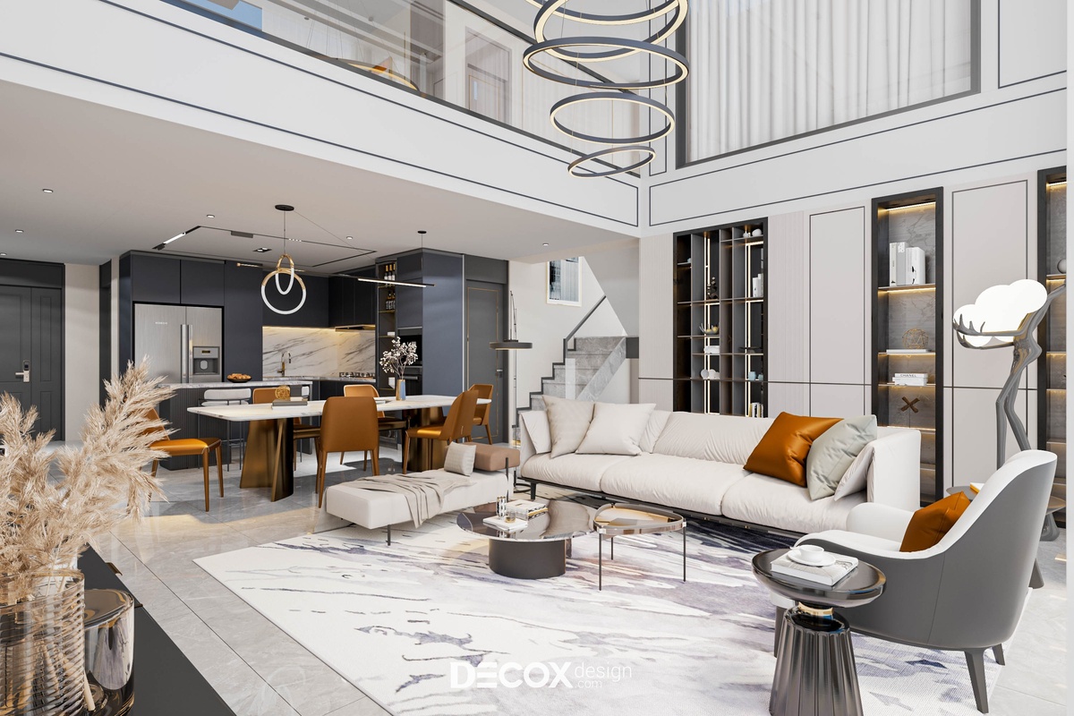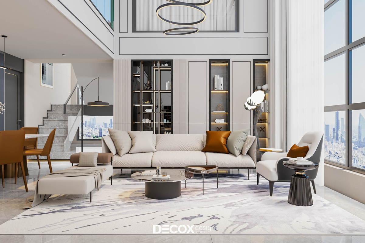 Với vị thế nằm ở tầng cao nhất của tòa nhà, căn hộ penthouse không chỉ có được tầm view đắt giá mà còn vô cùng thông thoáng và sáng sủa nhờ thiết kế thông tầng kết hợp chất liệu kính đón nhận tối ưu nguồn sáng tự nhiên vào trong nhà. Ở đây, các KTS Decox Design đã lựa chọn thiết kế nội thất theo phong cách hiện đại với tone trắng chủ đạo, đồng thời kết hợp thêm những chi tiết mạ vàng cùng tone nâu trầm ấm làm điểm nhấn cho không gian thêm phần sang trọng, tinh tế.