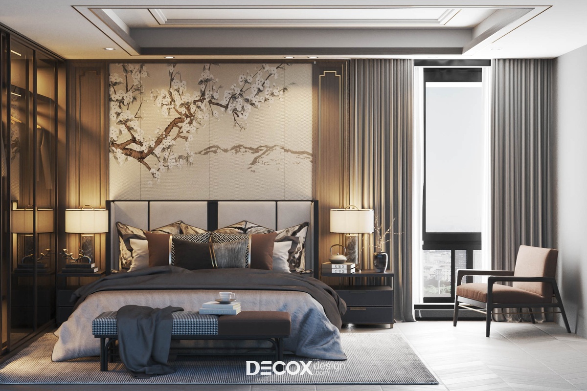 Trái ngược với những không gian khác trong nhà, đến với phòng ngủ master bạn sẽ cảm nhận được sự ấm cúng cũng như một chút nét đẹp văn hóa phương Đông thông qua gam màu nội thất, chất liệu sử dụng cùng tranh trang trí đầu giường. Việc chọn lựa tone màu nâu kết hợp thêm ánh đèn vàng không chỉ nâng tầm thẩm mỹ mà còn bổ trợ rất tốt cho giấc ngủ của gia chủ. Bên cạnh đó, việc thiết kế cửa kính nhỏ cạnh giường ngủ đã mở ra một không gian cực "chill" cho những giờ phút thư giãn thêm tuyệt vời.