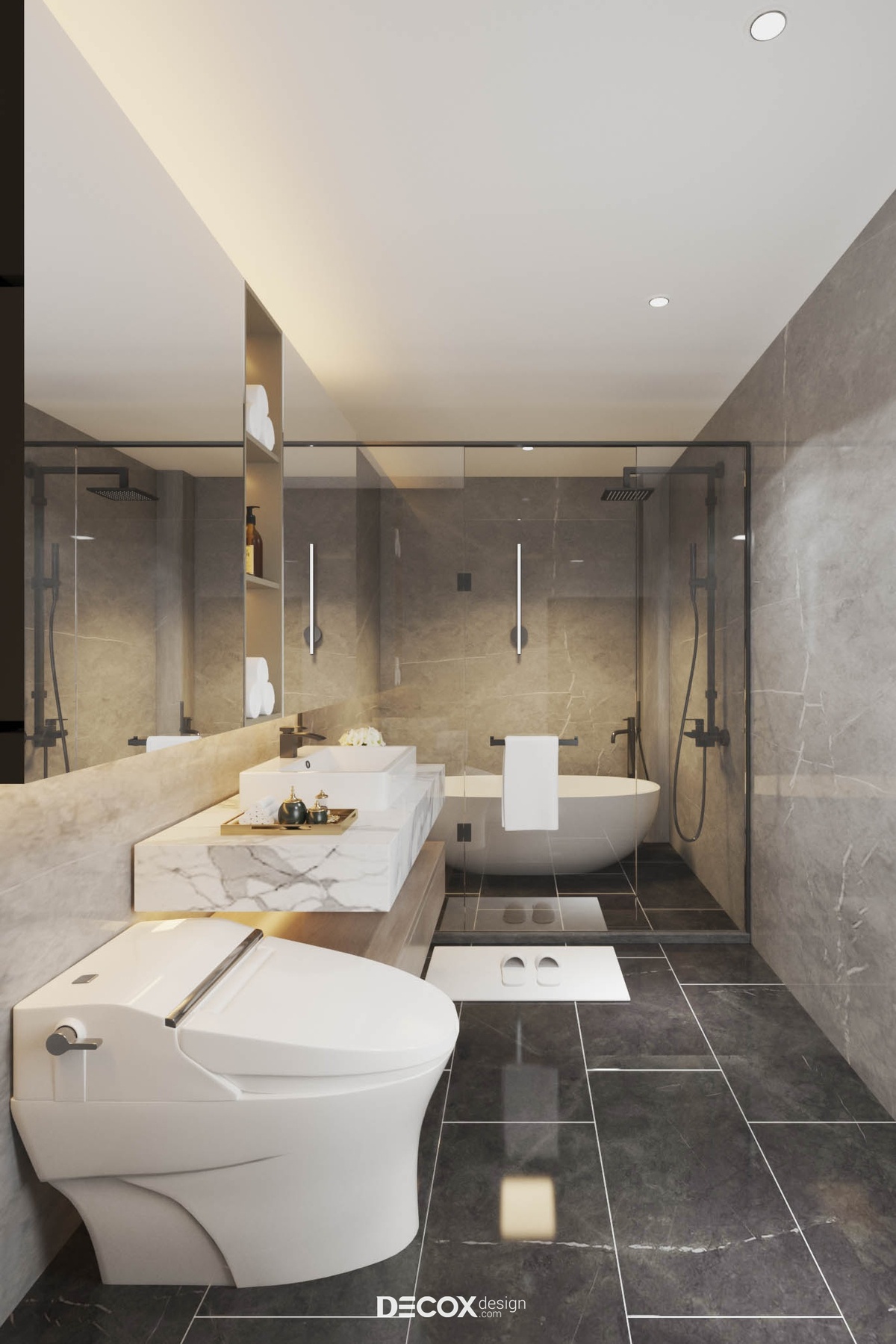 Không gian WC sang trọng, cao cấp với đầy đủ phân khu ướt - khô cùng nội thất hiện đại. Do kết cấu dài sâu ngang hẹp nên KTS Decox Design đã tận dụng chất liệu kính dọc theo bức tường nhằm tạo hiệu ứng mở rộng không gian. Mặt khác, sử dụng đèn led hắt điểm giúp hệ tủ treo tường thêm phần nổi bật cũng là điểm nhấn đáng chú ý trong không gian này.
