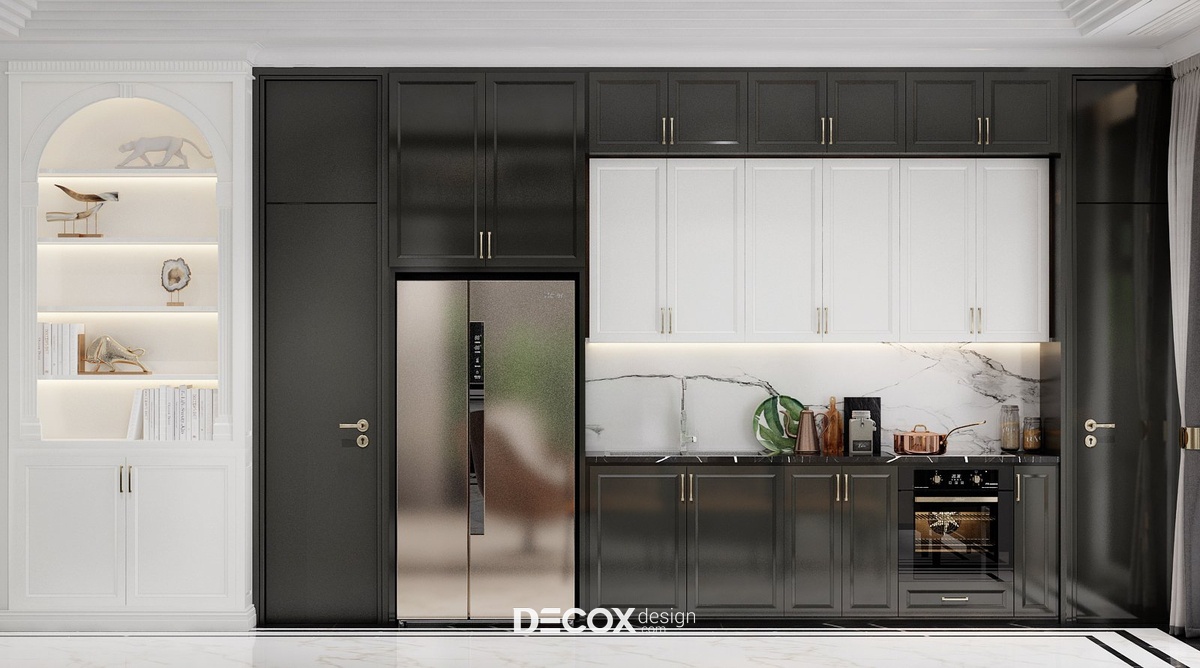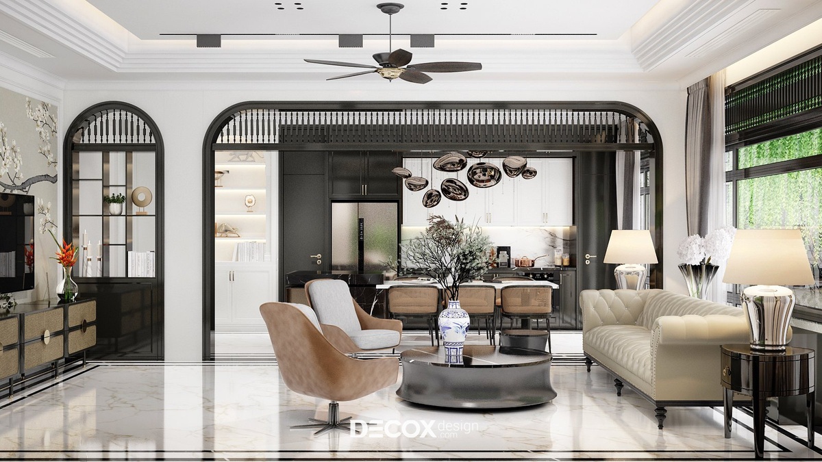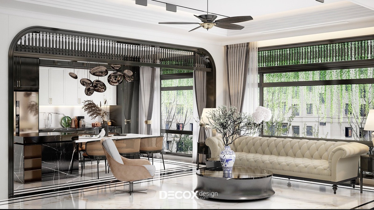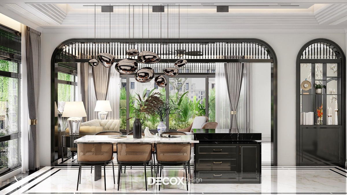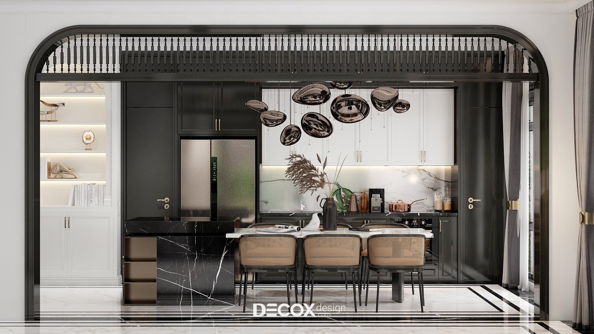 Đến với phòng bếp và phòng ăn Decox Design đã lựa chọn lối thiết kế không gian mở. Việc không có bất kỳ bức tường hay vách ngăn nào chắn giữa khách - bếp không chỉ nâng tầm thẩm mỹ căn hộ mà còn đi kèm nhiều lợi ích khác như tối ưu hóa diện tích, tăng độ thoáng và sáng cho không gian, tạo sự thuận tiện cho người dùng khi di chuyển giữa các khu vực... Tuy nhiên, để công năng được thể hiện rõ nét hơn các KTS đã thiết kế hệ cửa vòm đen điểm xuyết chi tiết con tiện trang trí đậm chất indochine nổi bật trên nền tường trắng tại điểm giao thoa của 2 khu vực.