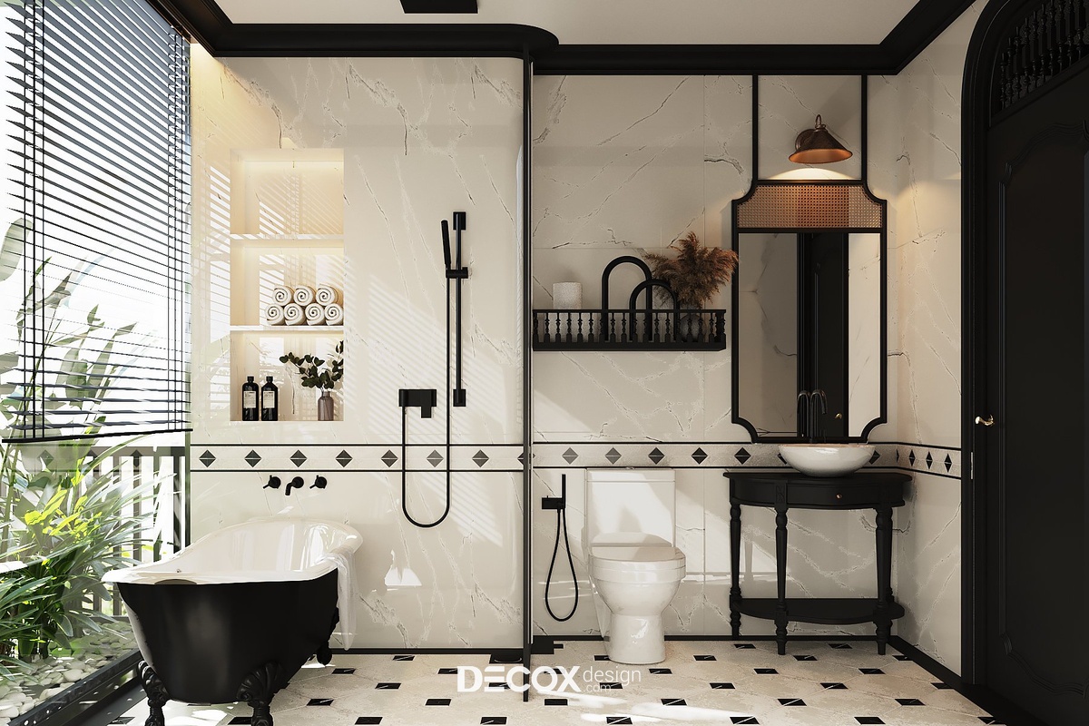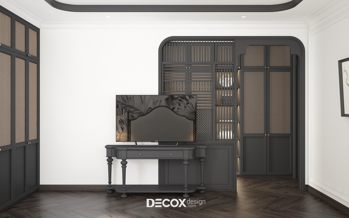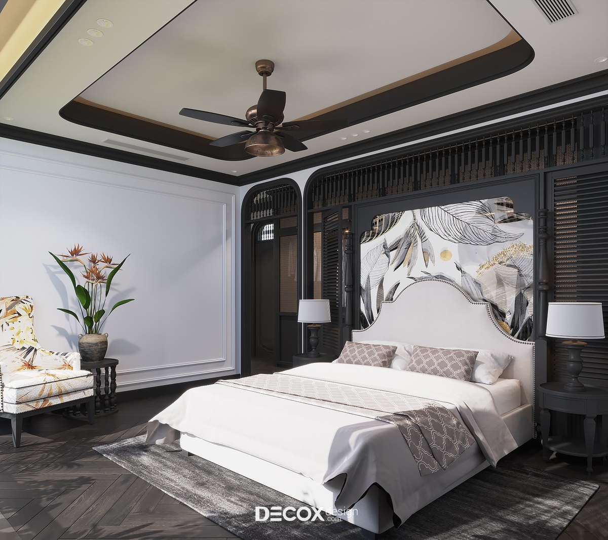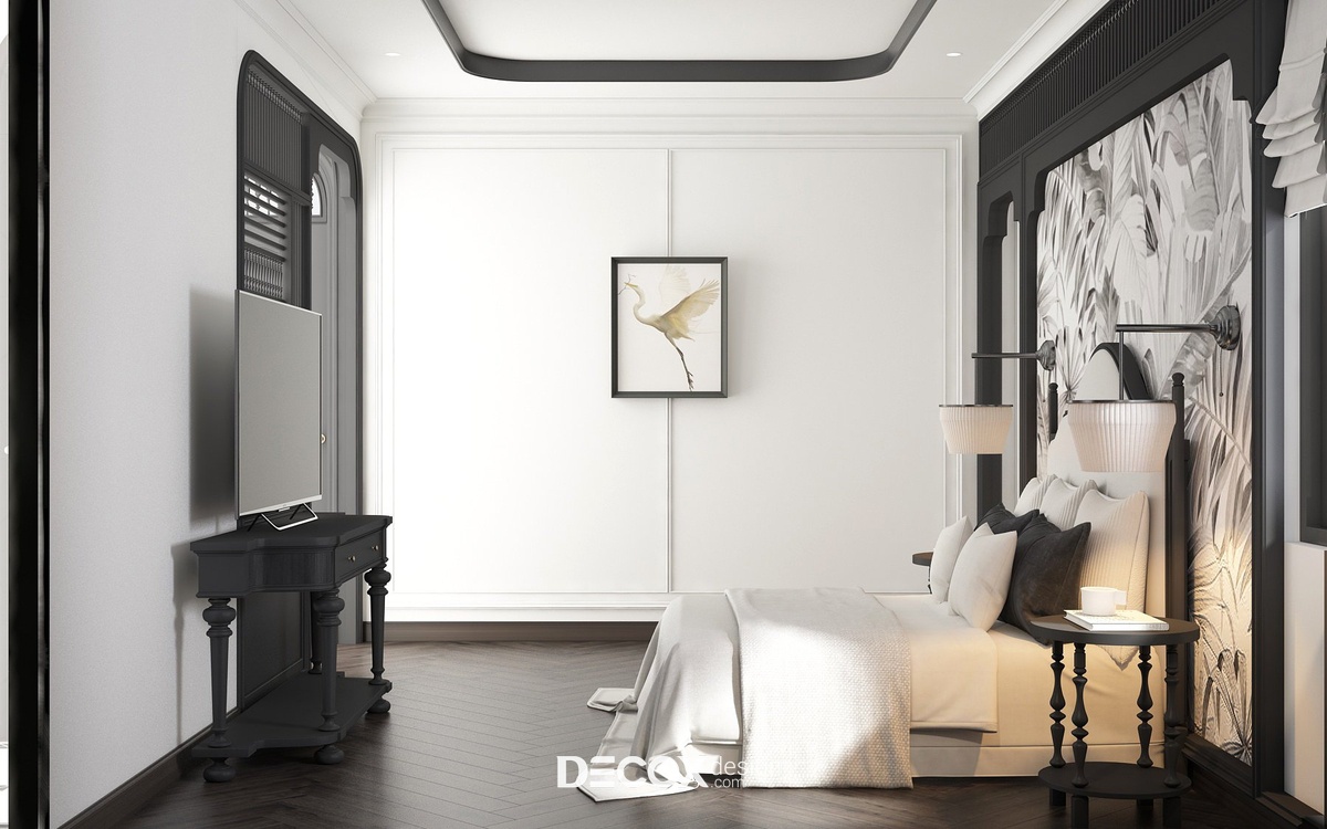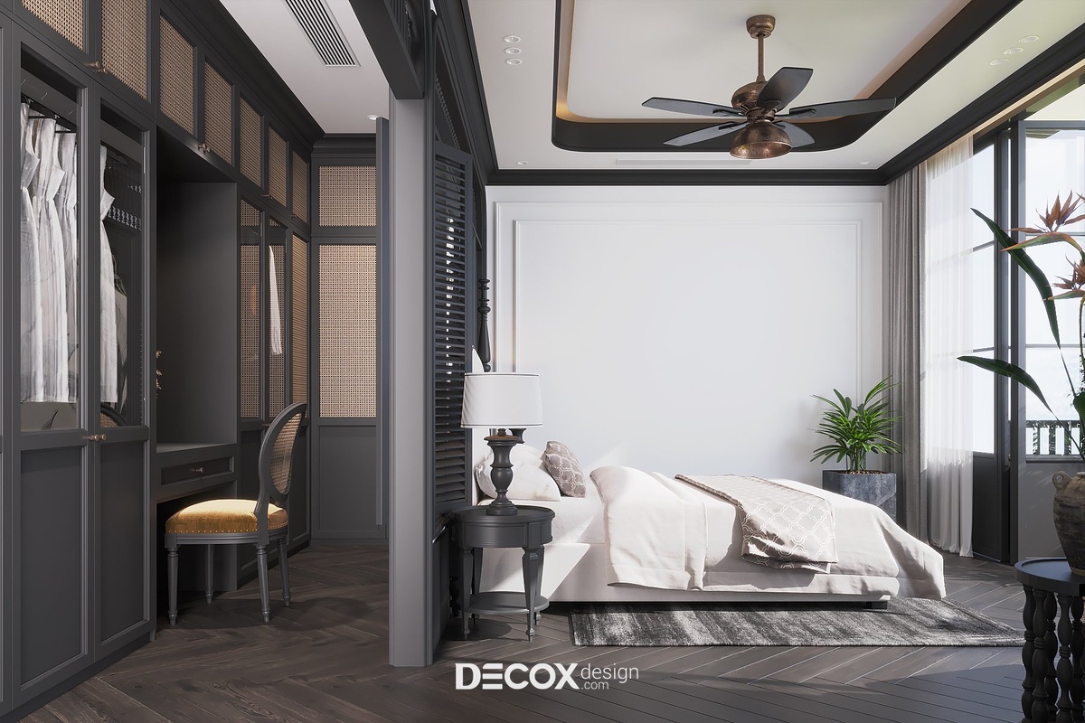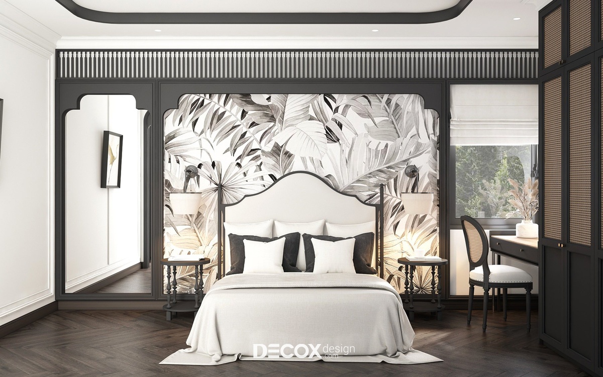 Để tạo sự đồng bộ và kết nối giữa các khu vực trong nhà, thiết kế phòng ngủ master vẫn lấy 2 tone màu trắng - đen chủ đạo. Ngoài những chi tiết đặc trưng của phong cách Indochine như cửa vòm, con tiện, nội thất đan lát từ chất liệu tự nhiên, không gian phòng ngủ master còn bổ sung thêm họa tiết hoa lá đặc trưng của miền nhiệt đới ở khu vực đầu giường và ghế thư giãn cùng hoa sen trang trí - biểu tượng mang đậm nét văn hóa Việt Nam. Bên trong không gian phòng ngủ master còn được tích hợp thêm khu vực phòng thay đồ, phòng vệ sinh và ban công đầy tiện ích.