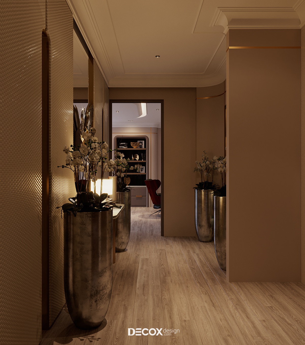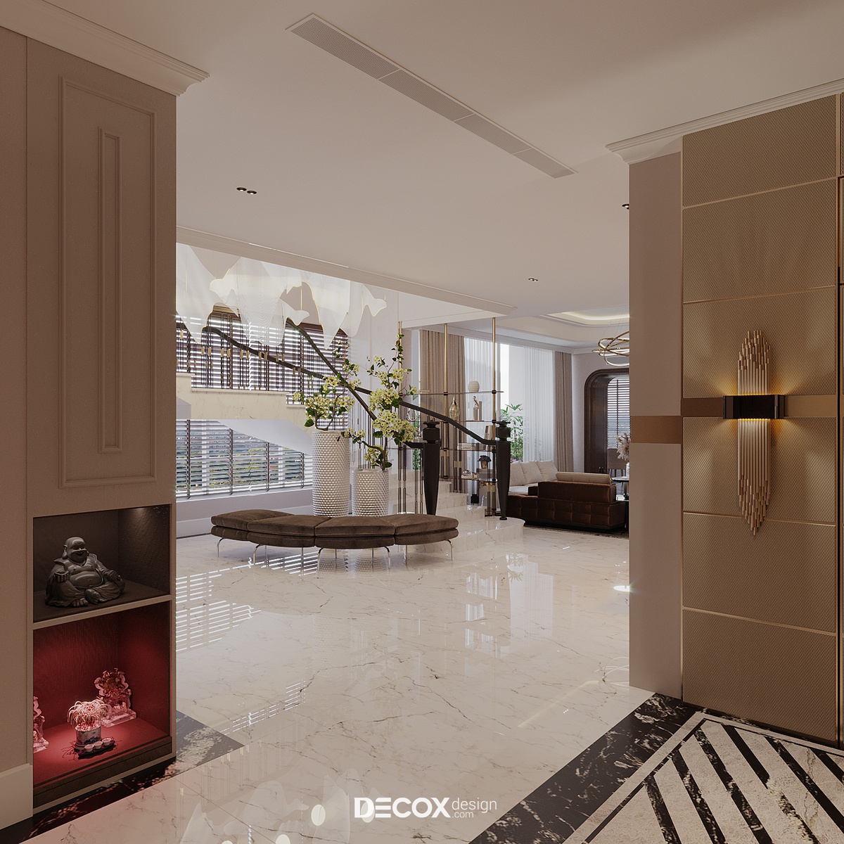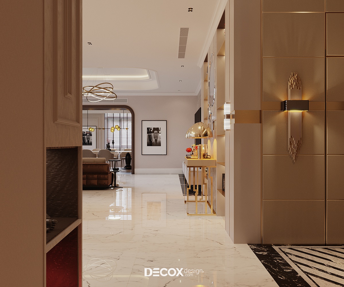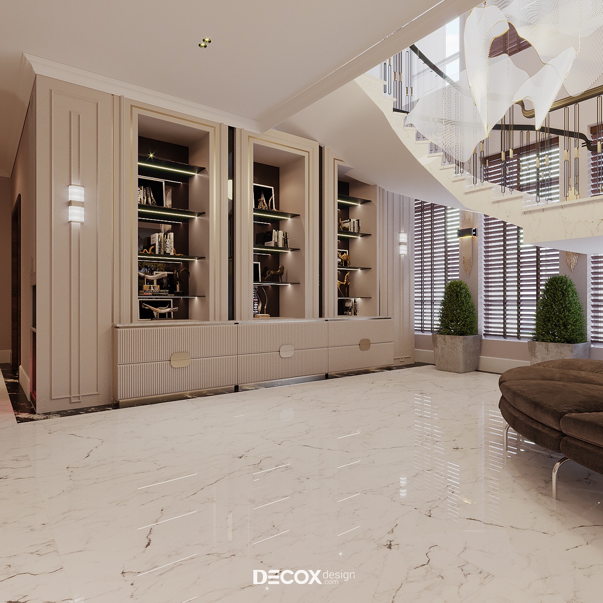Khu vực sảnh được bố trí đối diện cửa ra vào và cạnh cầu thang có thiết kế theo dạng đường cong uốn lượn mềm mại dẫn lên tầng một của căn hộ. Không có quá nhiều chi tiết trang trí cầu kỳ hay bố cục dày đặc nhưng sảnh chờ vẫn toát lên được tinh thần sang trọng của nhà. Ngoài bộ ghế đôn êm ái được thiết kế theo hình vòng cung ôm trọn hai chậu cây kiểng có kích thước không đồng đều, Decox Design còn bổ sung thêm bộ đèn thả cách điệu bắt mắt để cân bằng bố cục và tạo điểm nhấn cho không gian. Song song đó, KTS cũng khéo léo che đi bức tường trống trải, đơn điệu cũng như “xóa bớt” khoảng trống nơi gầm cầu thang thông qua hệ tủ kệ trang trí mang giá trị thẩm mỹ lẫn tinh thần cao.
