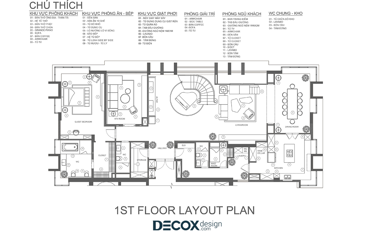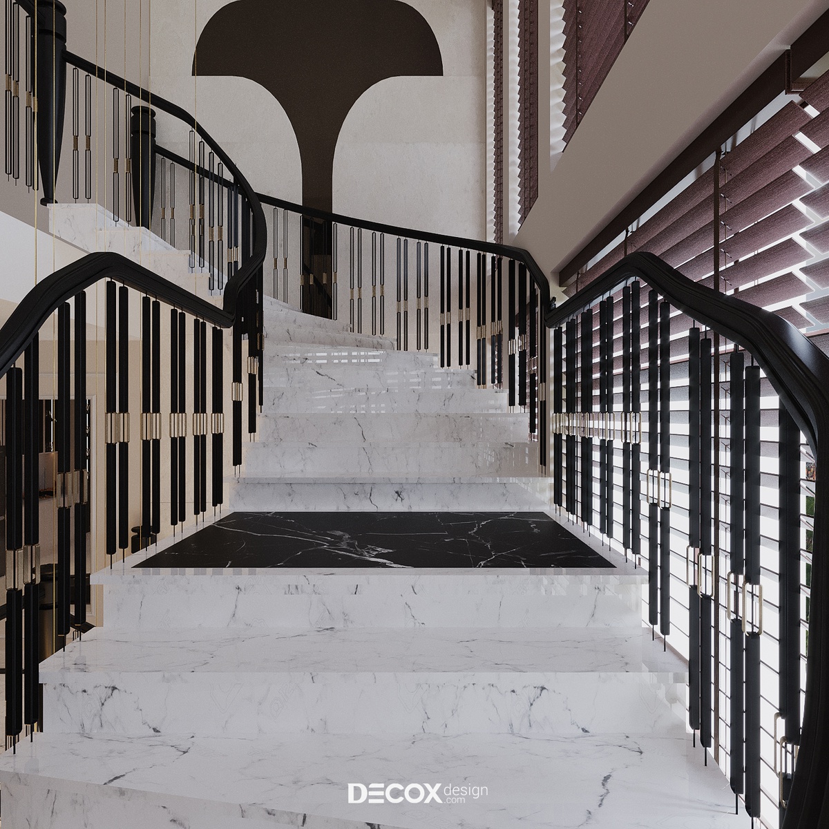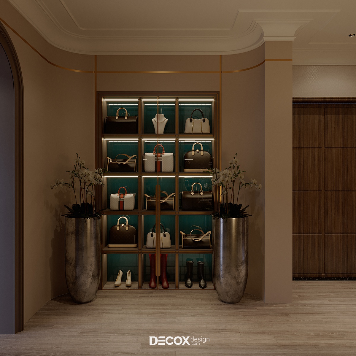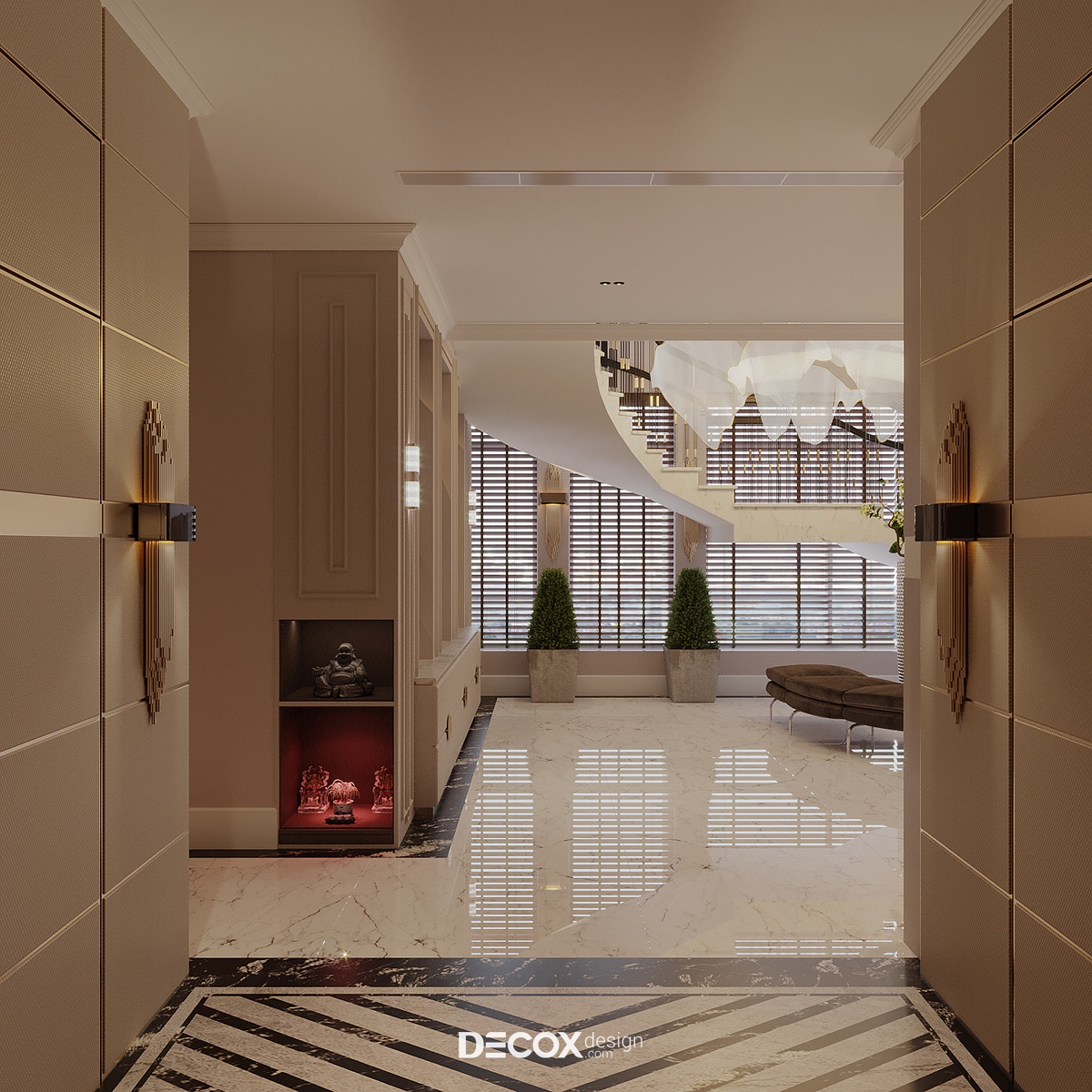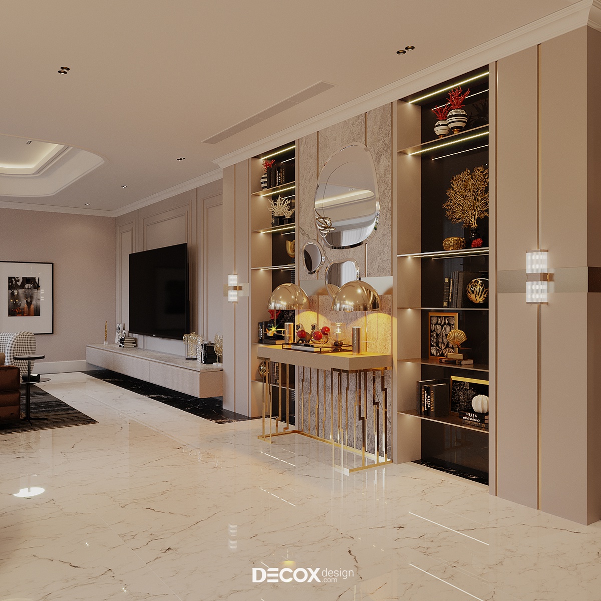 Khu vực sảnh được bố trí đối diện cửa ra vào và cạnh cầu thang có thiết kế theo dạng đường cong uốn lượn mềm mại dẫn lên tầng một của căn hộ. Không có quá nhiều chi tiết trang trí cầu kỳ hay bố cục dày đặc nhưng sảnh chờ vẫn toát lên được tinh thần sang trọng của nhà. Ngoài bộ ghế đôn êm ái được thiết kế theo hình vòng cung ôm trọn hai chậu cây kiểng có kích thước không đồng đều, Decox Design còn bổ sung thêm bộ đèn thả cách điệu bắt mắt để cân bằng bố cục và tạo điểm nhấn cho không gian. Song song đó, KTS cũng khéo léo che đi bức tường trống trải, đơn điệu cũng như “xóa bớt” khoảng trống nơi gầm cầu thang thông qua hệ tủ kệ trang trí mang giá trị thẩm mỹ lẫn tinh thần cao.