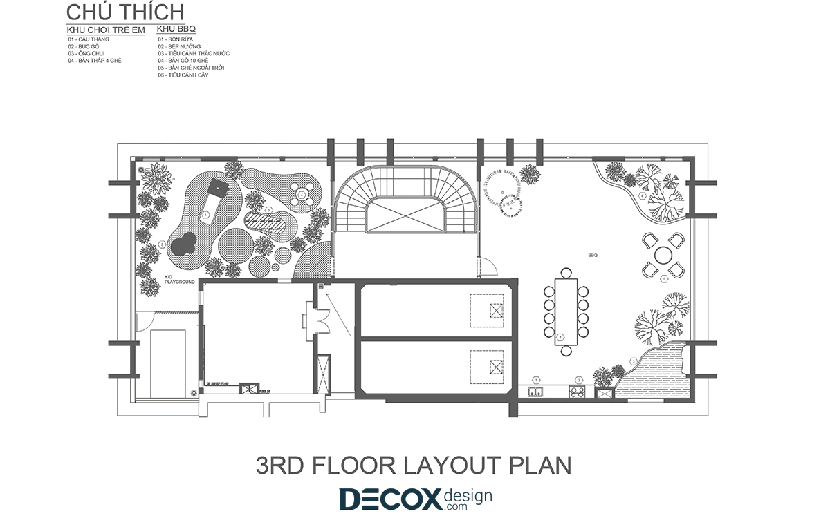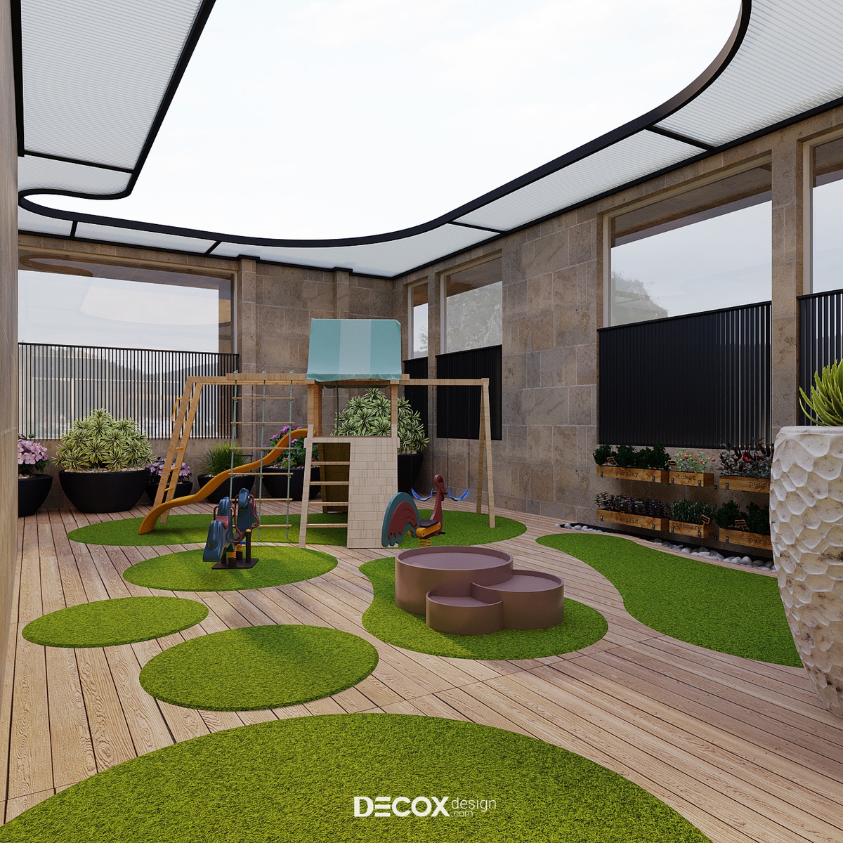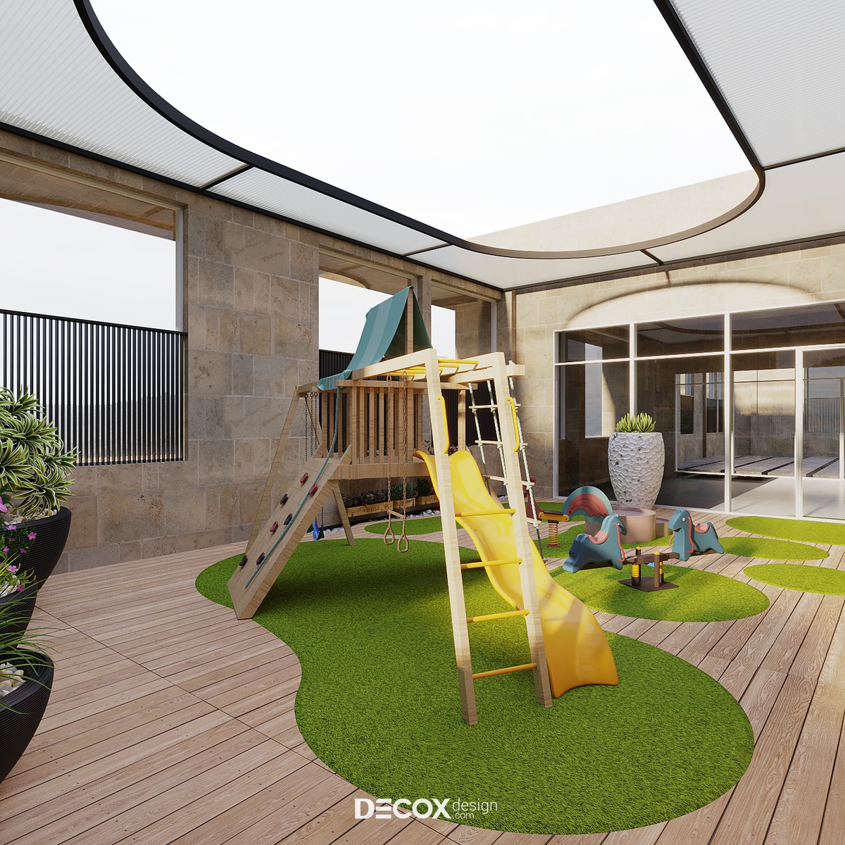 Khu vực tầng ba của căn hộ được bố trí thành hai khu vực bao gồm khu vui chơi trẻ em và khu BBQ ngoài trời cho những buổi tụ họp tuyệt vời. Với khu vui chơi trẻ em, Decox đã thiết kế nên một không gian rộng rãi, thoải mái với mảng xanh của thảm cỏ cùng cầu trượt, khu leo núi, xích đu… cùng chỗ ngồi để phụ huynh có thể dễ dàng quan sát con yêu chơi đùa.