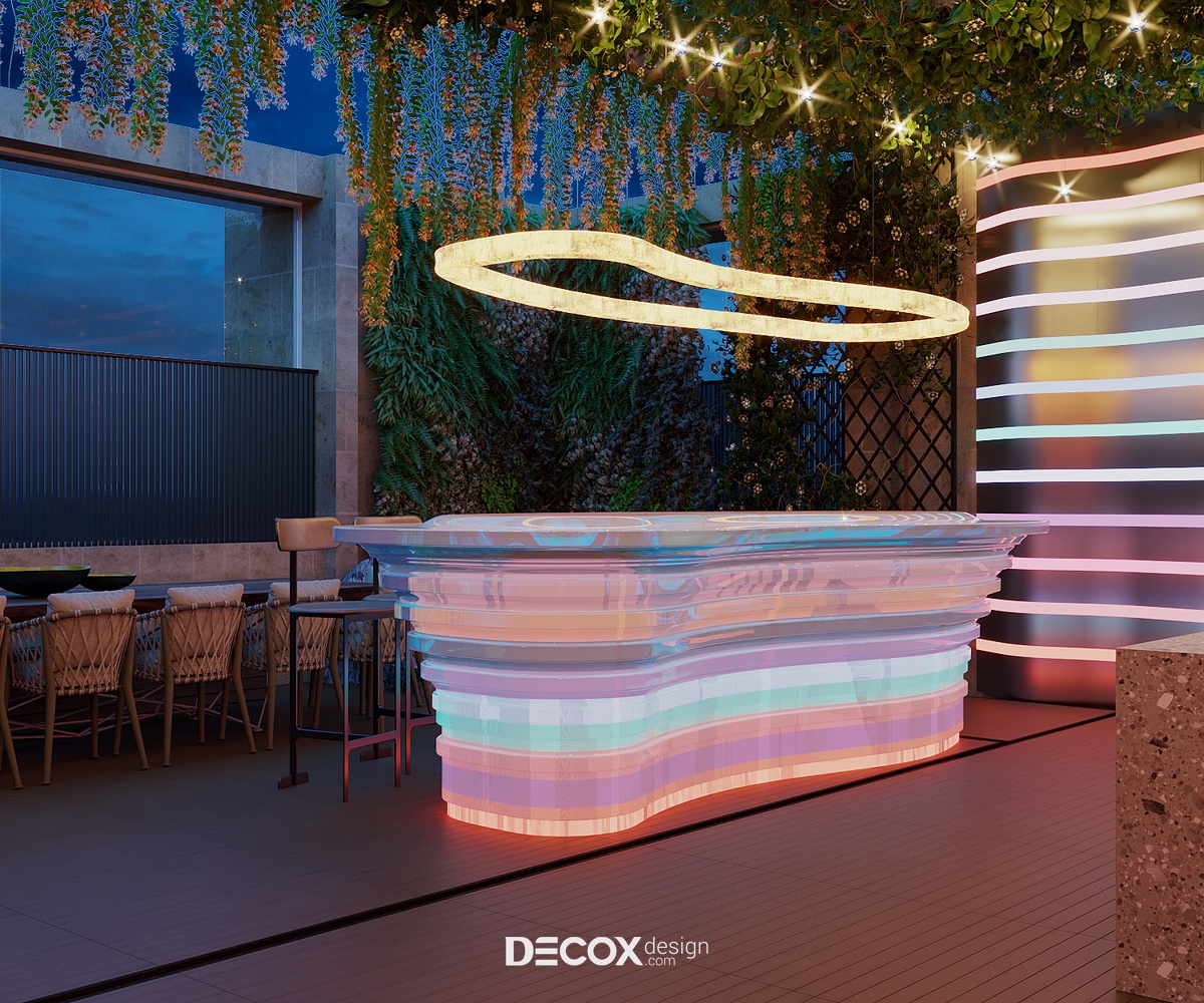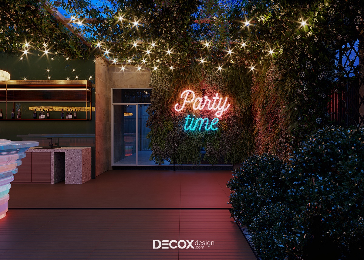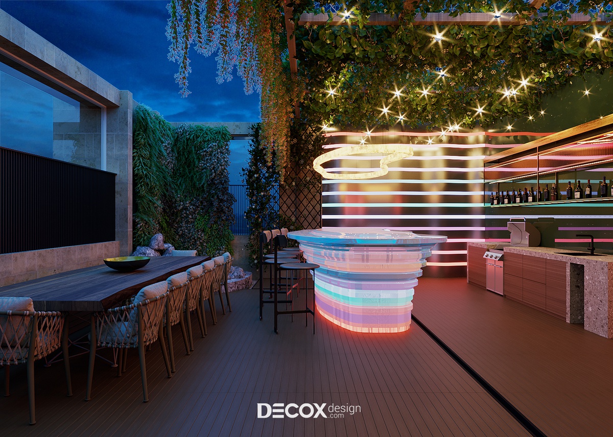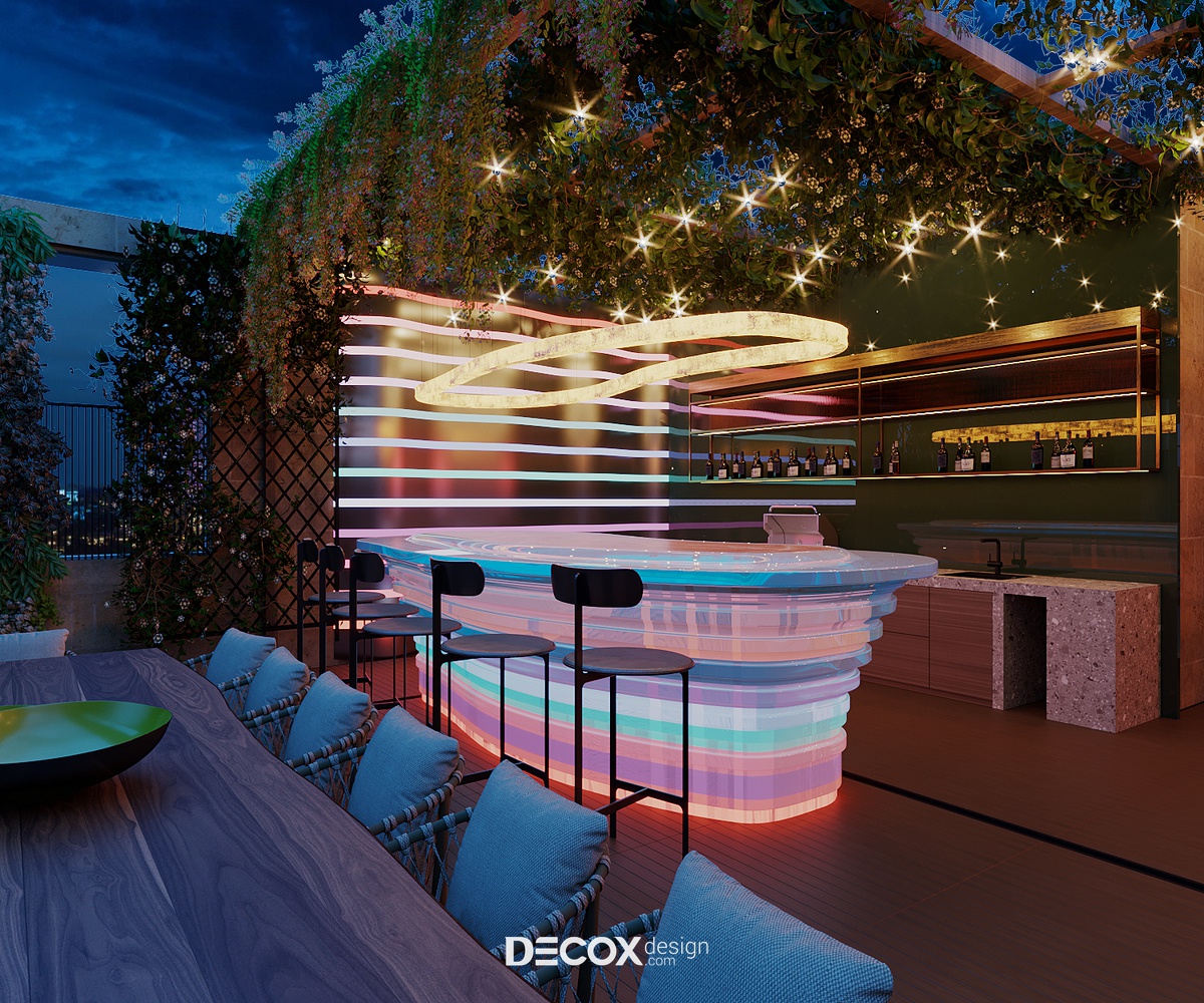 Không gian tiệc tùng ở tầng thượng đủ sức chứa để gia chủ tổ chức những buổi tiệc thân mật. Nơi này được thiết kế không khác gì một quán bar chuyên nghiệp với đầy đủ không gian công năng như bàn tiệc lớn, quầy bar, tủ rượu và quầy chế biến thực phẩm. Điểm nhấn của không gian này chính là quầy bar được thiết kế từ cảm hứng 7 sắc cầu vồng. Với thiết kế đầy màu sắc và cá tính như vậy hứa hẹn sẽ đem lại cho gia chủ không gian tiệc tùng vô cùng thú vị.