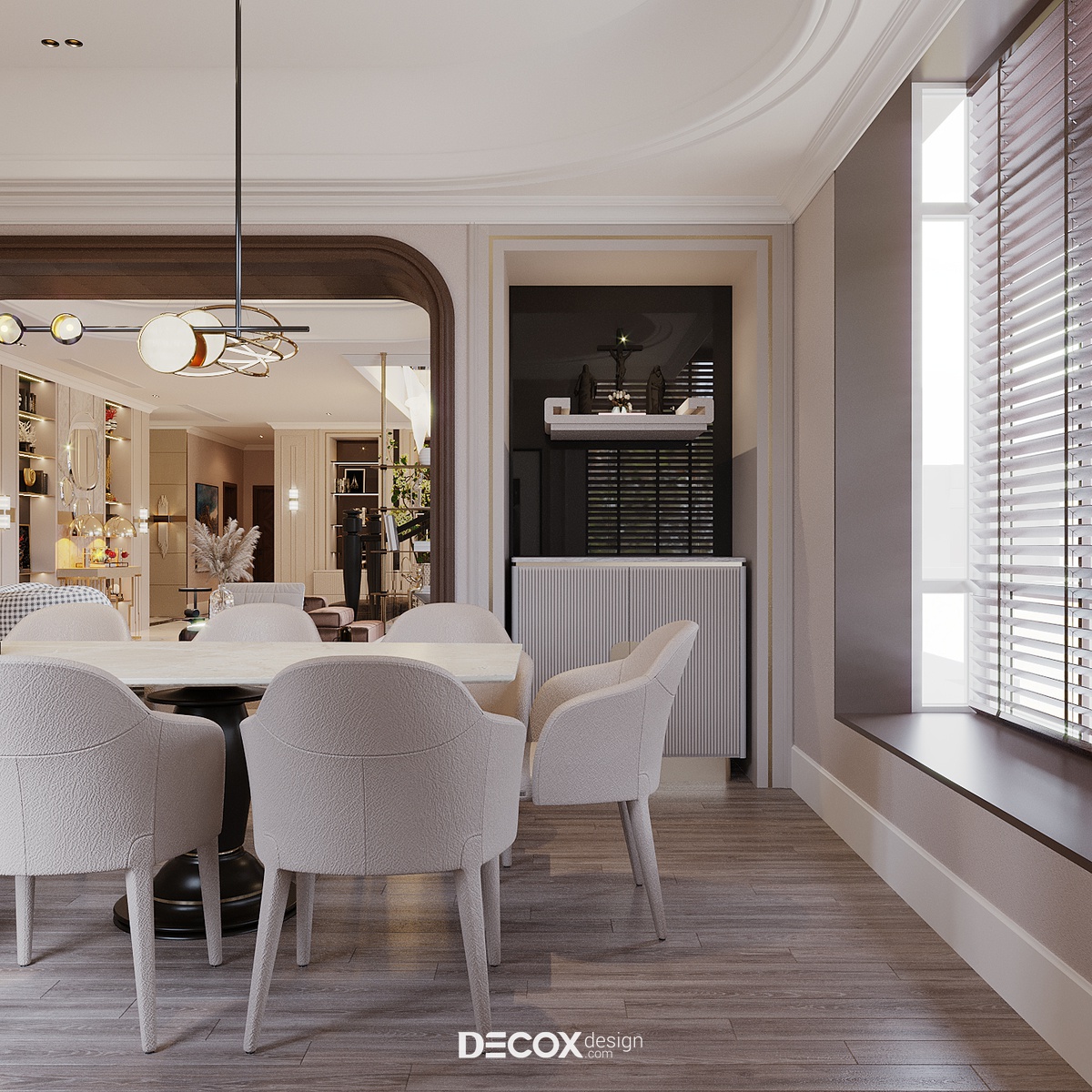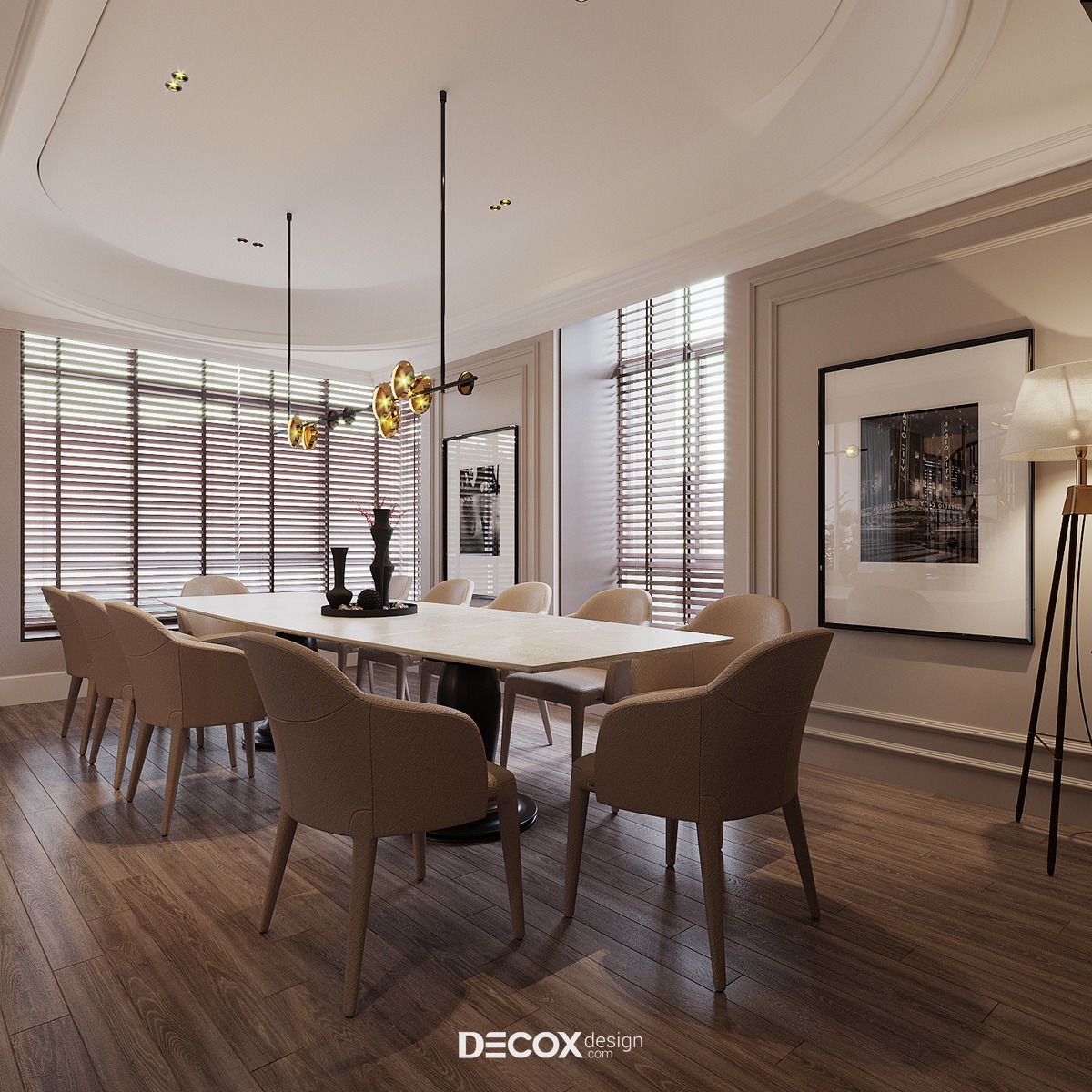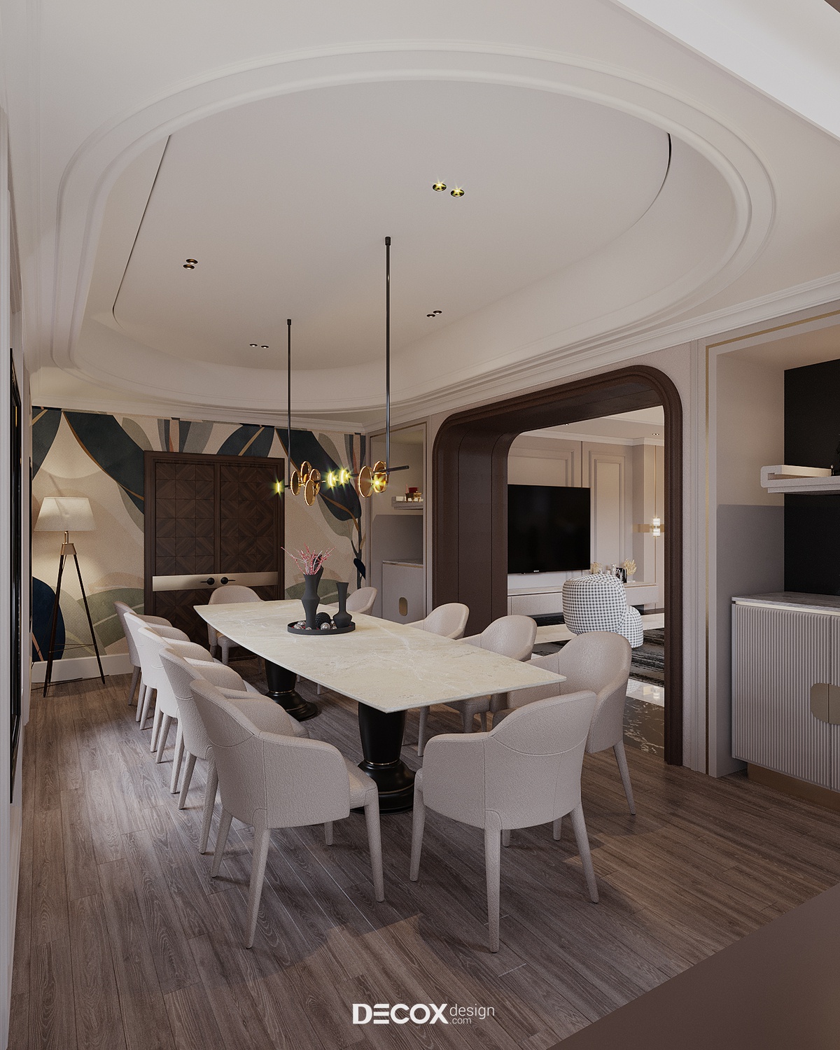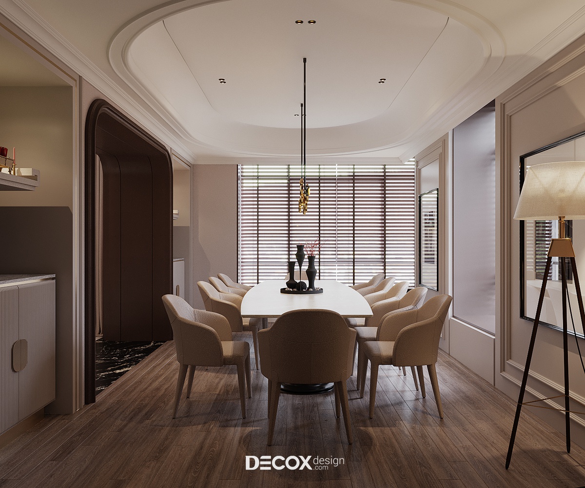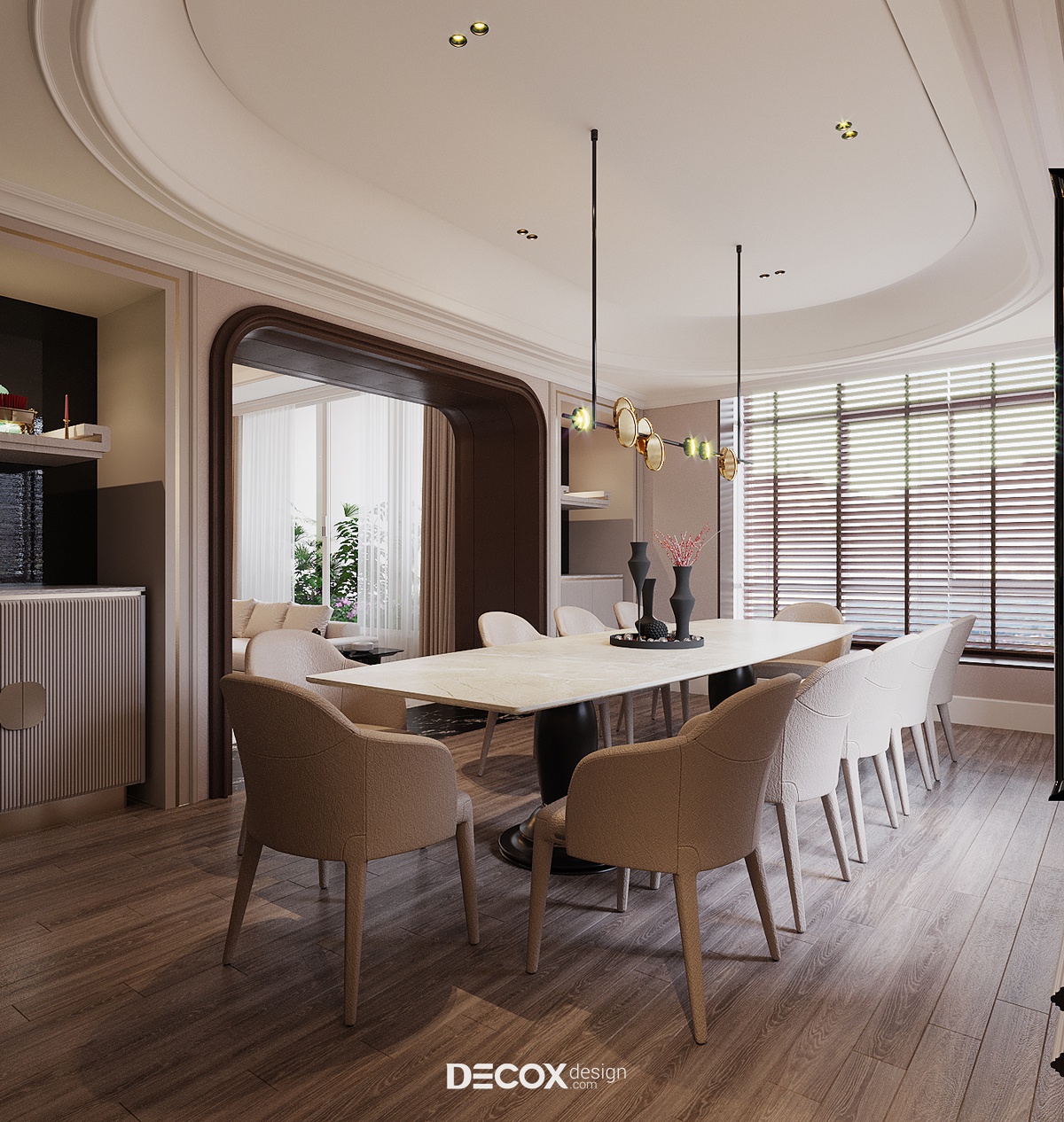 Phòng ăn được bố trí tách biệt so với các không gian còn lại nằm tạo sự ấm cúng và riêng tư cần thiết cho những bữa ăn thêm phần sum vầy và ngon miệng. Để tăng tính kết nối và giúp căn phòng luôn thông thoáng, sáng sủa thì ngoài việc tạo không gian mở với phòng khách, KTS còn bố trí thêm những tấm rèm sáo gỗ đón sáng vào phòng. Hai gam màu trắng - nâu pastel được sử dụng đồng bộ trong không gian này từ màu tường cho đến nội thất sử dụng để thể hiện tính thanh lịch, sang trọng. Đồng thời để phòng giàu chiều sâu và không đơn điệu thì nhiều phụ kiện cũng đã được bổ sung vào như đèn thả đèn cây, đèn treo hay tranh trang trí.