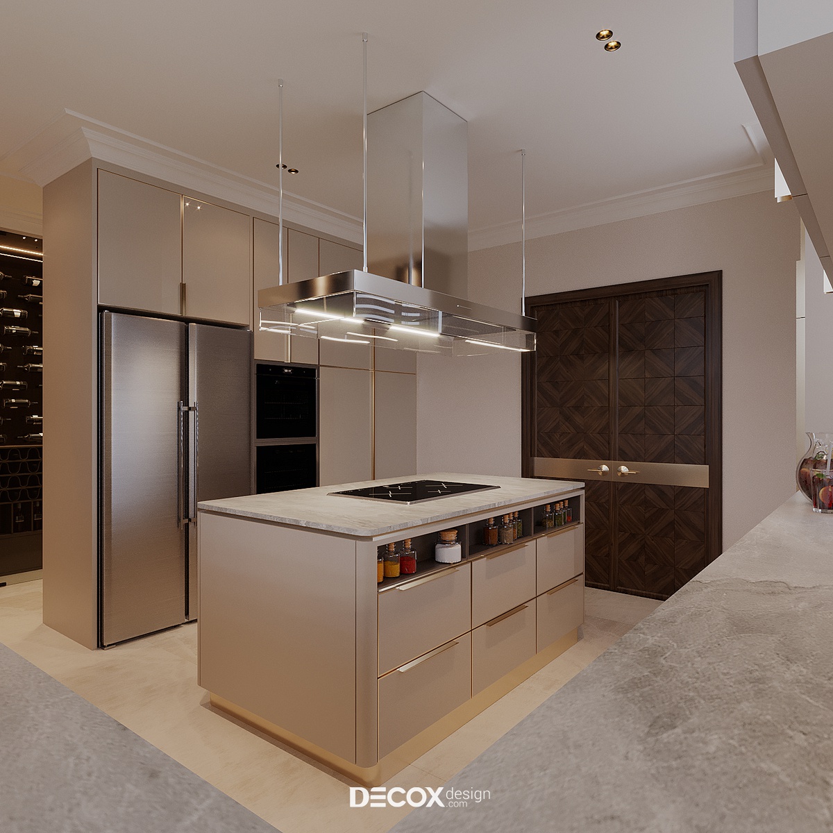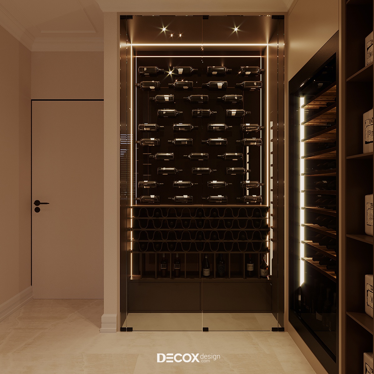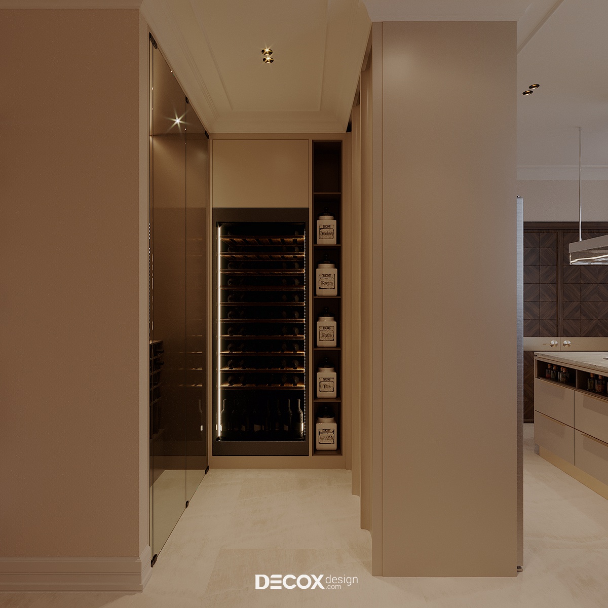 Bên cạnh hệ tủ bếp được thiết kế từ những đường nét tinh tế và có nhiều ngăn kéo lưu trữ tiện dụng thì KTS còn bổ sung thêm hầm rượu mini như một nơi lưu trữ, bảo quản và trưng bày những chai rượu quý nhằm thỏa mãn đam mê sưu tầm, thưởng thức của gia chủ.