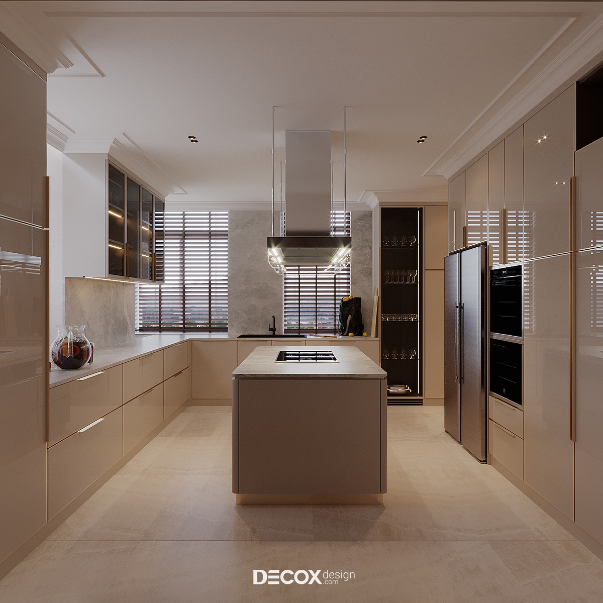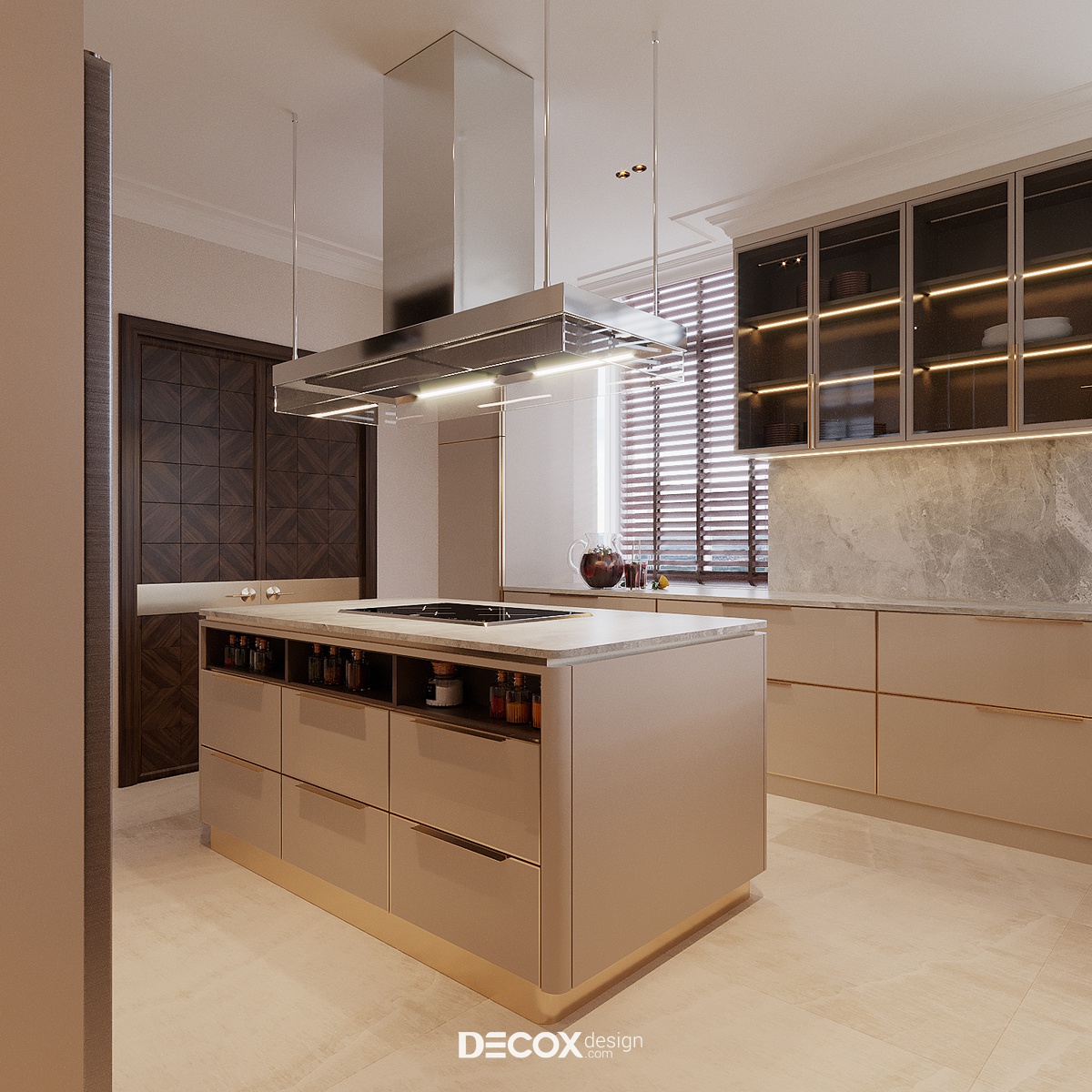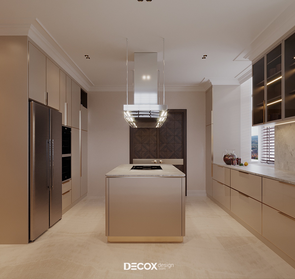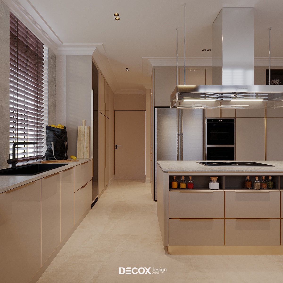 Gian bếp được thiết kế vô cùng tiện dụng với bố cục lấy bếp làm trung tâm, xung quanh là hệ thống tủ kệ, đồ gia dụng được bố trí song song, nối tiếp nhau giúp sự di chuyển và sử dụng nhà bếp trở nên khoa học, tiện nghi và thoải mái hơn. Và để nơi giữ lửa luôn được ấm cúng thì màu sắc cũng như chất liệu sử dụng luôn được lựa chọn tỉ mỉ để cho ra sự kết hợp hoàn hảo nhất. Điển hình chính là những ánh đèn led vàng hắt điểm ở những khu vực quan trọng vừa có tác dụng nhấn điểm vừa tạo cảm giác nhẹ nhàng, dễ chịu cho người sử dụng.