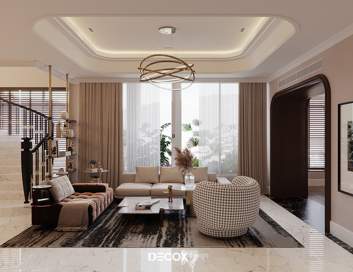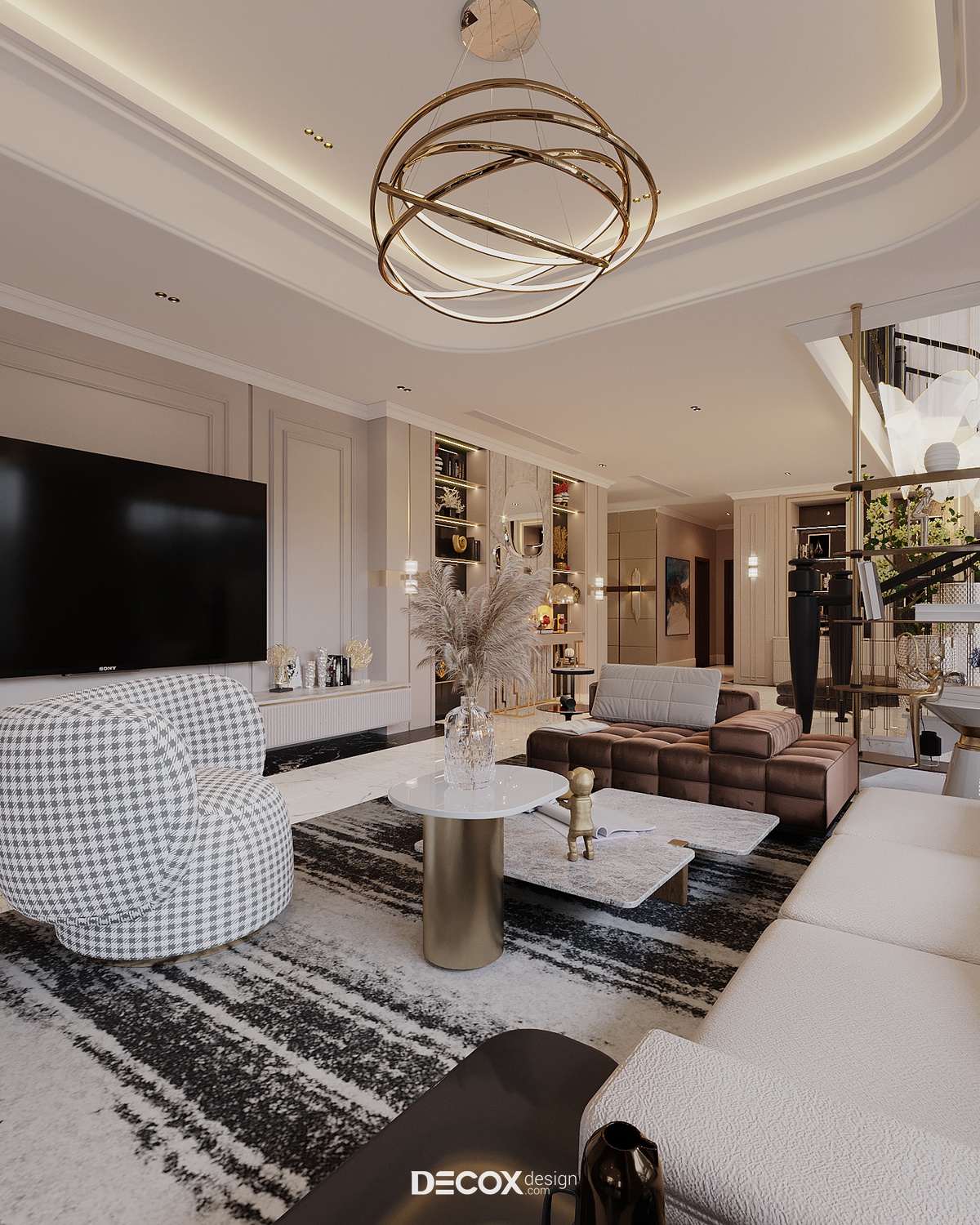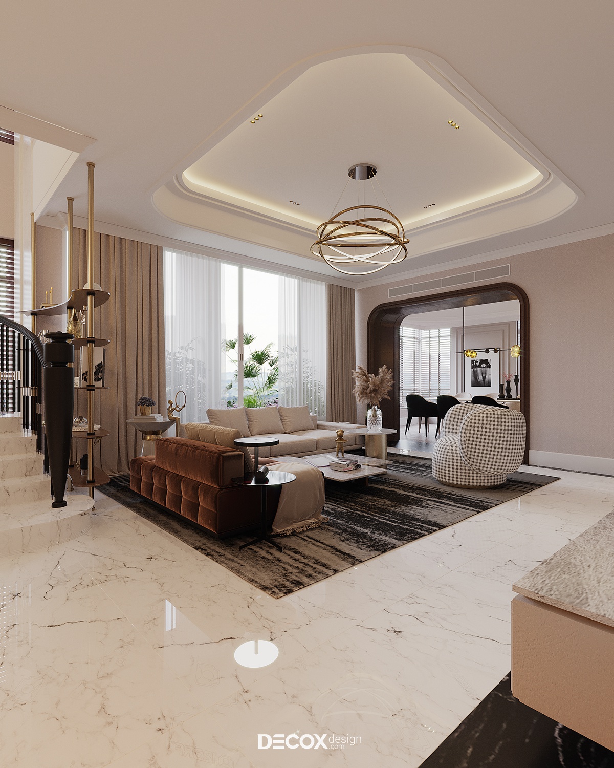 Ở phần còn lại của cầu thang, tiếp giáp với sảnh chờ chính là phòng khách - khu vực trung tâm của căn hộ. Mỗi một chi tiết bên trong không gian phòng khách đều được hình thành dựa trên đường nét đơn giản, mảnh dẻ cùng chất liệu hiện đại đặc trưng nhằm mang đến cảm quan về sự sang trọng nhưng cũng không kém phần thoải mái và dễ chịu. Khi nhìn vào bộ sofa phòng khách bạn sẽ cảm nhận được sự chi li, kỳ công để tạo ấn tượng khi ghép nối những kiểu dáng khác nhau một cách đầy ngẫu hứng. Từ băng ghế 3 chỗ ngồi hiện đại sử dụng tone trắng ngà tinh tế đồng bộ với gam màu chủ đạo của nhà, sofa dập múi tone nâu trầm đậm chất classic cùng chiếc ghế armchair sọc caro thời thượng, tất cả những chi tiết ấy khi kết hợp cùng nhau đã tạo nên một không gian trẻ trung và giàu cảm hứng. Ngoài ra, chất liệu ánh kim có tính phản chiếu như đèn thả trần mạ vàng hay kệ trang trí đơn giản phân tách không gian khách - cầu thang cũng được vận dụng tốt nhằm mang đến sự bắt mắt, sang trọng cho không gian.