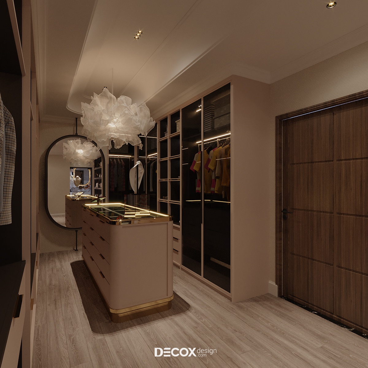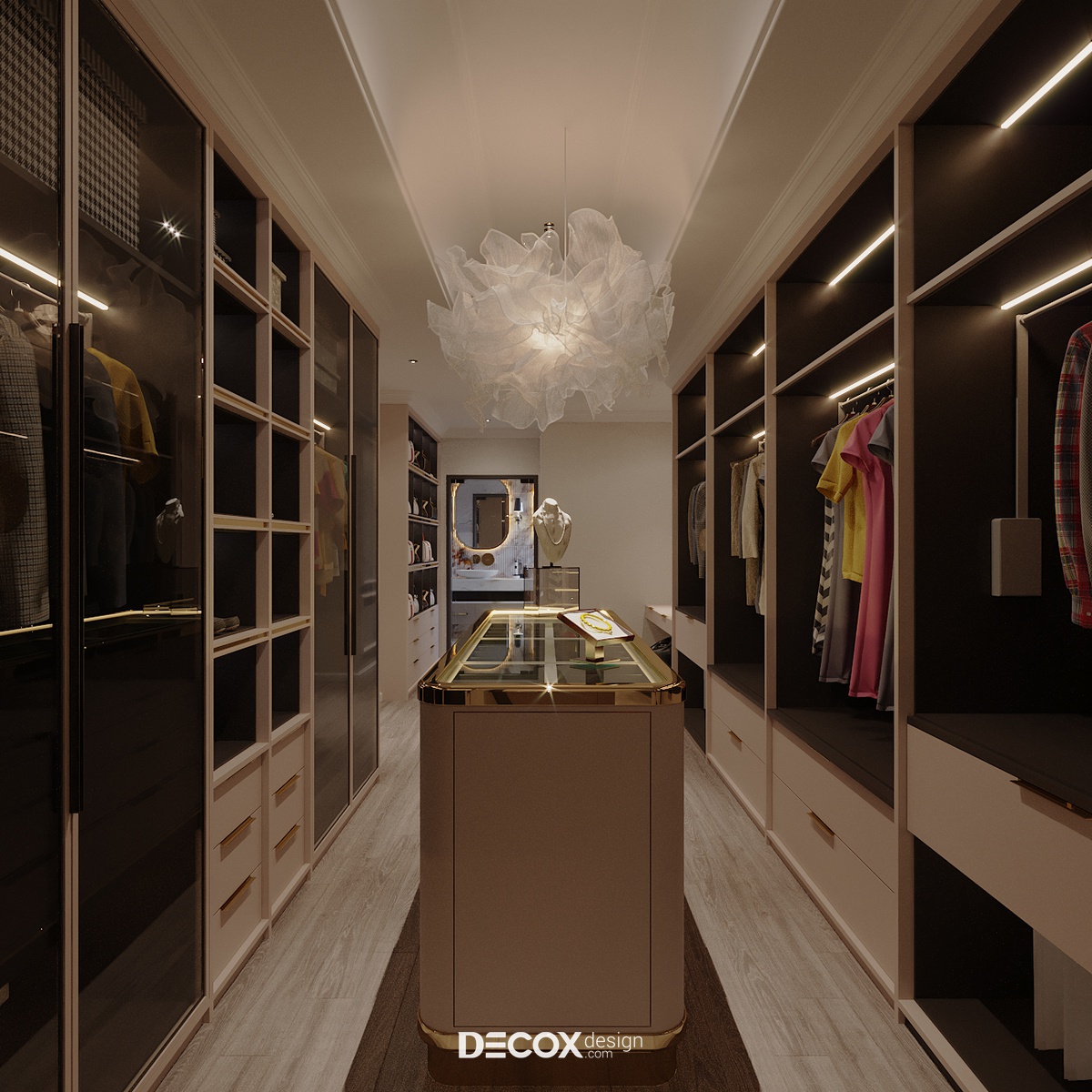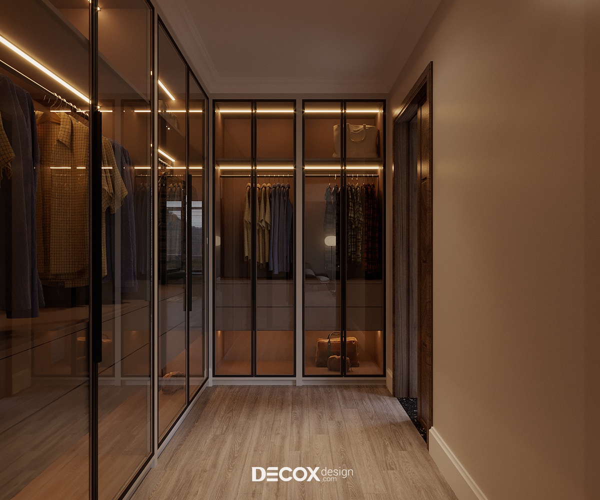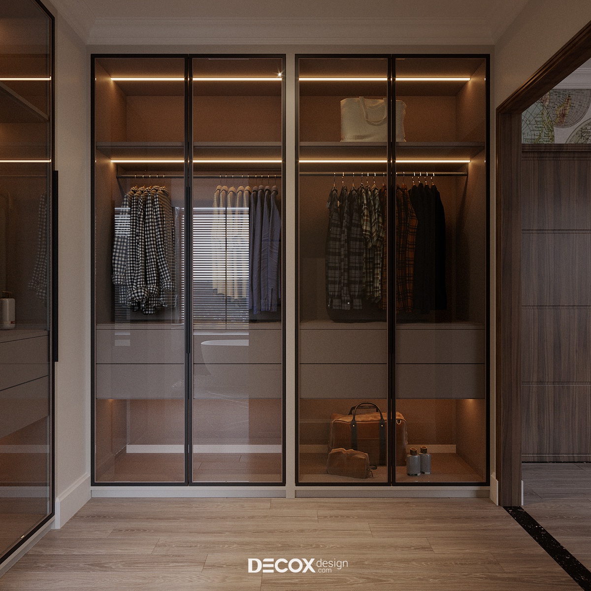 Tuy được tích hợp chung bên trong không gian phòng ngủ master thế nhưng phòng thay đồ vẫn đảm bảo được tính riêng tư cực kỳ cao khi được thiết kế khép kín với cửa gỗ vững chắc. Với phương án bố trí trục giữa là bàn đảo phụ kiện, gương soi, hai bên là 2 dãy tủ quần áo, giày dép giúp không gian được tiện dụng và sành điệu hơn. Hệ tủ quần áo với thiết kế cửa kính trượt tích hợp giá treo tiện dụng cùng đèn hắt trang trí ấm cúng sẽ là nơi lưu trữ giúp những bộ cánh luôn thẳng tắp, đúng form và ngăn nắp, tiện lợi trong quá trình chọn lựa. Bên dưới là những ngăn kéo, vừa cung cấp thêm không gian lưu trữ vừa giúp bạn linh hoạt hơn trong việc phân loại, sắp xếp đồ dùng.