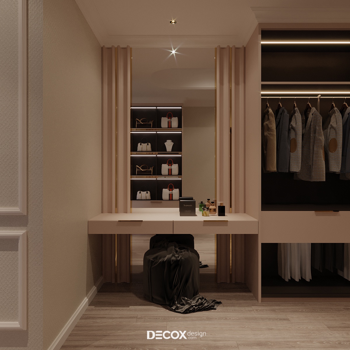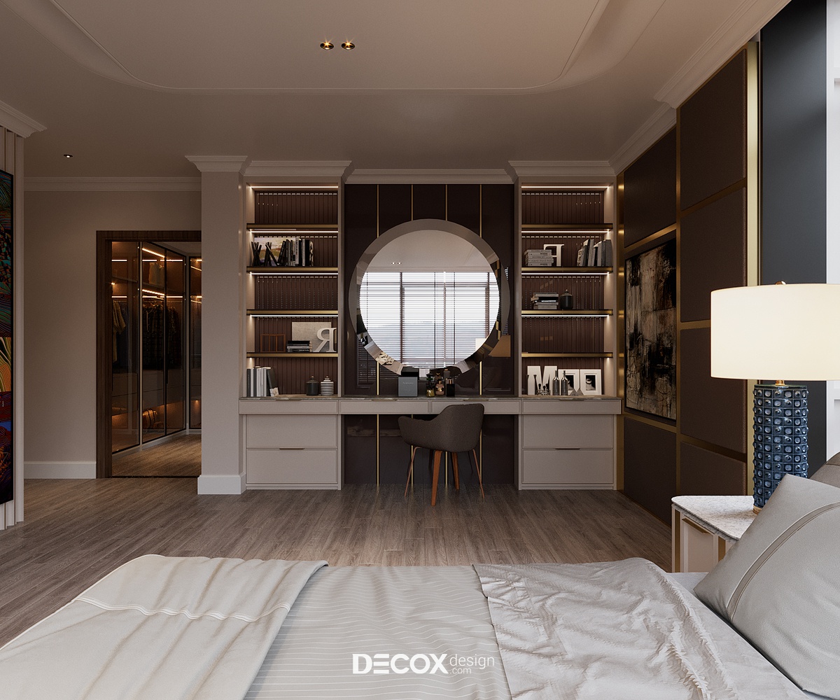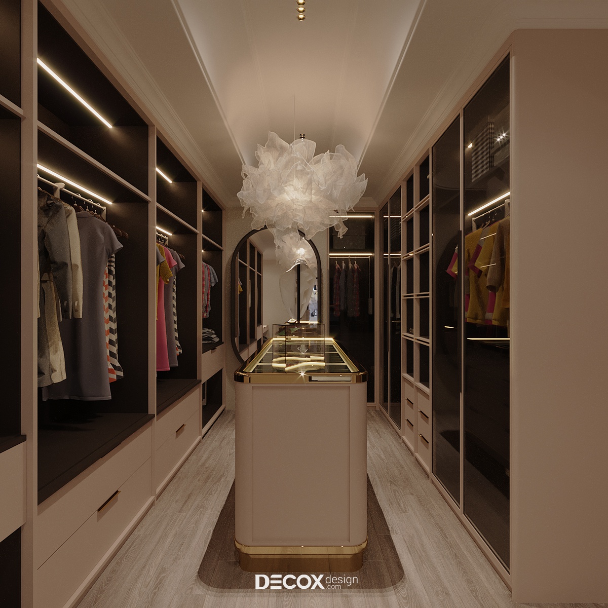 Tuy được tích hợp chung bên trong không gian phòng ngủ master thế nhưng phòng thay đồ vẫn đảm bảo được tính riêng tư cực kỳ cao khi được thiết kế khép kín với cửa gỗ vững chắc. Với phương án bố trí trục giữa là bàn đảo phụ kiện, gương soi, hai bên là 2 dãy tủ quần áo, giày dép giúp không gian được tiện dụng và sành điệu hơn. Hệ tủ quần áo với thiết kế cửa kính trượt tích hợp giá treo tiện dụng cùng đèn hắt trang trí ấm cúng sẽ là nơi lưu trữ giúp những bộ cánh luôn thẳng tắp, đúng form và ngăn nắp, tiện lợi trong quá trình chọn lựa. Bên dưới là những ngăn kéo, vừa cung cấp thêm không gian lưu trữ vừa giúp bạn linh hoạt hơn trong việc phân loại, sắp xếp đồ dùng.