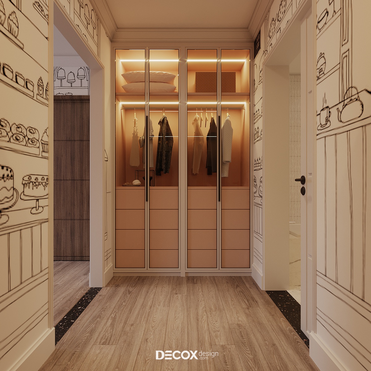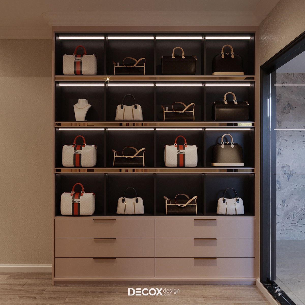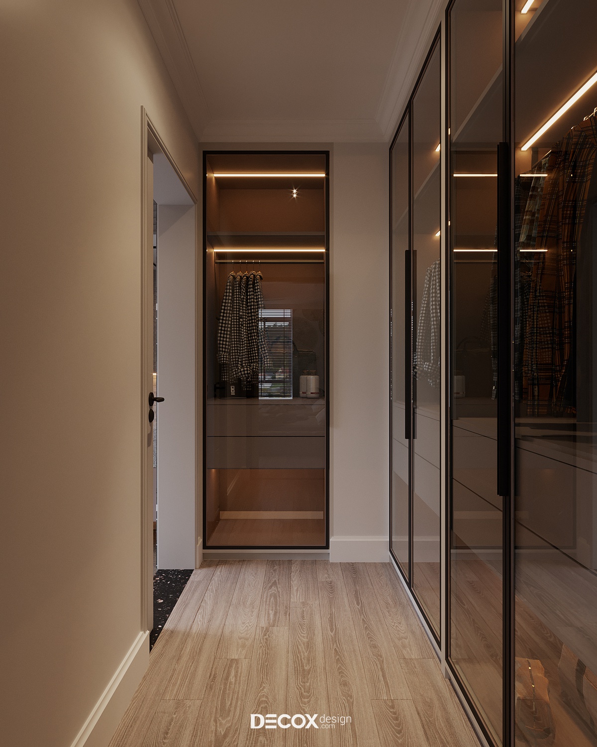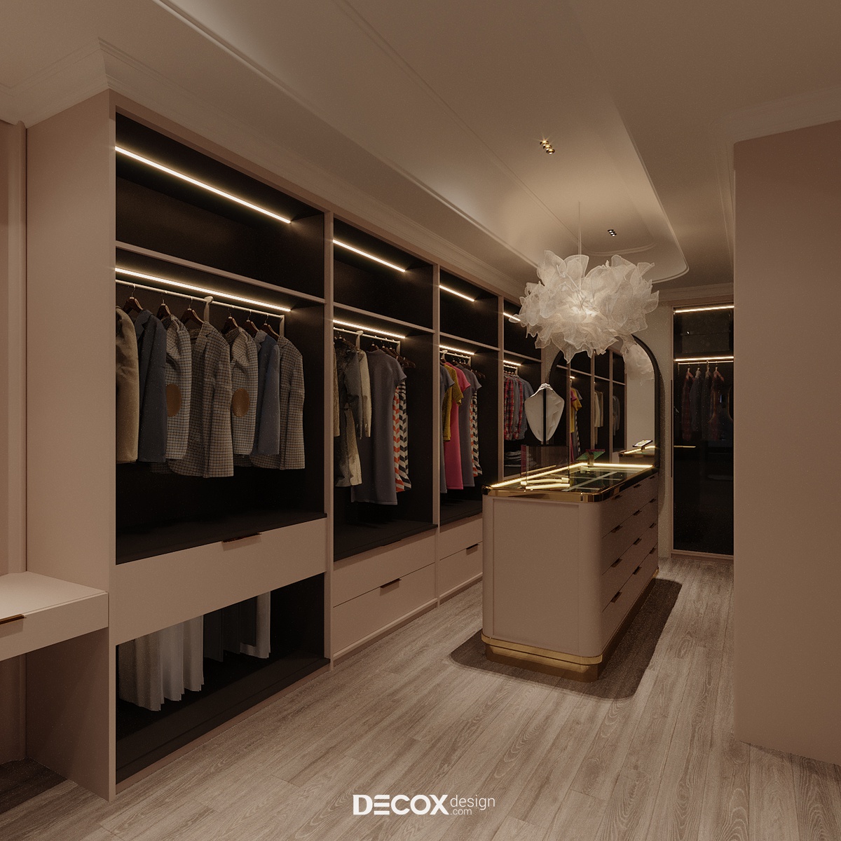 Tuy được tích hợp chung bên trong không gian phòng ngủ master thế nhưng phòng thay đồ vẫn đảm bảo được tính riêng tư cực kỳ cao khi được thiết kế khép kín với cửa gỗ vững chắc. Với phương án bố trí trục giữa là bàn đảo phụ kiện, gương soi, hai bên là 2 dãy tủ quần áo, giày dép giúp không gian được tiện dụng và sành điệu hơn. Hệ tủ quần áo với thiết kế cửa kính trượt tích hợp giá treo tiện dụng cùng đèn hắt trang trí ấm cúng sẽ là nơi lưu trữ giúp những bộ cánh luôn thẳng tắp, đúng form và ngăn nắp, tiện lợi trong quá trình chọn lựa. Bên dưới là những ngăn kéo, vừa cung cấp thêm không gian lưu trữ vừa giúp bạn linh hoạt hơn trong việc phân loại, sắp xếp đồ dùng.