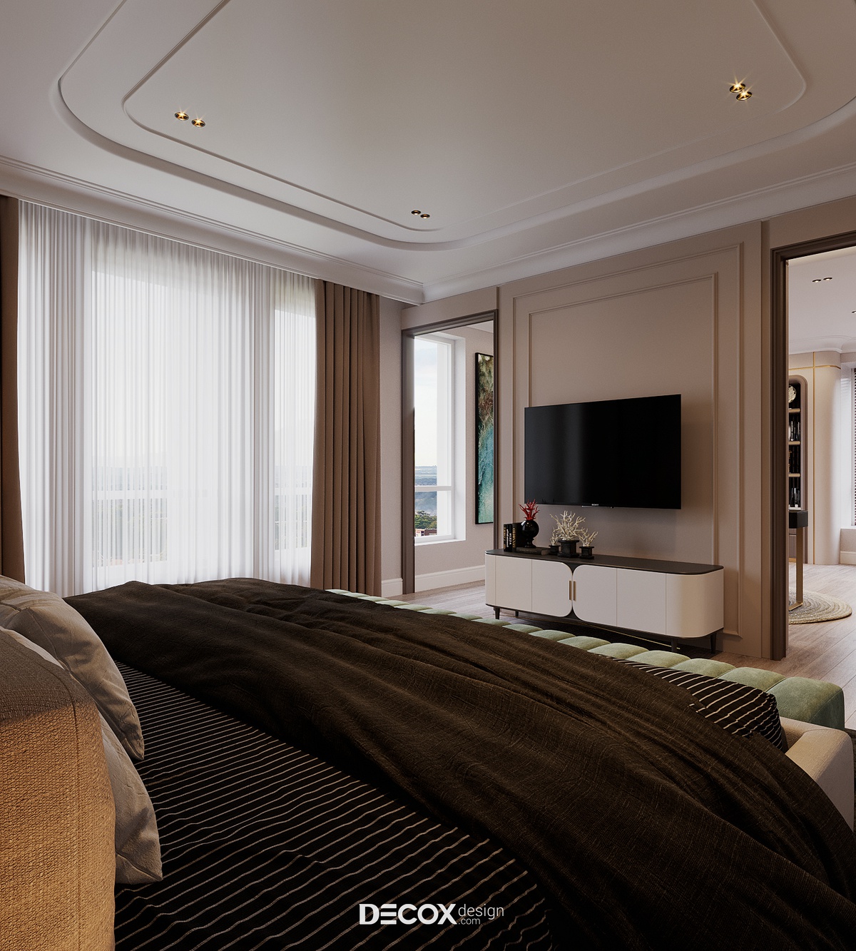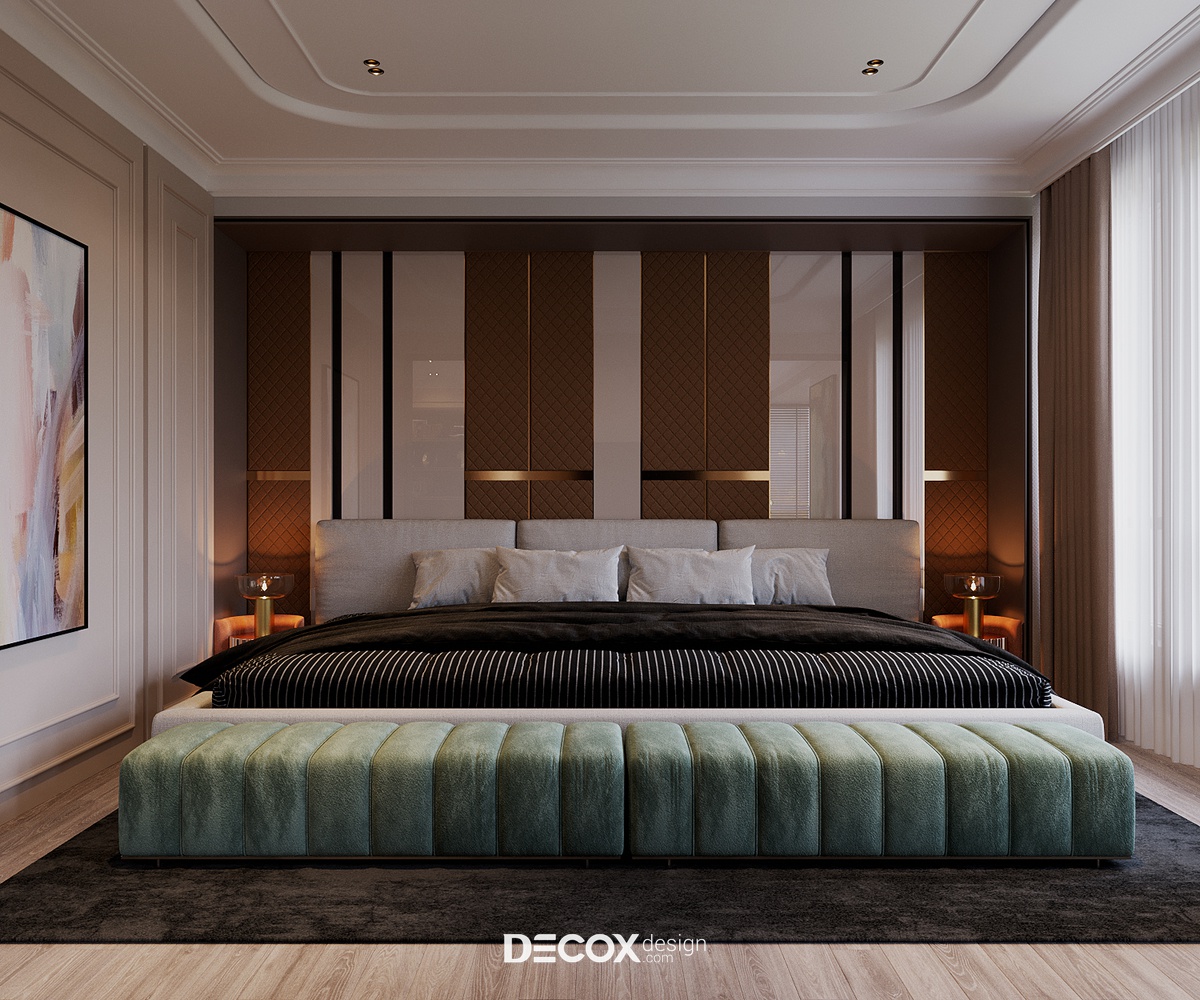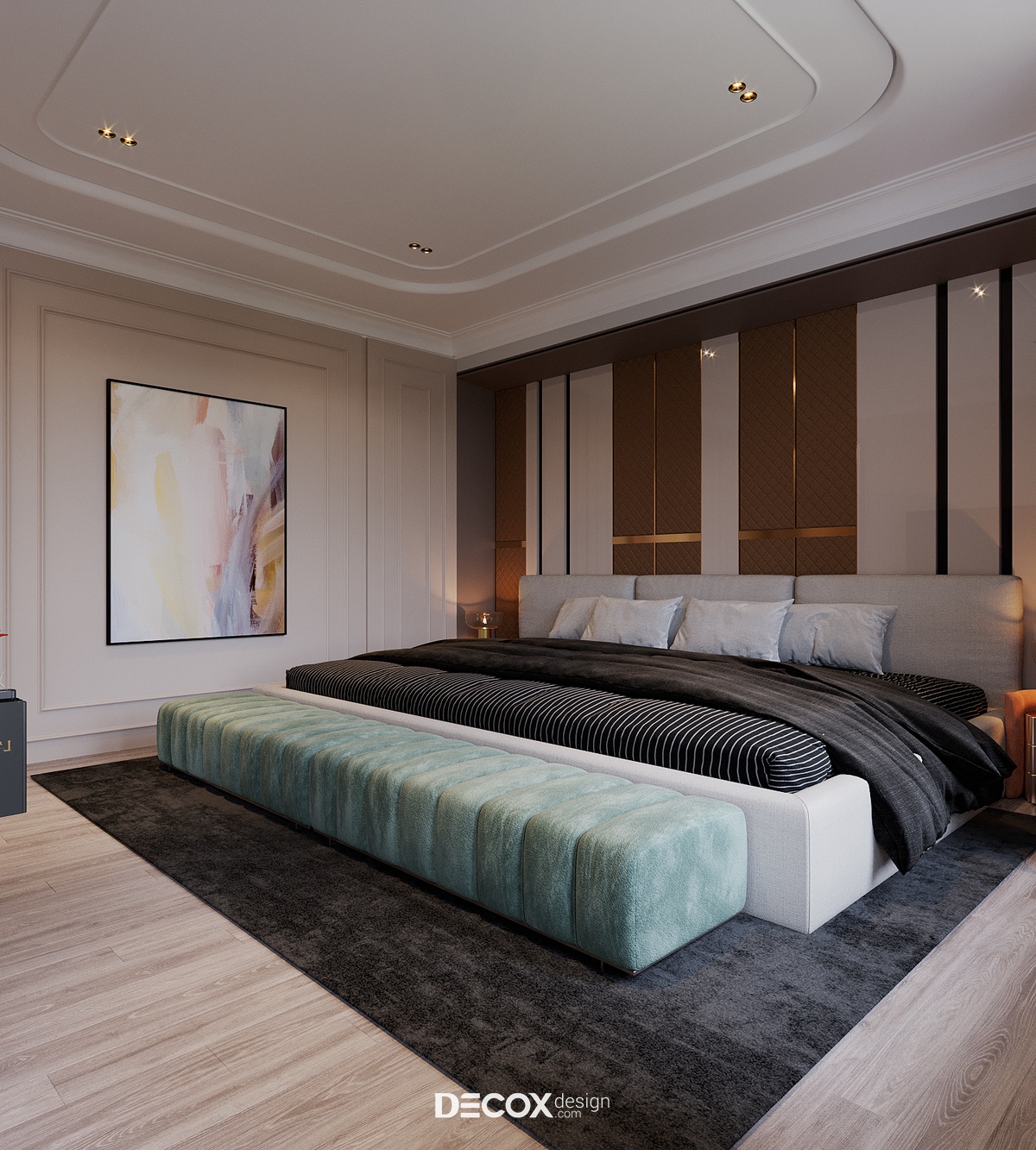 Đóng vai trò là không gian riêng tư của gia chủ nên ngoài yếu tố tiện nghi, phục vụ đầy đủ nhu cầu sử dụng thì việc trang hoàng không gian “vương giả” cũng không kém phần quan trọng. Để thực hiện điều đó, phòng cần có diện tích đủ lớn để phát triển thêm các khu vực chức năng khác như: phòng làm việc, nơi đọc sách - thư giãn, phòng trang điểm, phòng thay đồ và WC tiện nghi. Không gian nghỉ ngơi được “lấp đầy” bởi chiếc giường ngủ bệt có kích thước lý tưởng cùng tủ đầu giường, kệ tivi và tranh trang trí. Tuy không có quá nhiều nội thất hay chi tiết trang trí nhưng khu vực chức năng chính của phòng vẫn giữ nguyên được sự cao cấp, đảm bảo tính thoải mái cần thiết thông qua những chất liệu sang trọng, nội thất cao cấp cùng đường nét tỉ mỉ.
