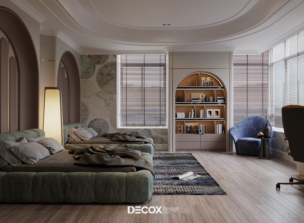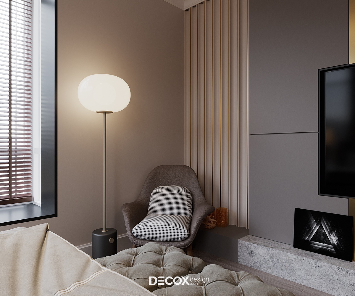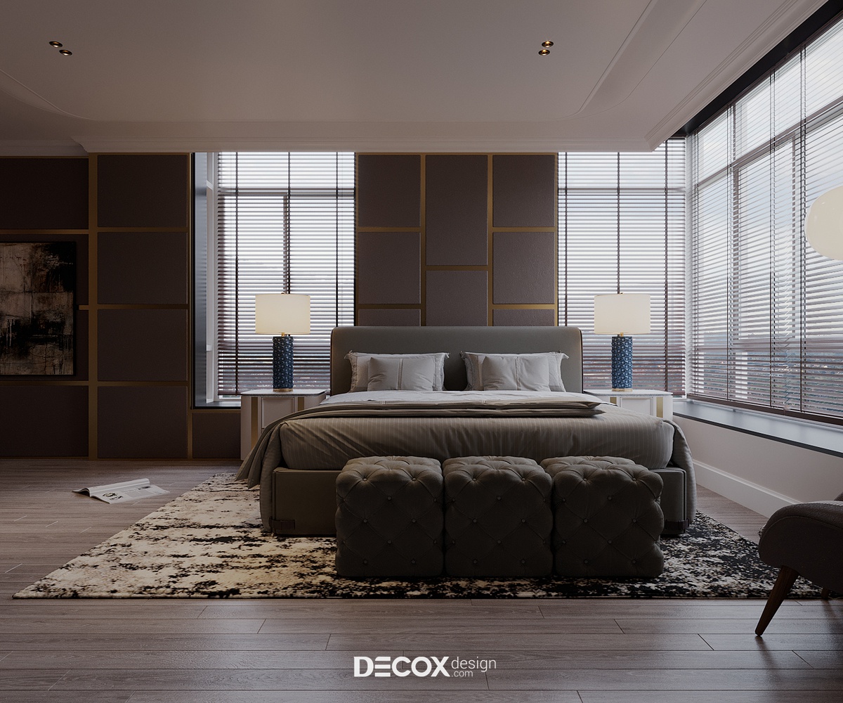 Đóng vai trò là không gian riêng tư của gia chủ nên ngoài yếu tố tiện nghi, phục vụ đầy đủ nhu cầu sử dụng thì việc trang hoàng không gian “vương giả” cũng không kém phần quan trọng. Để thực hiện điều đó, phòng cần có diện tích đủ lớn để phát triển thêm các khu vực chức năng khác như: phòng làm việc, nơi đọc sách - thư giãn, phòng trang điểm, phòng thay đồ và WC tiện nghi. Không gian nghỉ ngơi được “lấp đầy” bởi chiếc giường ngủ bệt có kích thước lý tưởng cùng tủ đầu giường, kệ tivi và tranh trang trí. Tuy không có quá nhiều nội thất hay chi tiết trang trí nhưng khu vực chức năng chính của phòng vẫn giữ nguyên được sự cao cấp, đảm bảo tính thoải mái cần thiết thông qua những chất liệu sang trọng, nội thất cao cấp cùng đường nét tỉ mỉ.