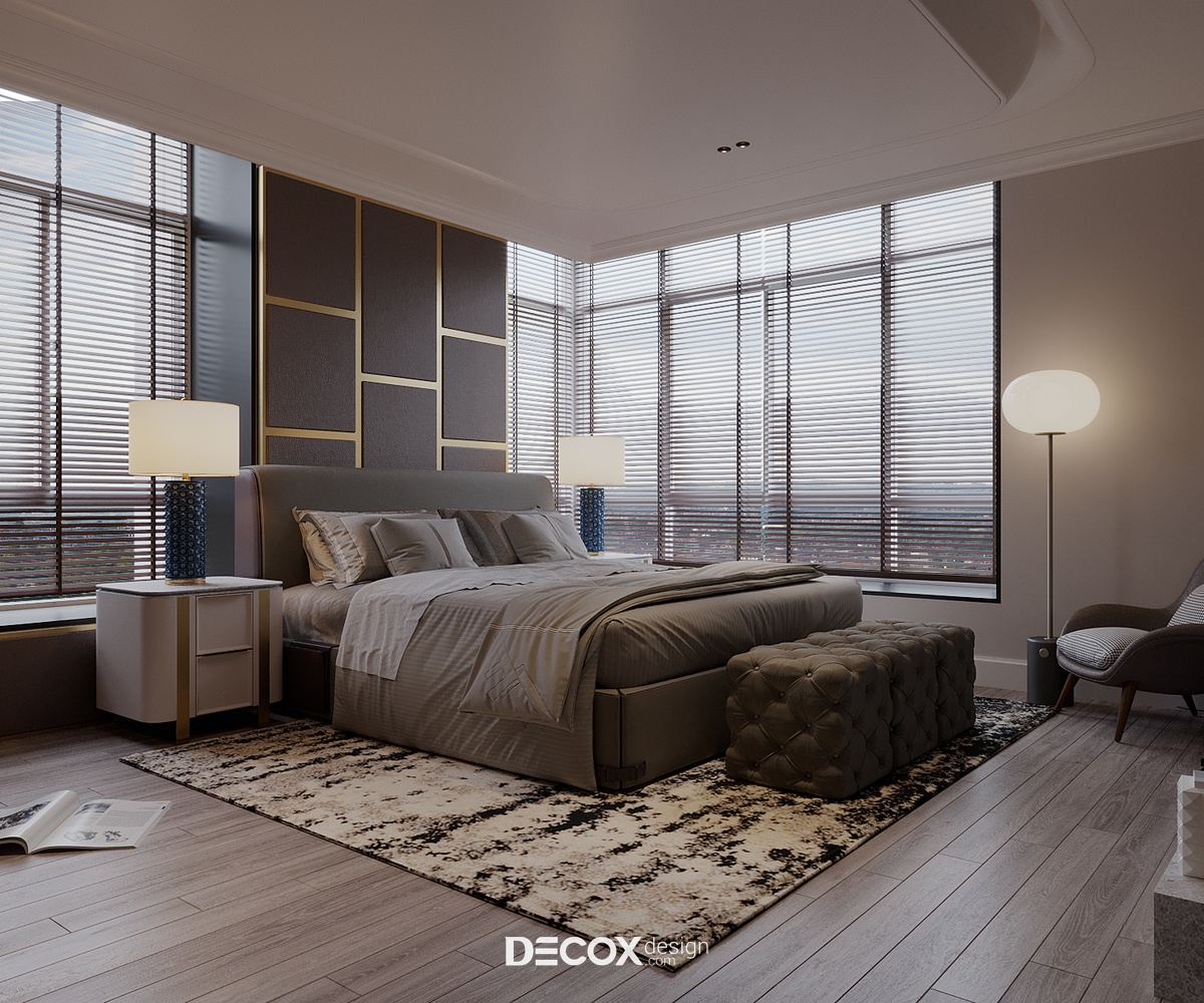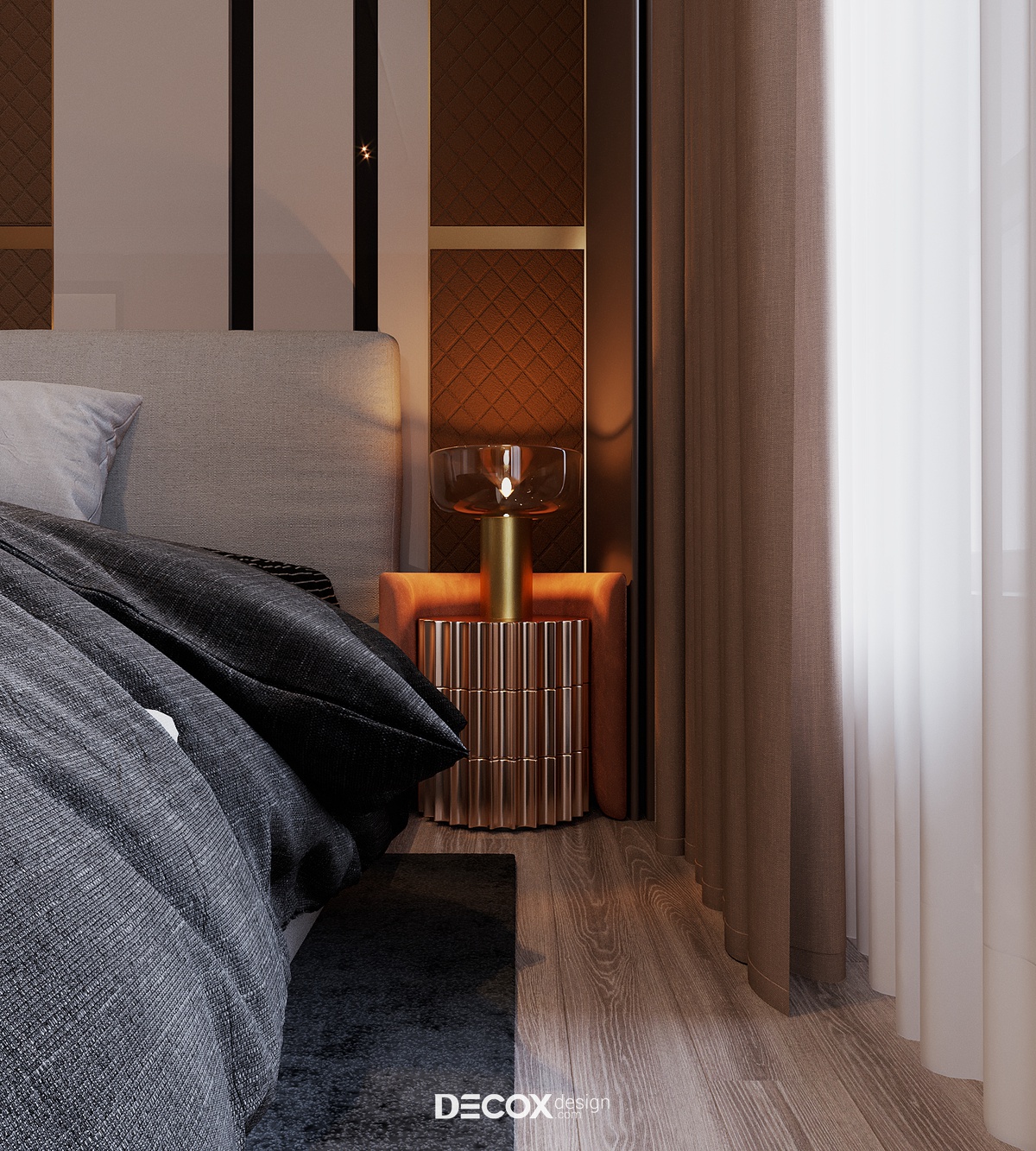 Trong không gian tầng một của dự án thiết kế nội thất căn hộ Penthouse này, ngoài những khu vực sinh hoạt chung như phòng khách, bếp, phòng ăn hay phòng giải trí, Decox còn bố trí thêm khu vực phòng ngủ cho khách. Cách bố cục như thế này vừa đảm bảo cho việc sinh hoạt của những vị khách quý đồng thời đảm bảo tính riêng tư của các thành viên trong gia đình ở phía trên tầng hai. Phòng được thiết kế theo phong cách hiện đại kết hợp luxury, đúng theo tinh thần phong cách chung của cả căn hộ. Ngoài nội thất cao cấp, không gian rộng mở, thoáng đãng với tầm view tuyệt đẹp, phòng còn tích hợp thêm những khu vực chức năng như góc đọc sách thư giãn, bàn trang điểm, phòng thay đồ và phòng tắm hiện đại, tiện nghi.