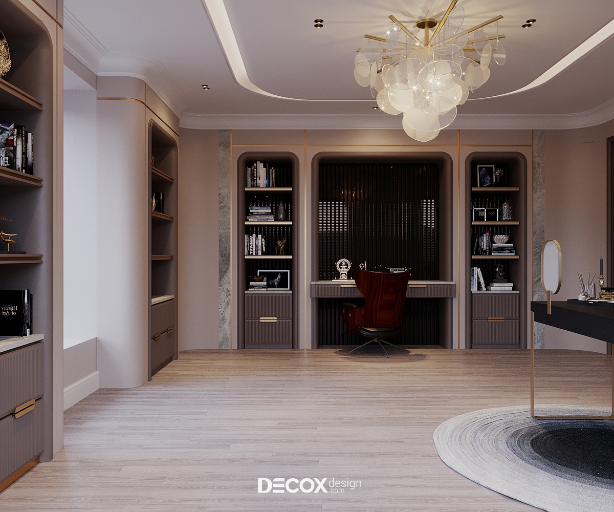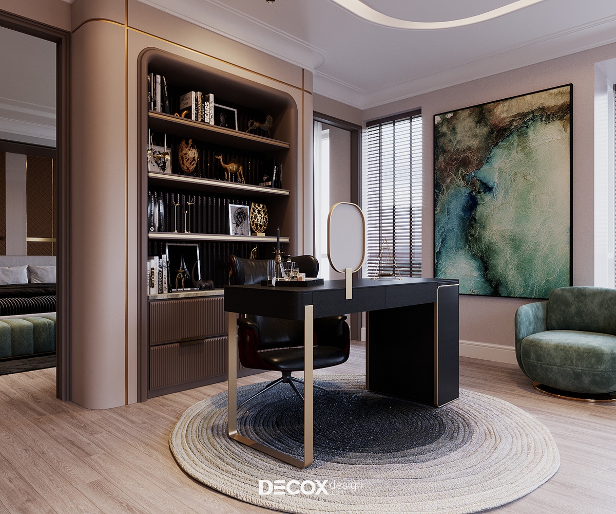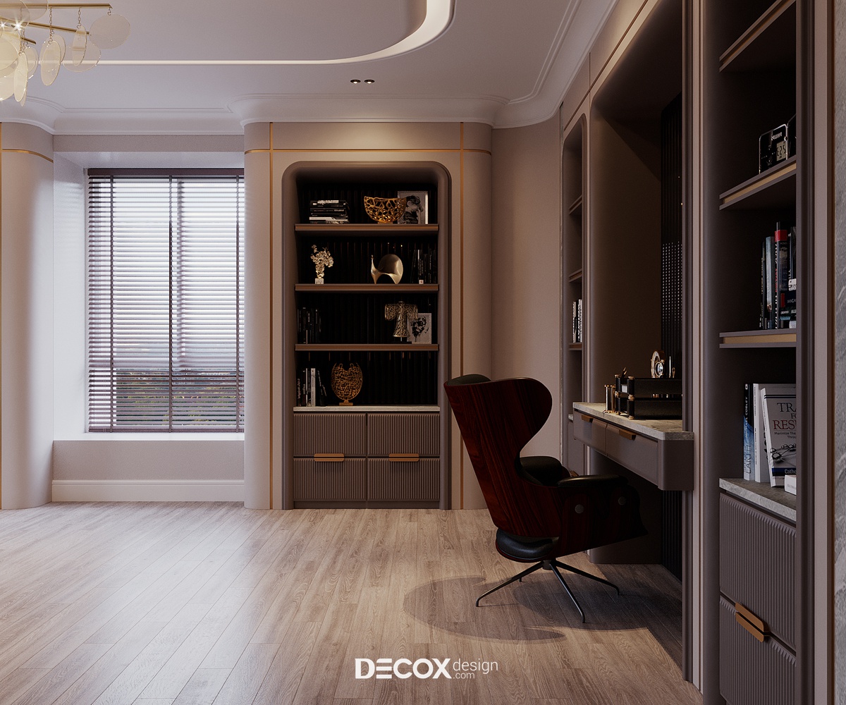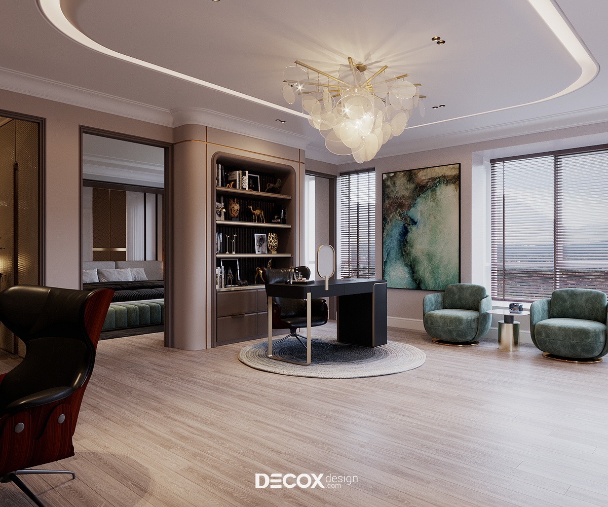 Ra khỏi khu vực nghỉ ngơi là một không gian rộng rãi tích hợp nhiều khu vực chức năng nhỏ như bàn làm việc, bộ ghế đôn kê cạnh cửa sổ cung cấp nơi thưởng trà, đọc sách hay ngắm nhìn thành phố tấp nập và khu vực bàn trang điểm. Không gian này được kiến tạo dựa trên nền tảng phục vụ theo đúng mục đích sử dụng của gia chủ nhưng không xa rời tính tiện nghi, cân đối và yếu tố rộng rãi, thoáng đãng của không gian.