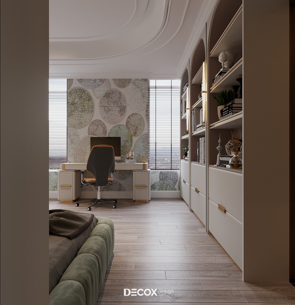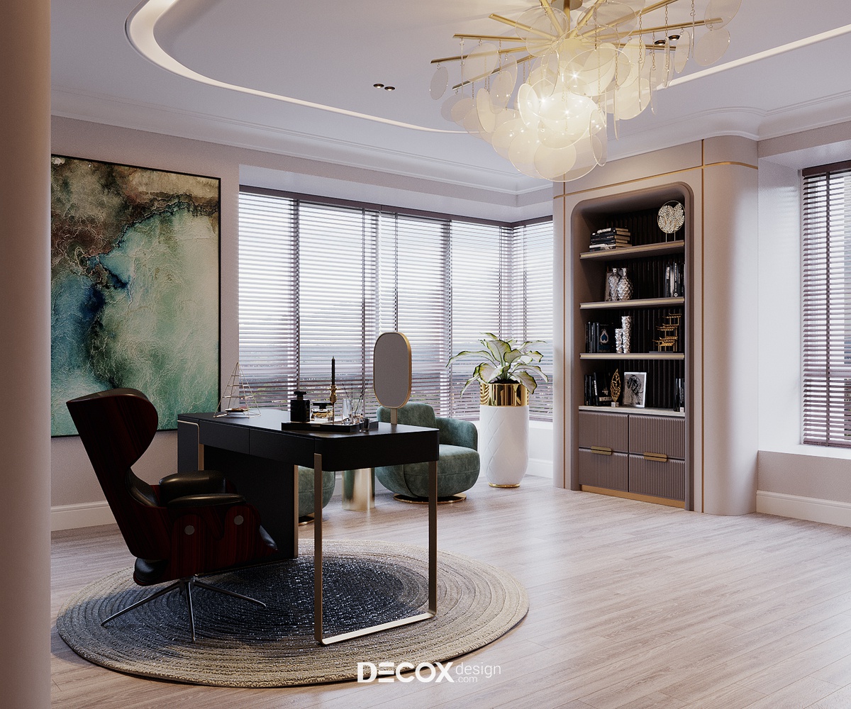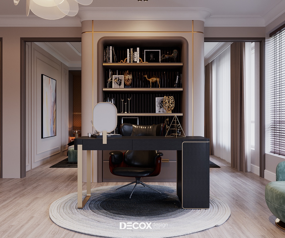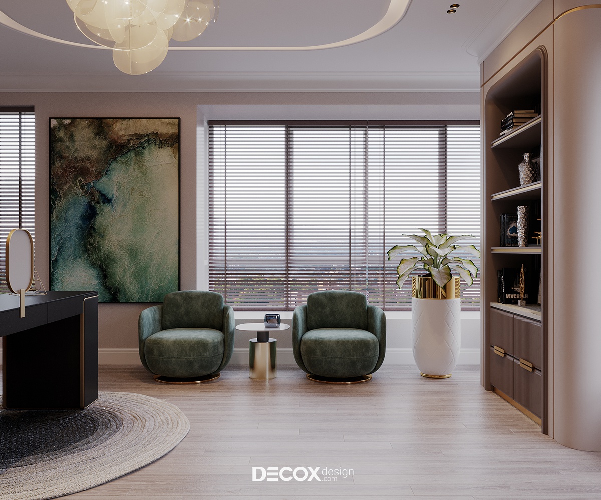 Ra khỏi khu vực nghỉ ngơi là một không gian rộng rãi tích hợp nhiều khu vực chức năng nhỏ như bàn làm việc, bộ ghế đôn kê cạnh cửa sổ cung cấp nơi thưởng trà, đọc sách hay ngắm nhìn thành phố tấp nập và khu vực bàn trang điểm. Không gian này được kiến tạo dựa trên nền tảng phục vụ theo đúng mục đích sử dụng của gia chủ nhưng không xa rời tính tiện nghi, cân đối và yếu tố rộng rãi, thoáng đãng của không gian.