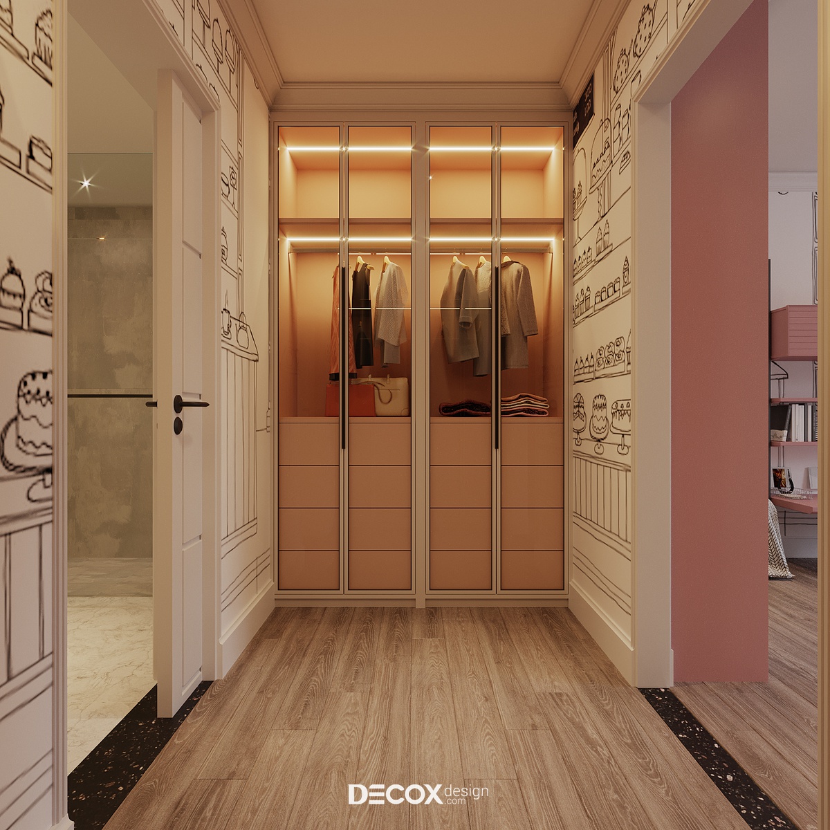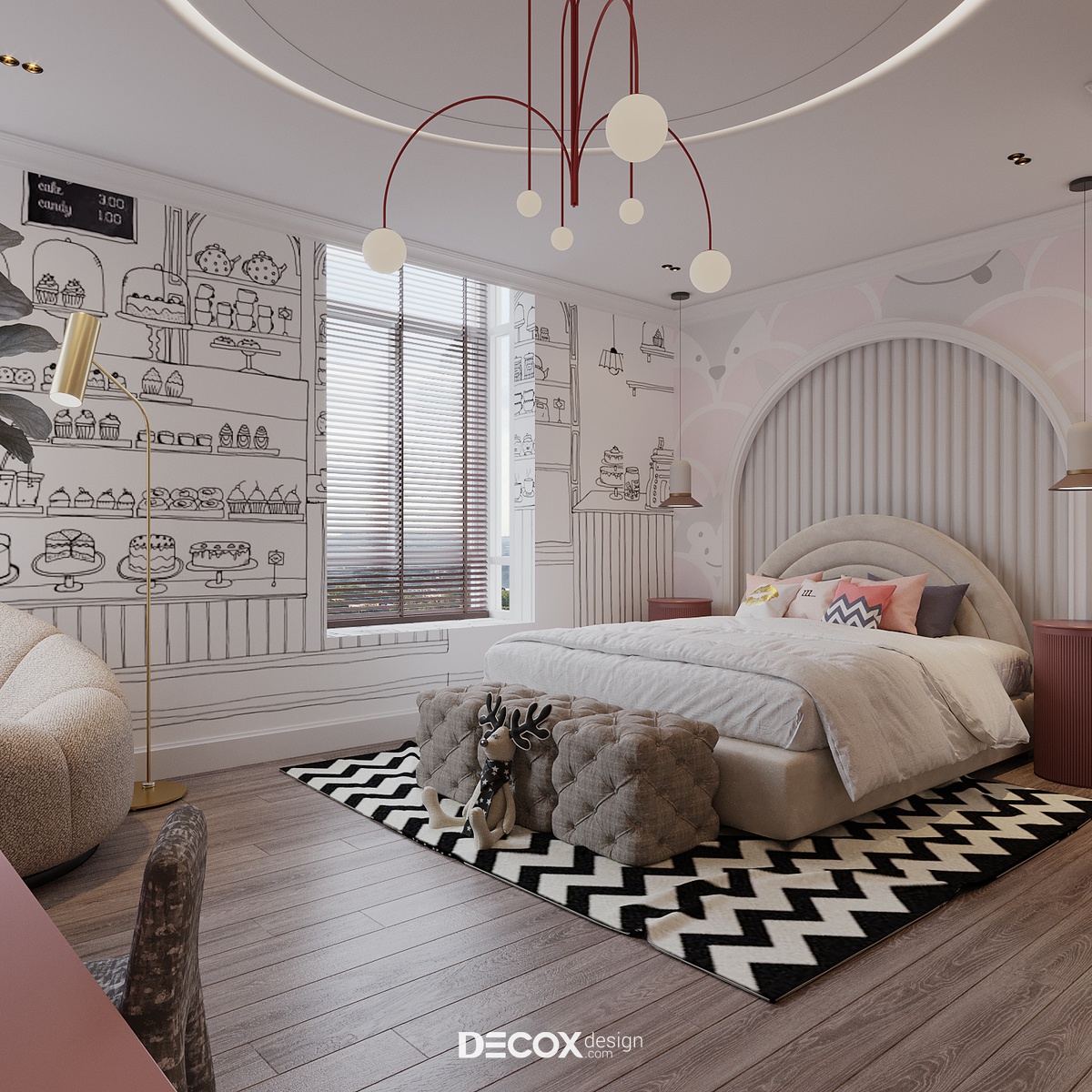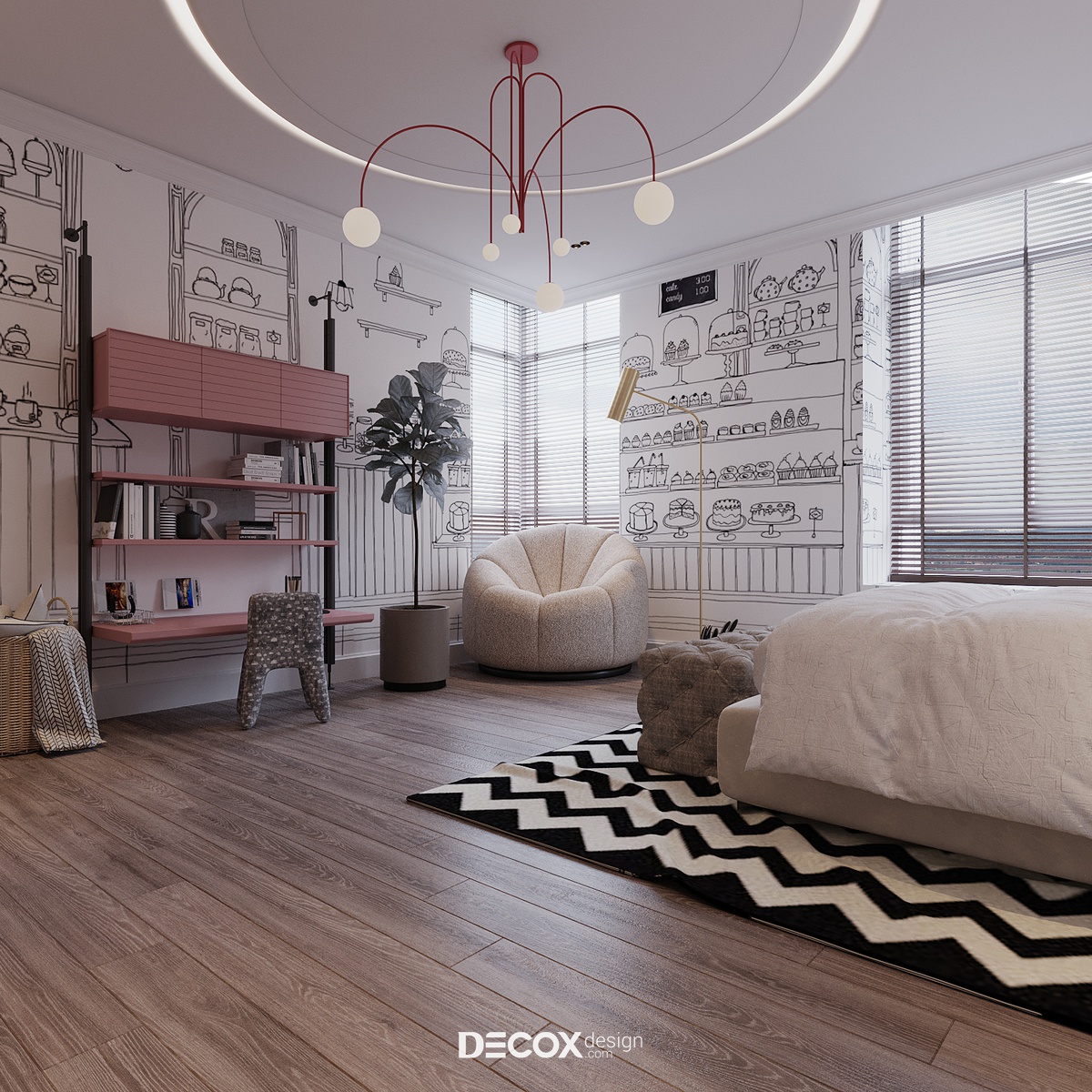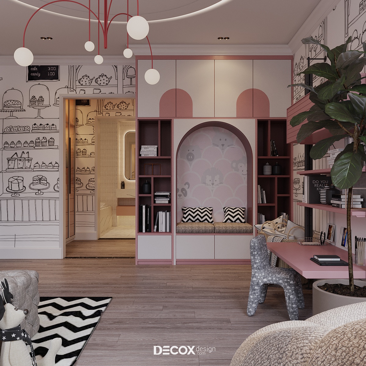 Nhằm đem đến một không gian rộng rãi, thoáng đãng cho bé có thể vừa học vừa chơi, nghỉ ngơi và thư giãn đúng với độ tuổi và sở thích của mình, các KTS đã chọn tone màu trắng chủ đạo điểm xuyết thêm sắc hồng pastel ngọt ngào nhấn điểm trong phòng ngủ dành cho cô công chúa nhỏ của gia đình. Để che lấp những bức tường trống trải, đơn điệu, tăng thêm nét ngộ nghĩnh, dễ thương đồng thời khơi gợi hứng thú ở trẻ KTS đã lựa chọn phương án sử dụng giấy dán tường họa tiết đen trắng ở tất cả các mặt tường từ không gian nghỉ ngơi cho đến phòng thay đồ. Với khu vực nhà vệ sinh, việc ốp lát tường bằng gạch thẻ gam hồng không chỉ mang tính chất đồng bộ không gian mà còn tiện lợi trong việc lau dọn và vệ sinh.