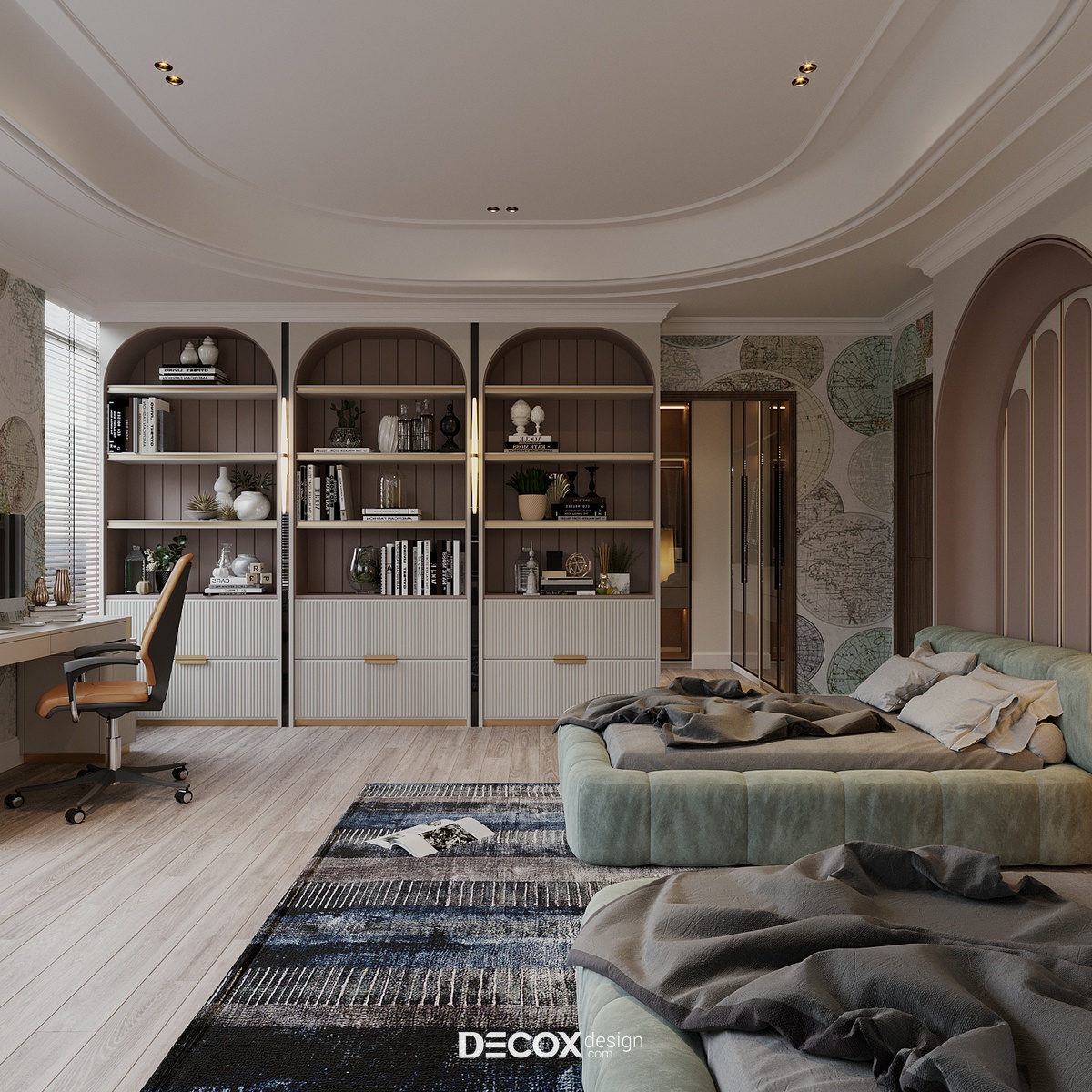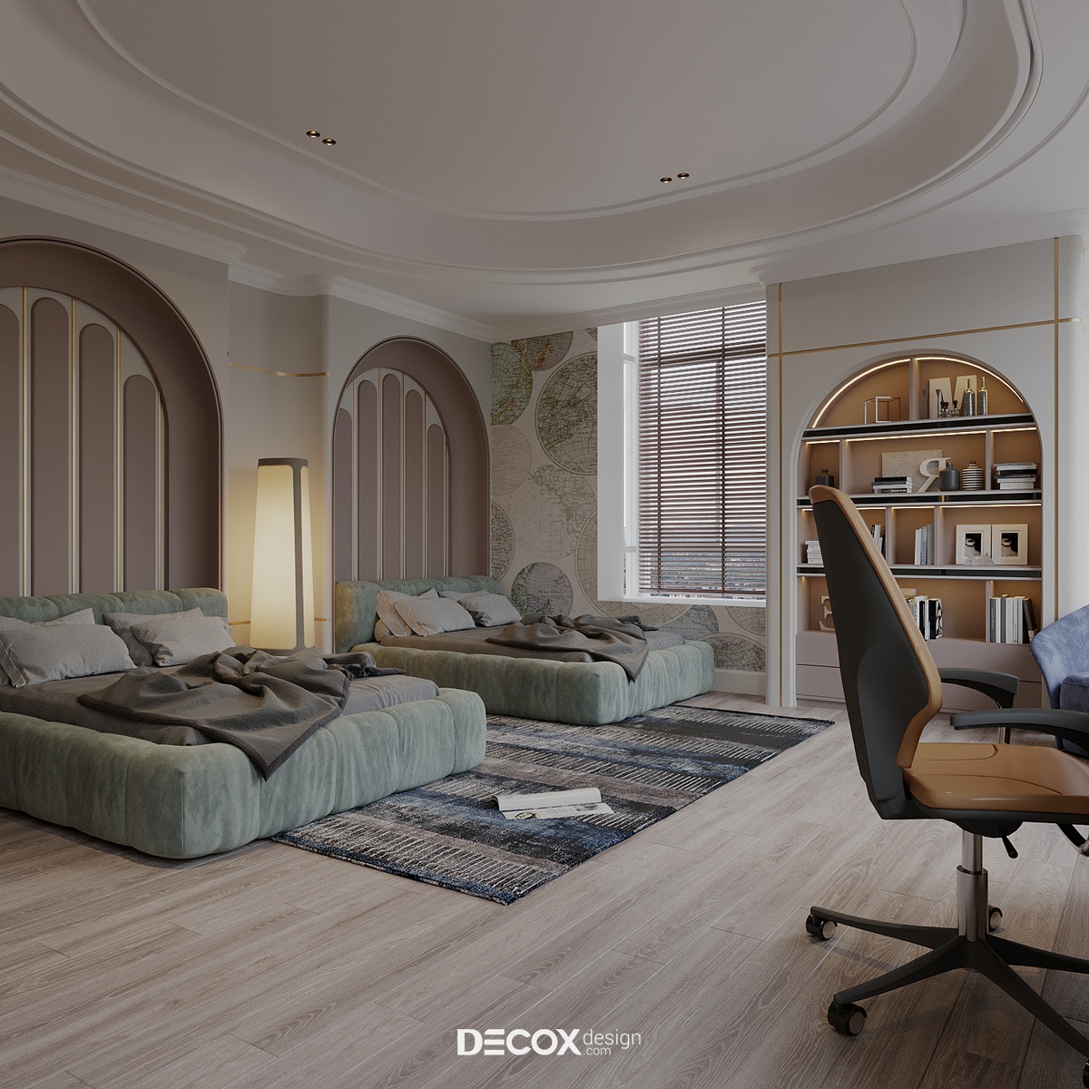 Phòng ngủ được thiết kế dành riêng cho hai bé, với diện tích rộng rãi nên KTS đã lựa chọn phương án bố trí giường bệt đặt gần cạnh nhau vừa giúp hai bé dễ dàng chuyện trò gia tăng tình cảm vừa đảm bảo an toàn cho bé. Ngoài tone trắng - xám cá tính đóng vai trò chủ đạo, Decox cũng bổ sung thêm một chút sắc xanh dịu mắt đến từ nội thất và giấy dán tường nhấn điểm để tăng thêm cảm hứng cũng như làm hài hòa không gian.