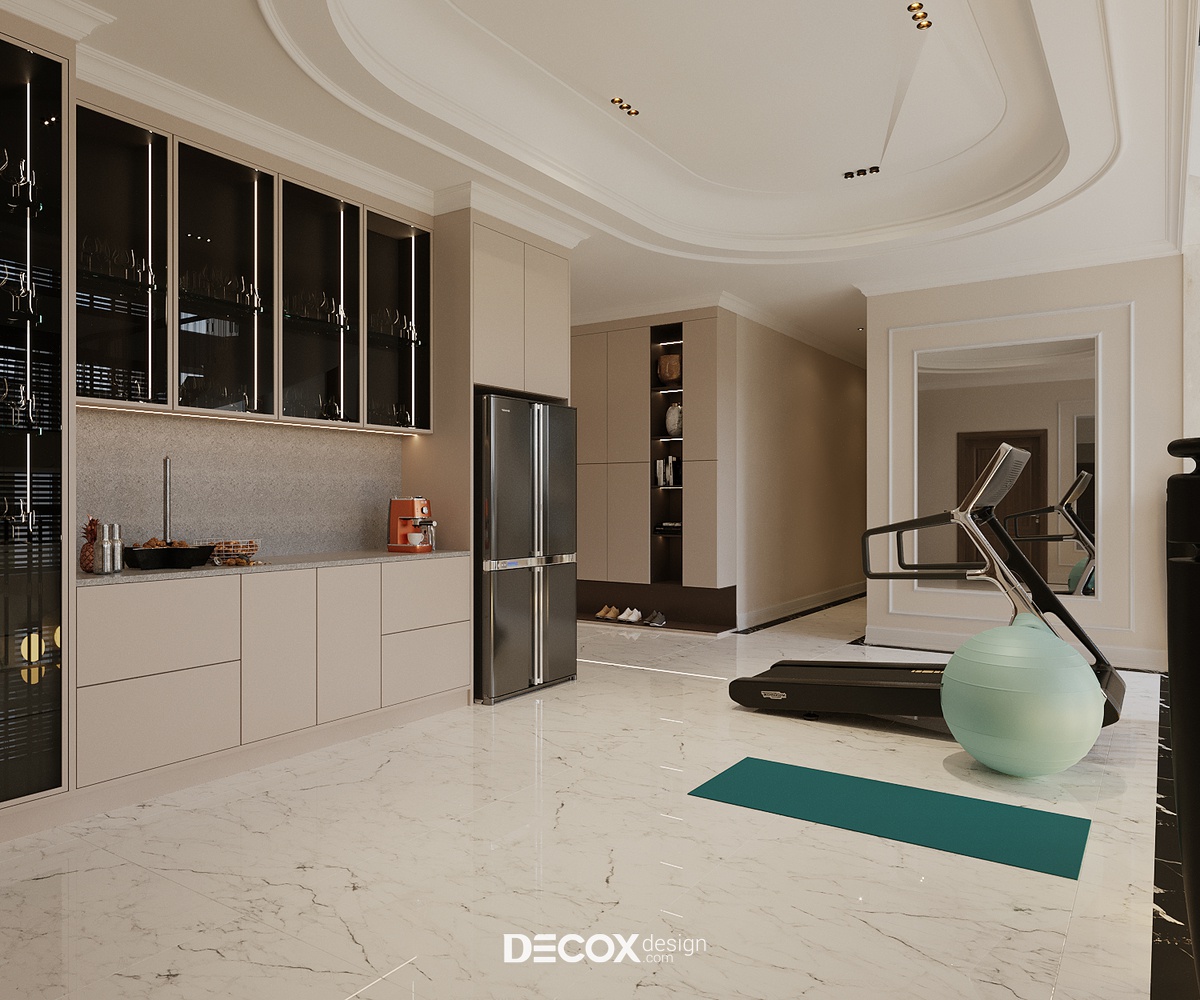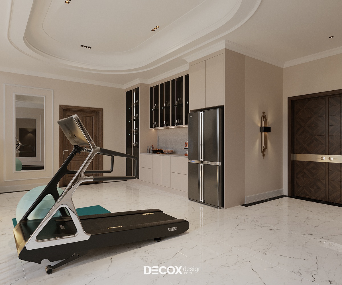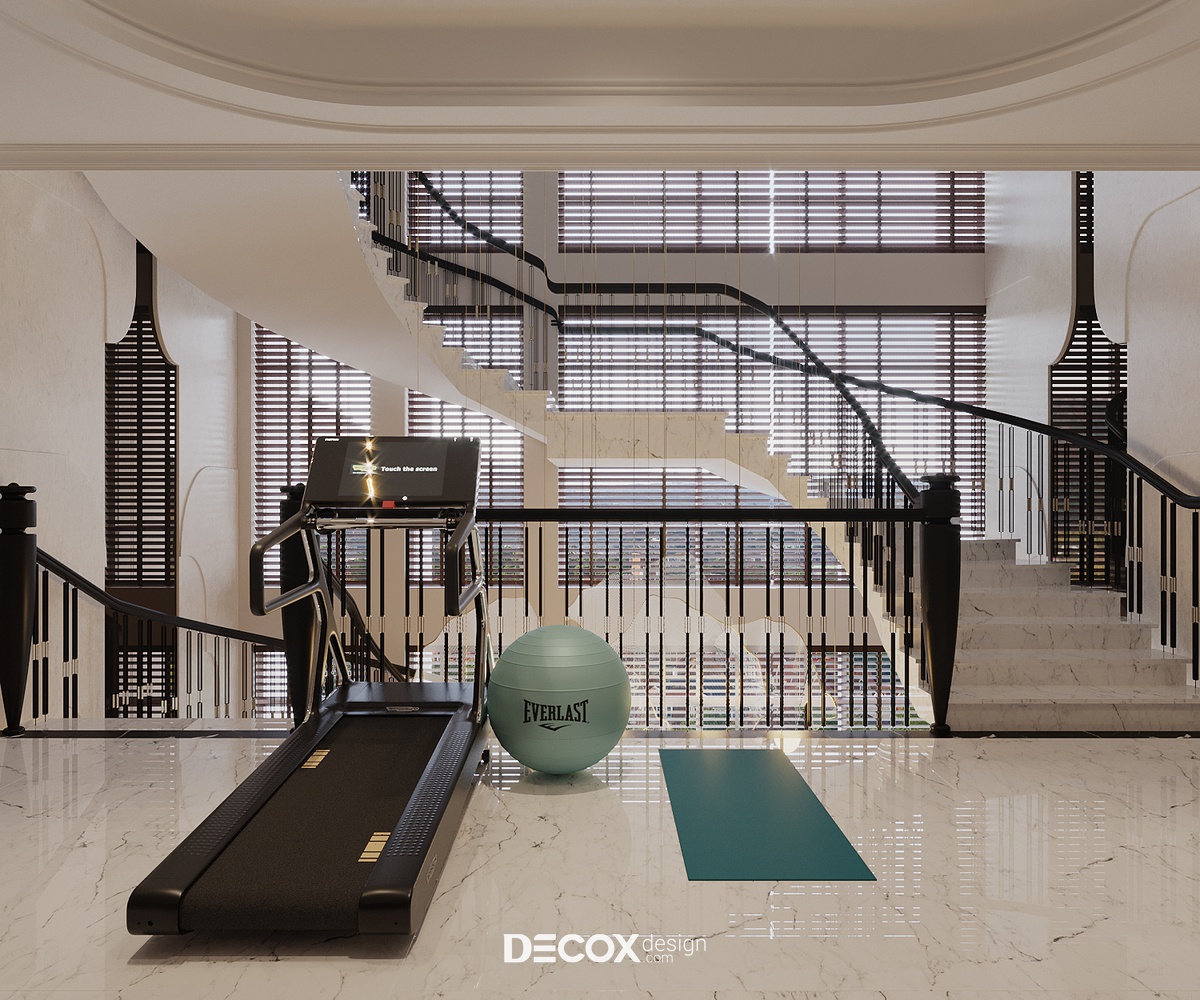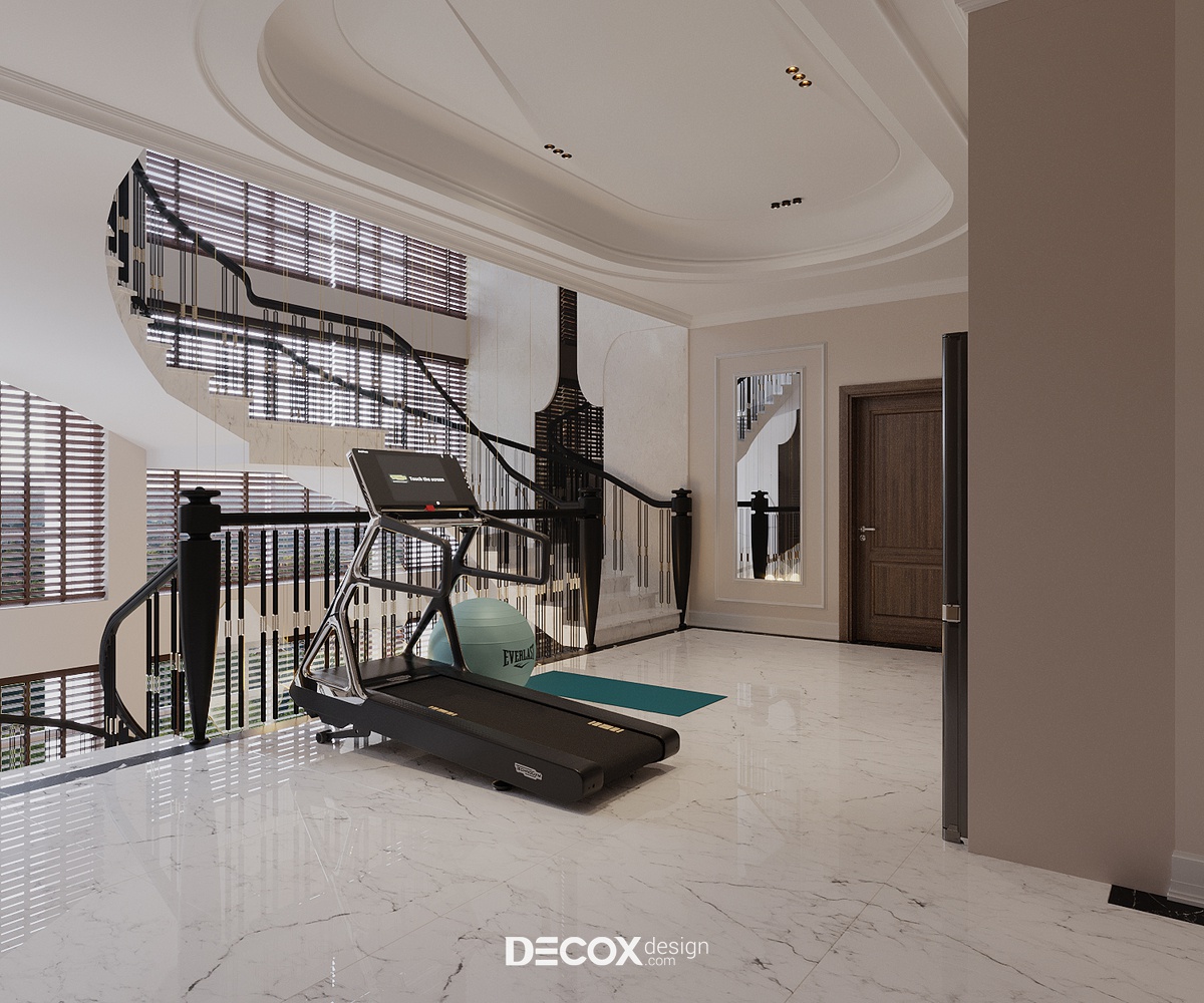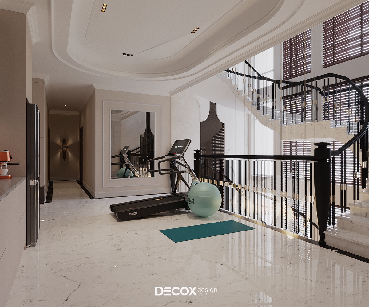 Không gian trống ngoài sảnh tầng 2 được tận dụng làm thành nơi tập thể dục cho cả gia đình, với những thiết bị hiện đại như máy chạy bộ, bóng tập hay thảm yoga cùng gương lớn treo 2 bên tường là bạn đã có thể dễ dàng kiểm soát tư thế mà không cần phải đến phòng tập.
