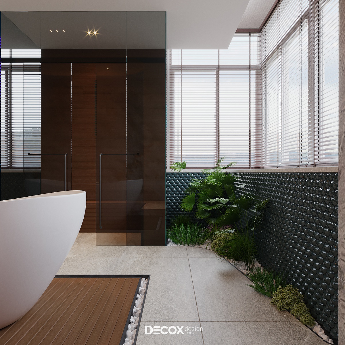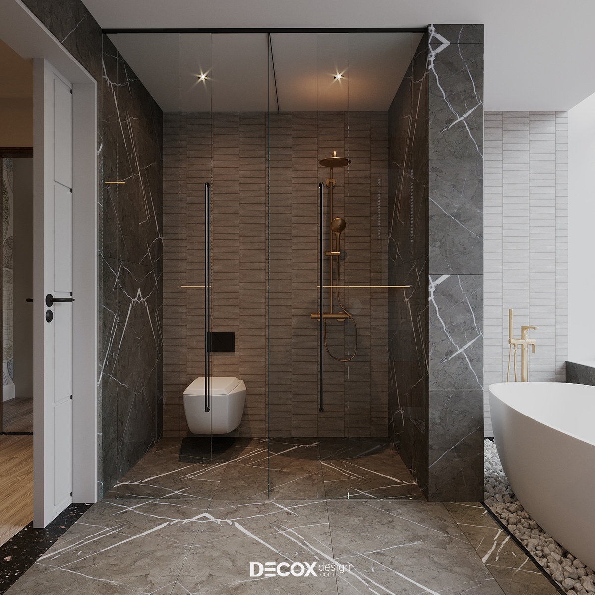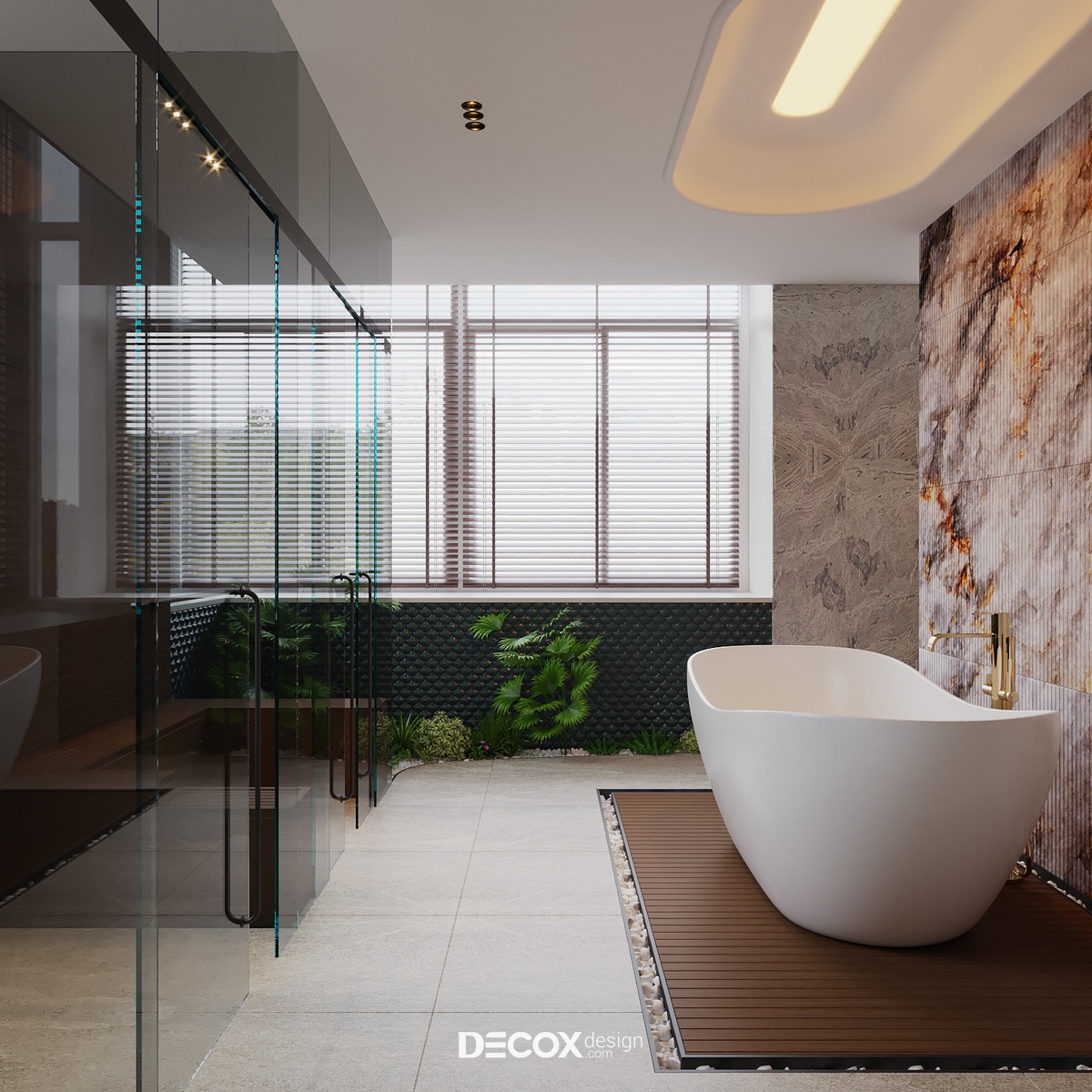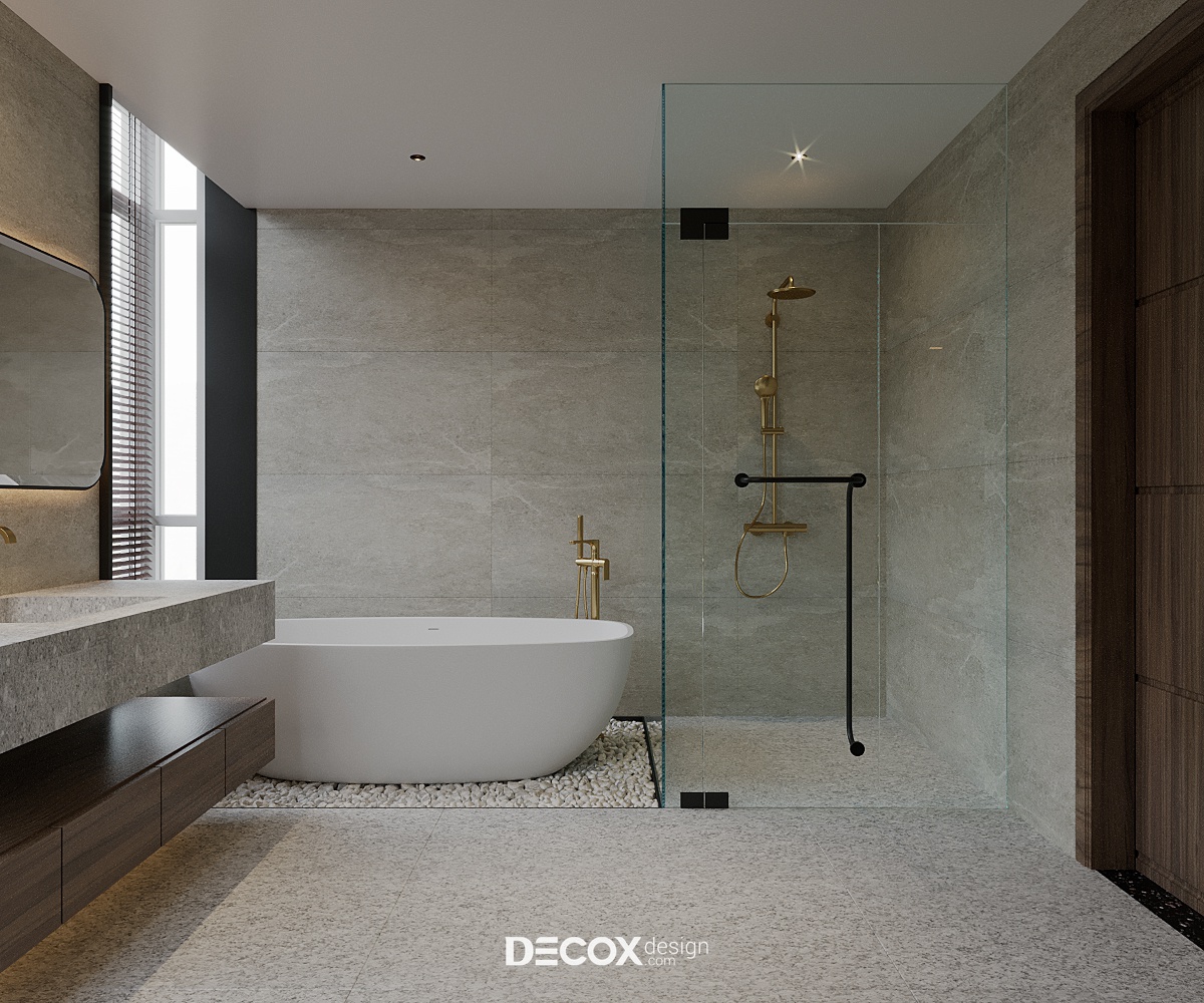 Đi sâu vào bên trong phòng thay đồ bạn sẽ bắt gặp khu vực phòng tắm của phòng master. Không gian này được thiết kế, trang trí theo phong cách sang trọng pha đôi chút nét mộc mạc, gần gũi thiên nhiên. Ngoài khu vực WC, buồng tắm đứng với chất liệu kính trong suốt được thiết kế liền kề nhau, KTS còn bổ sung thêm bồn tắm thư giãn đặt trên nền sàn gỗ rải đá cuội xung quanh ở phía bên ngoài. Cạnh bên là tiểu cảnh sân vườn mini với cây xanh trang trí, cách thiết kế này mang lại cảm giác trong lành, thư thái như một không gian spa thực thụ giúp bạn xua tan mọi mệt mỏi khi ngâm mình thư giãn trong làn nước ấm.