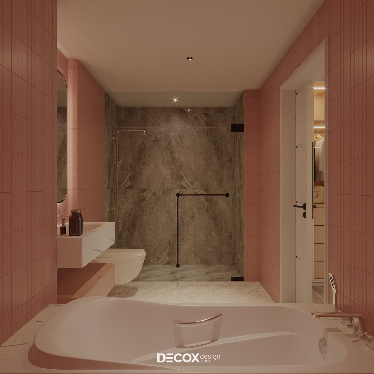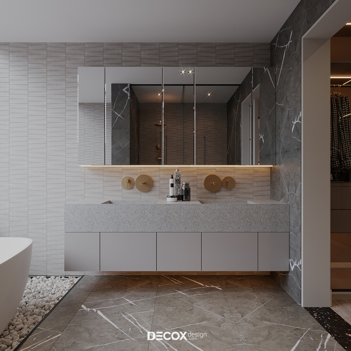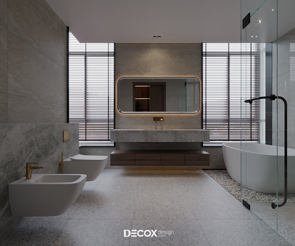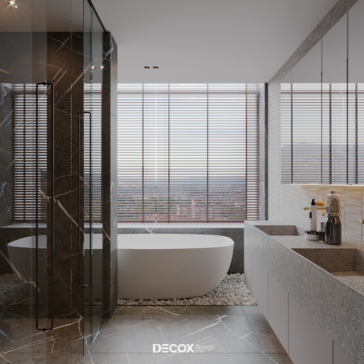 Đi sâu vào bên trong phòng thay đồ bạn sẽ bắt gặp khu vực phòng tắm của phòng master. Không gian này được thiết kế, trang trí theo phong cách sang trọng pha đôi chút nét mộc mạc, gần gũi thiên nhiên. Ngoài khu vực WC, buồng tắm đứng với chất liệu kính trong suốt được thiết kế liền kề nhau, KTS còn bổ sung thêm bồn tắm thư giãn đặt trên nền sàn gỗ rải đá cuội xung quanh ở phía bên ngoài. Cạnh bên là tiểu cảnh sân vườn mini với cây xanh trang trí, cách thiết kế này mang lại cảm giác trong lành, thư thái như một không gian spa thực thụ giúp bạn xua tan mọi mệt mỏi khi ngâm mình thư giãn trong làn nước ấm.