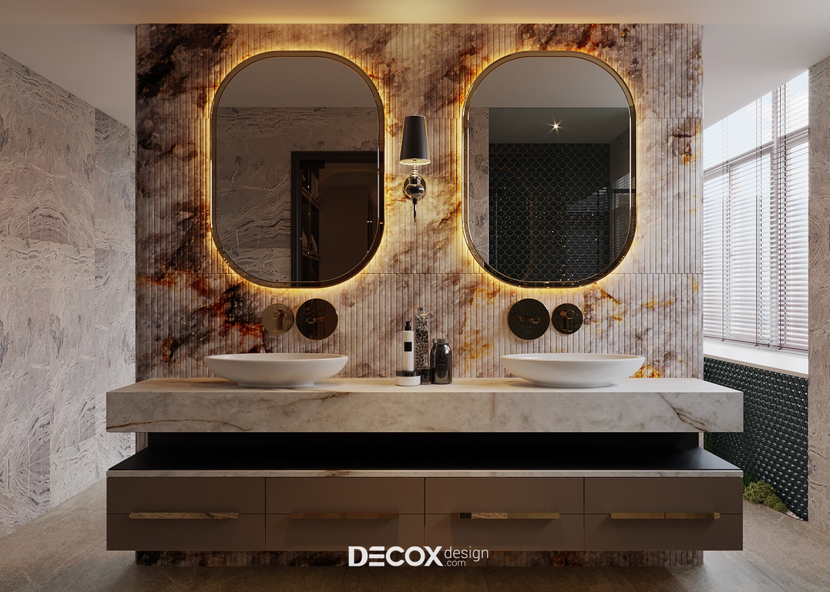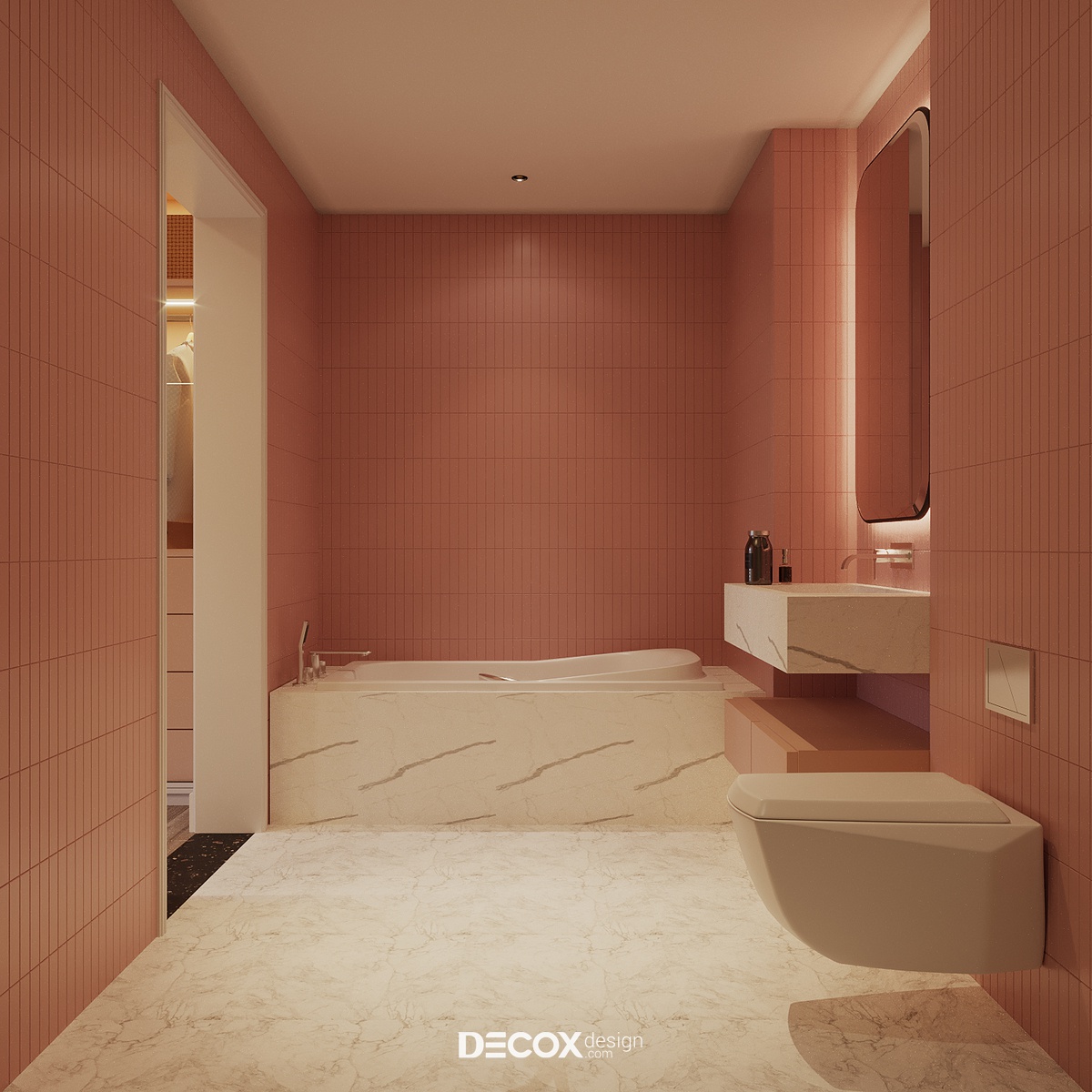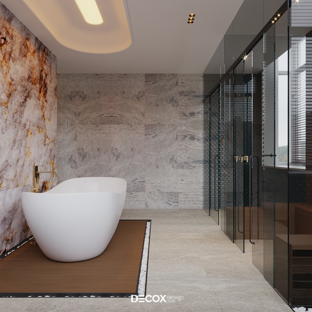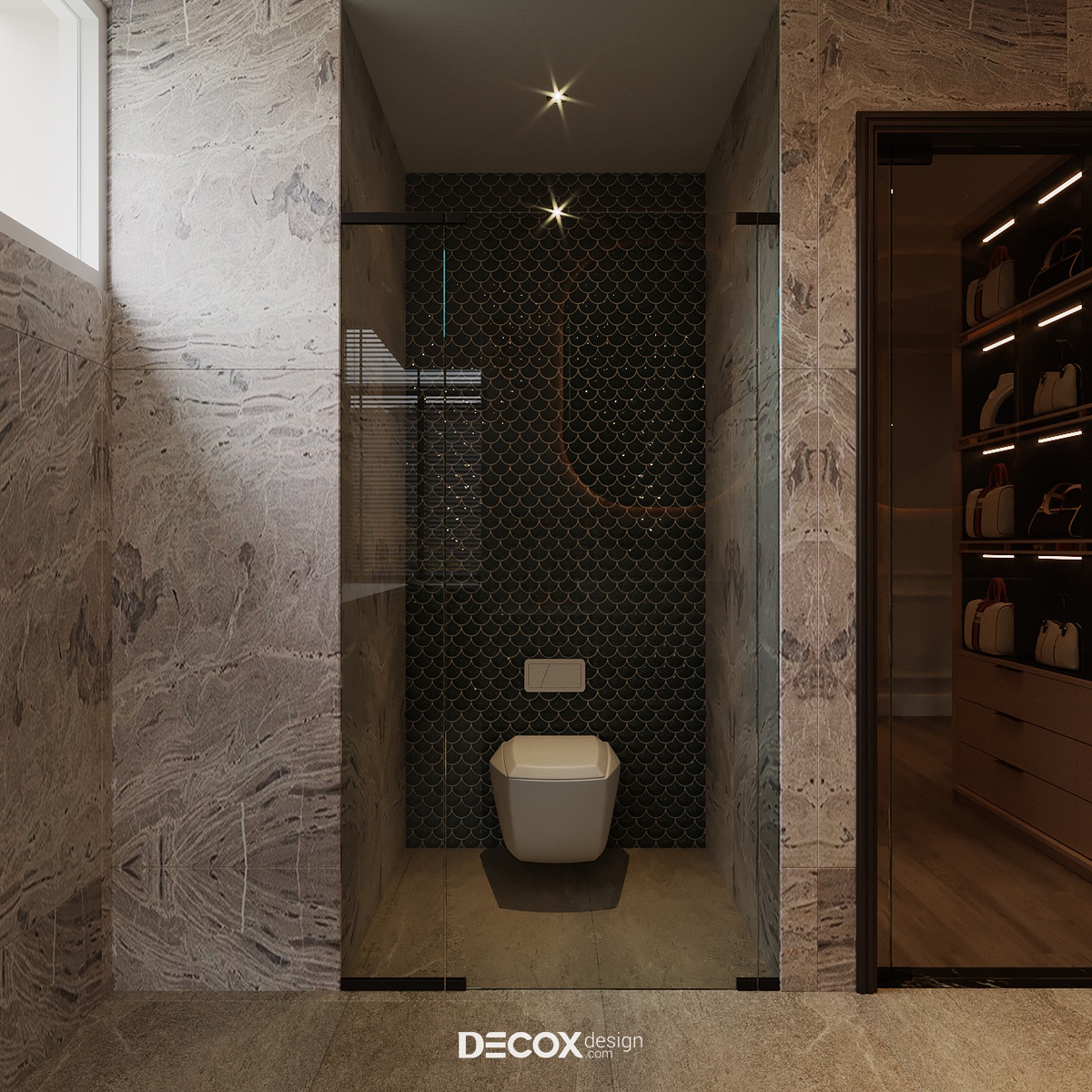 Đi sâu vào bên trong phòng thay đồ bạn sẽ bắt gặp khu vực phòng tắm của phòng master. Không gian này được thiết kế, trang trí theo phong cách sang trọng pha đôi chút nét mộc mạc, gần gũi thiên nhiên. Ngoài khu vực WC, buồng tắm đứng với chất liệu kính trong suốt được thiết kế liền kề nhau, KTS còn bổ sung thêm bồn tắm thư giãn đặt trên nền sàn gỗ rải đá cuội xung quanh ở phía bên ngoài. Cạnh bên là tiểu cảnh sân vườn mini với cây xanh trang trí, cách thiết kế này mang lại cảm giác trong lành, thư thái như một không gian spa thực thụ giúp bạn xua tan mọi mệt mỏi khi ngâm mình thư giãn trong làn nước ấm.