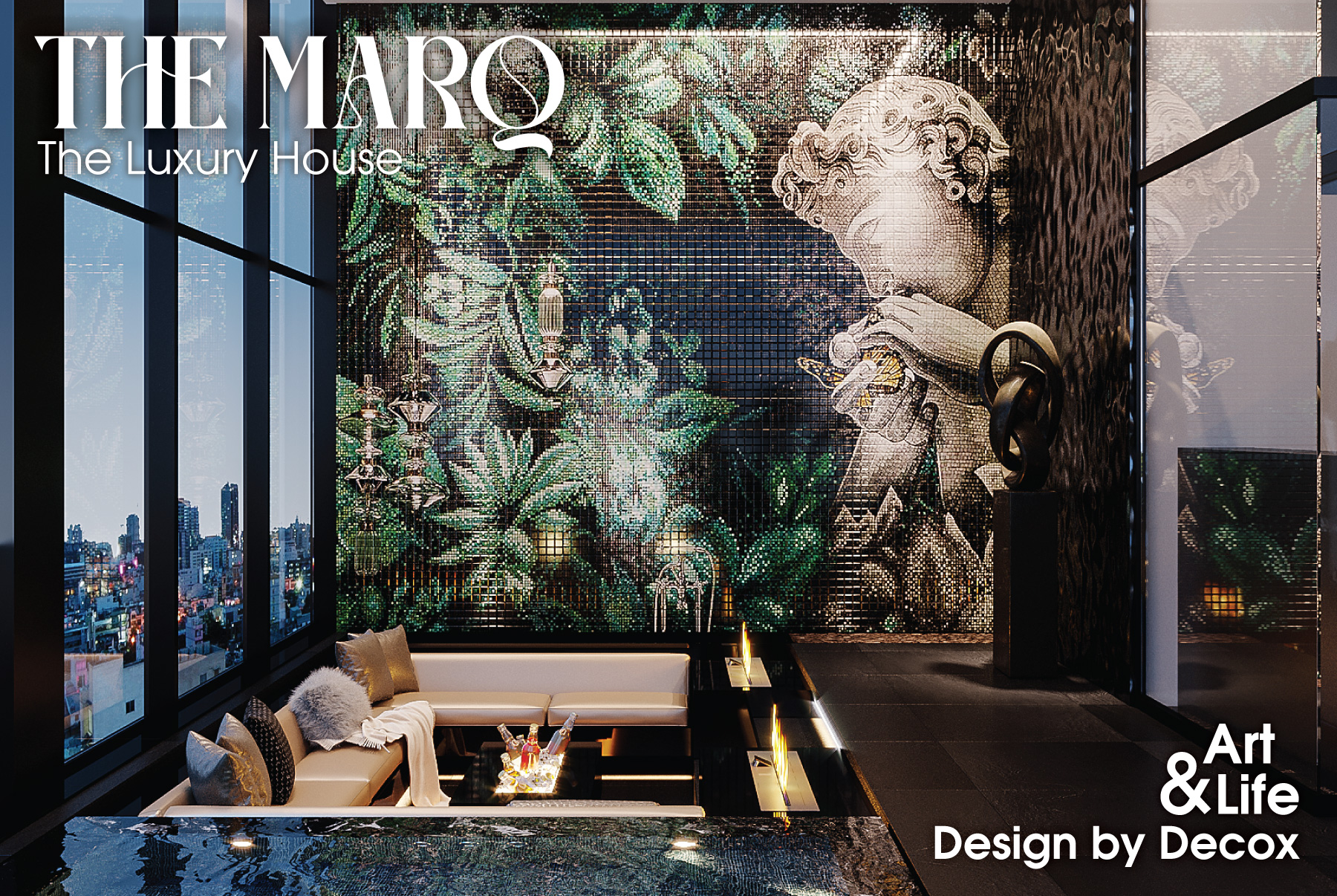 Khu vực “đắt giá” nhất trong căn Penthouse The Marq này chính là không gian ban công cực lớn và độc nhất với tầm view bắt trọn toàn cảnh thành phố sầm uất. Với bố cục thông thoáng, tầm nhìn rộng và không bị giới hạn, KTS đã chủ động biến nơi đây thành một không gian thư giãn thực thụ với hồ bơi tràn viền, cạnh bên là không gian sinh hoạt với thiết kế giật cấp đầy ấn tượng. Chất “Art” cũng được phô diễn thông qua bức tranh nghệ thuật cỡ đại được “vẽ” nên thông qua từng viên đá mosaic khảm vào nhau.