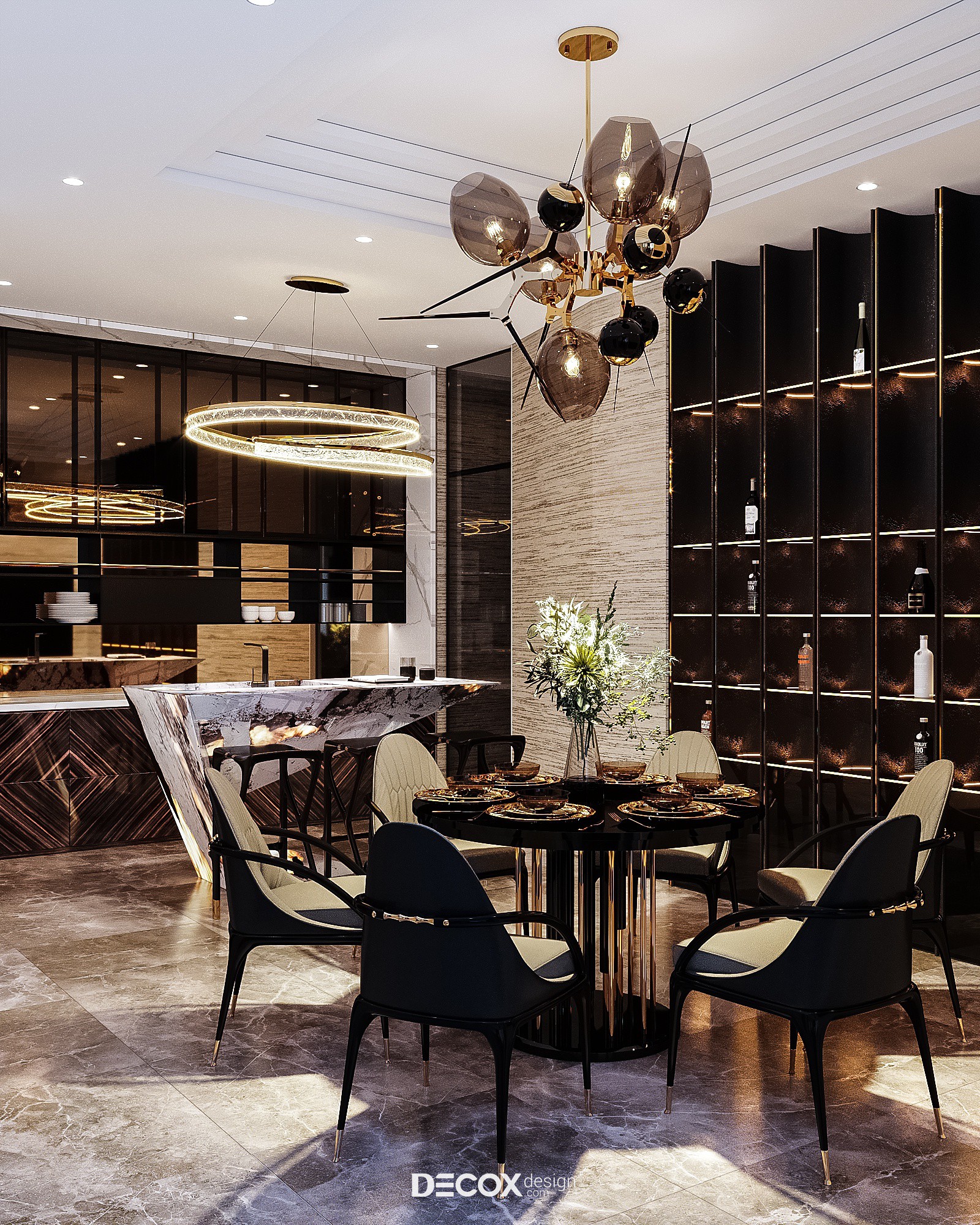 Phòng ăn được đặt ở khu vực “giao thoa” giữa phòng khách và bếp nấu, tạo sự liên thông và kết nối giữa các khu vực trong nhà. Cách liên kết đường nét, màu sắc và chất liệu ở khu vực phòng ăn tỏ rõ sự trau chuốt, tỉ mỉ. Nếu các tone màu trầm, vật liệu mang giá trị bền vững là đại diện của nét đẹp hiện đại thì những đường cong đầy tự do và uyển chuyển trên đồ nội thất lại lan tỏa nét đẹp cầu kỳ chuẩn Luxury. Bộ đèn thả vừa là điểm nhất vừa là điểm kết nối với bàn ăn. Thông qua các chi tiết vàng đồng giàu tính phản chiếu hiện diện trên bộ bàn ăn, kệ trang trí và đèn chùm.. tổng thể như được “khoác” lên mình bộ áo sang trọng và cuốn hút.