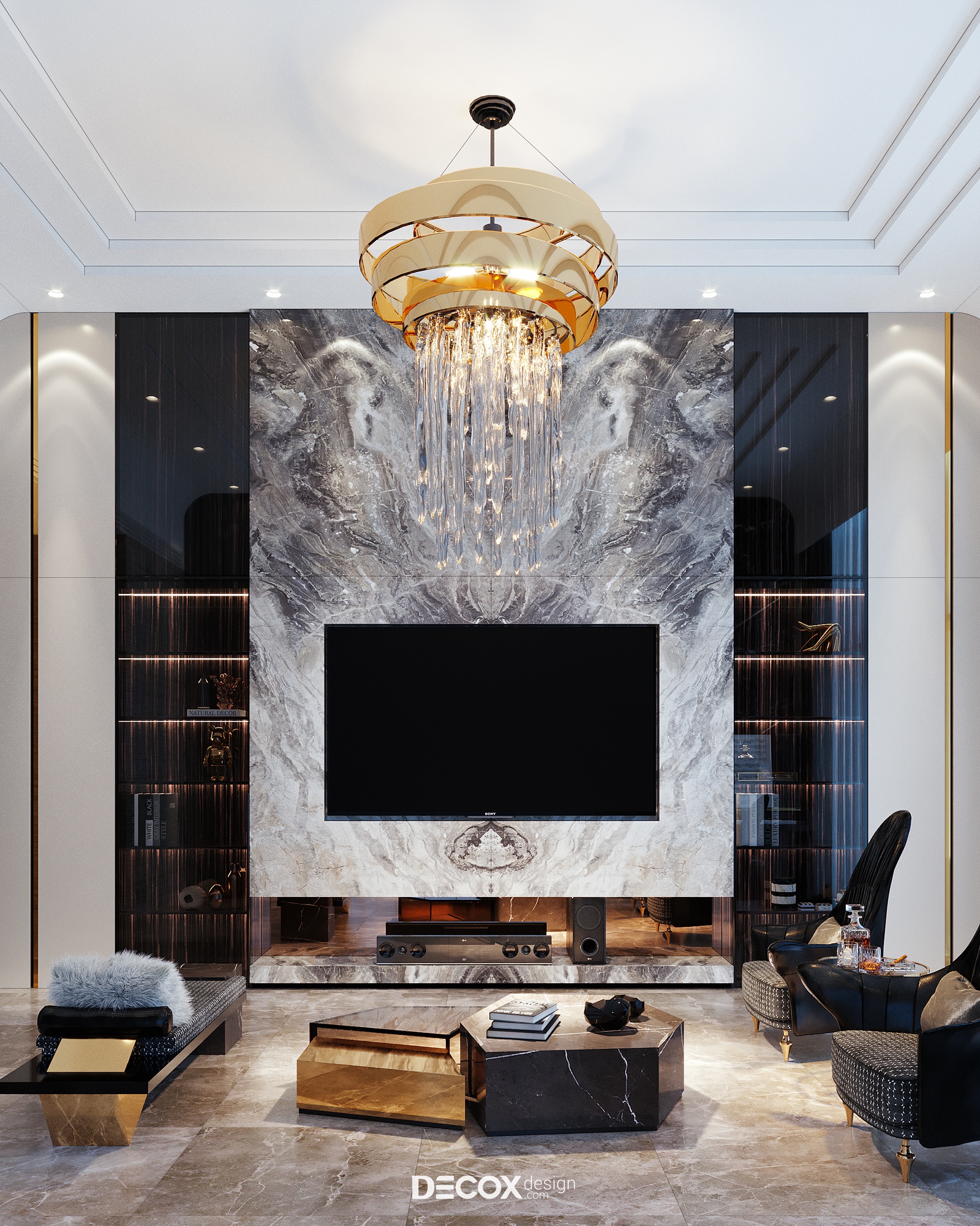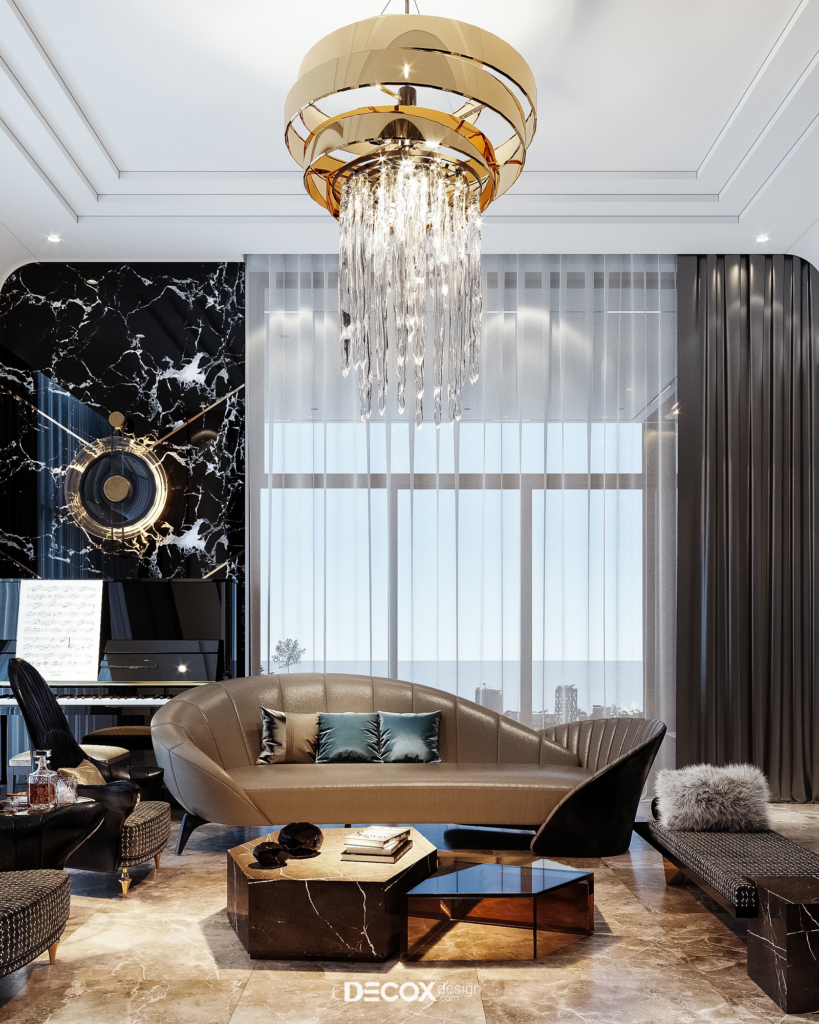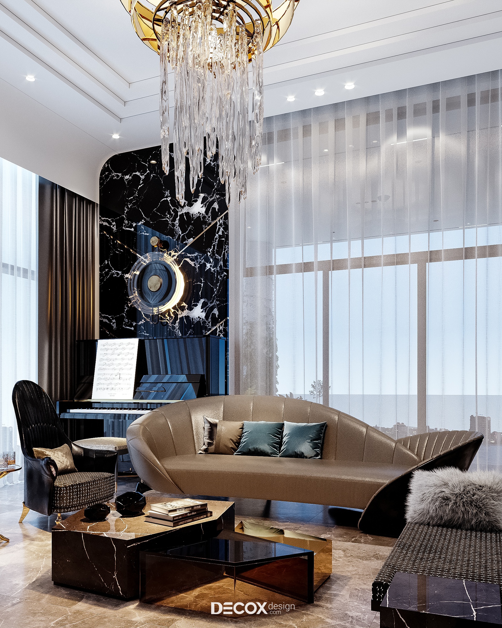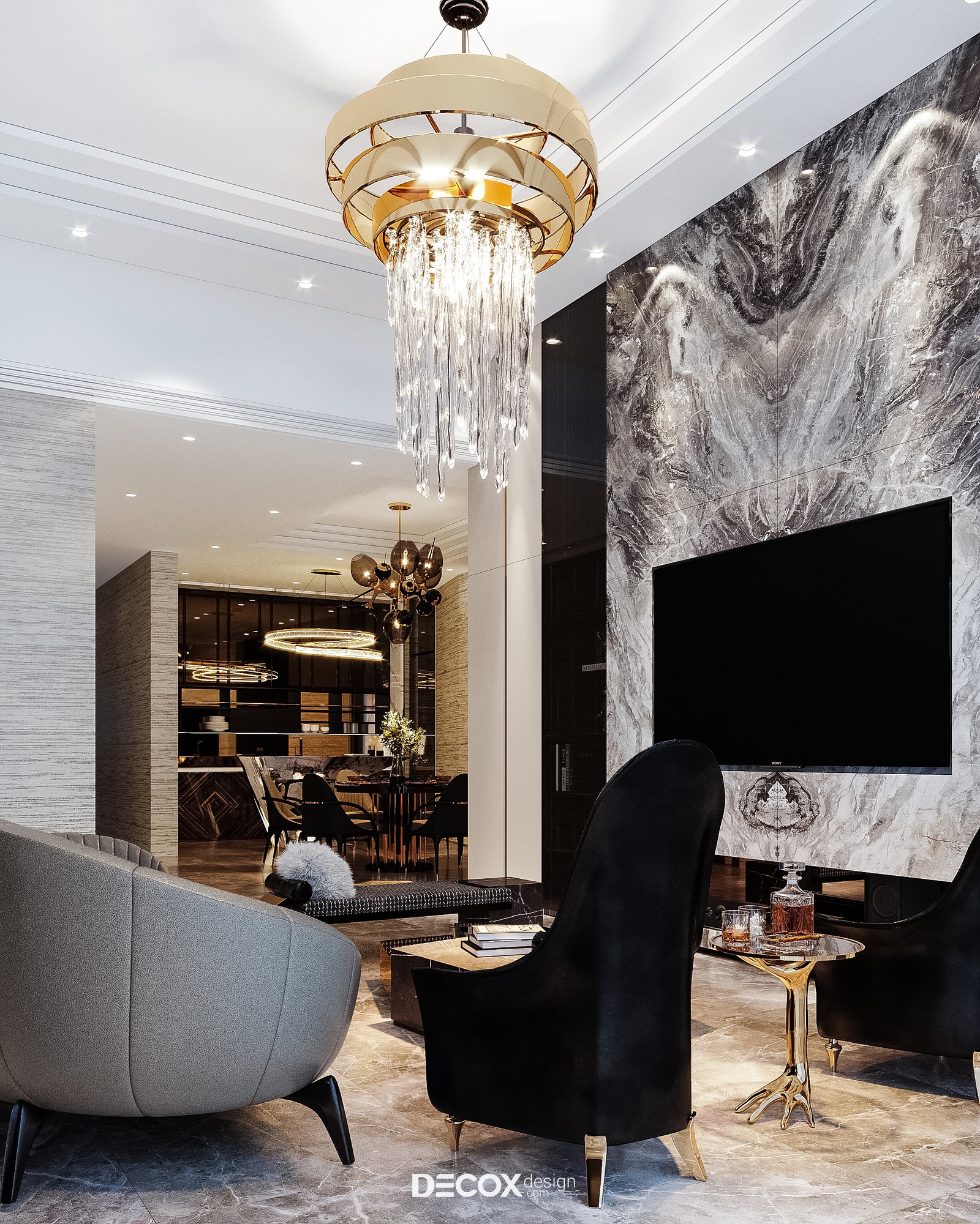 Không giấu diếm chủ đích tạo nên một không gian phòng khách sang trọng, khẳng định vị thế gia chủ cũng như đẳng cấp căn hộ hạng sang trên cao, Decox đã ứng dụng phong cách hiện đại luxury, đơn giản mà hào nhoáng. Thiết kế sử dụng bảng màu trung tính, nền nã mà cá tính với cặp màu kinh điển trắng đen chủ đạo đồng thời nhấn điểm cùng những chi tiết mạ vàng sang trọng. Có thể thấy tỷ lệ, chất liệu và chi tiết đã được phối trộn một cách hoàn hảo nhằm đem đến một tổng thể thống nhất và kết nối. Đẳng cấp của phòng khách không chỉ nằm ở sự đắt đỏ trong chất liệu sử dụng mà còn thể hiện trọn vẹn thông qua nội thất được đặt thiết kế riêng làm nên sự khác biệt, khẳng định chất riêng.