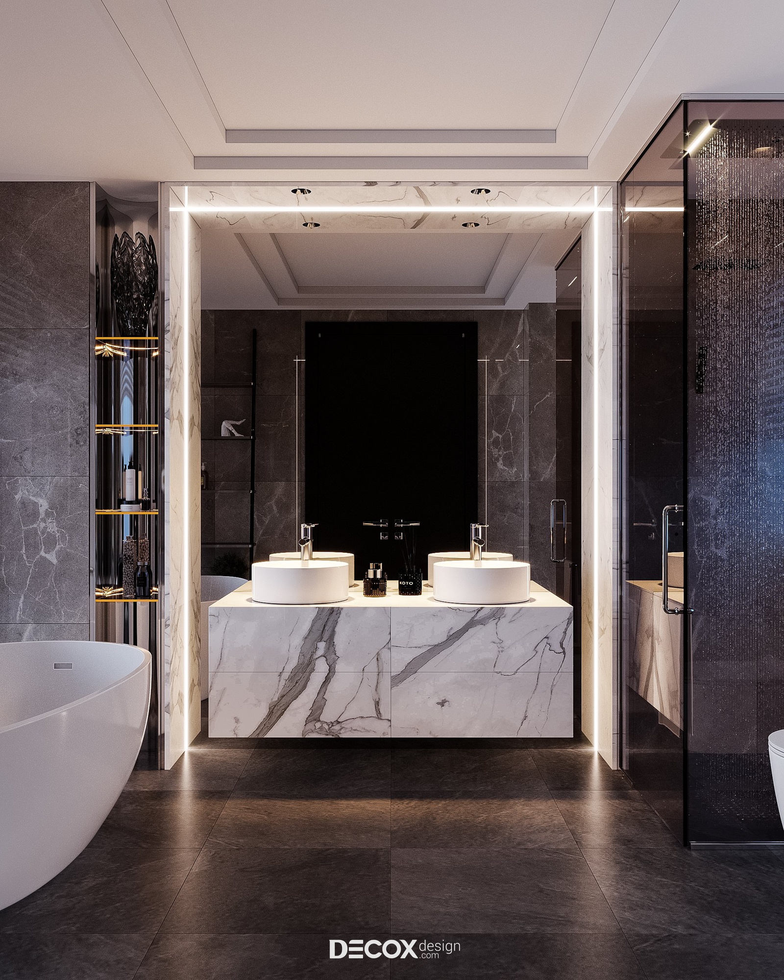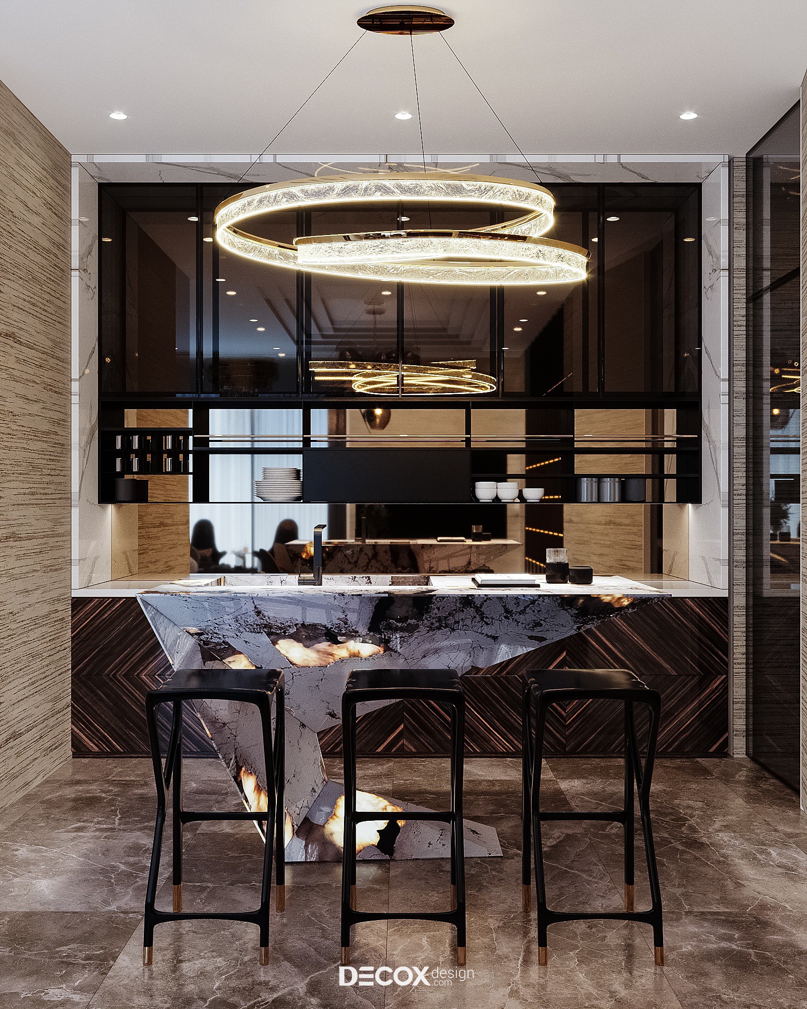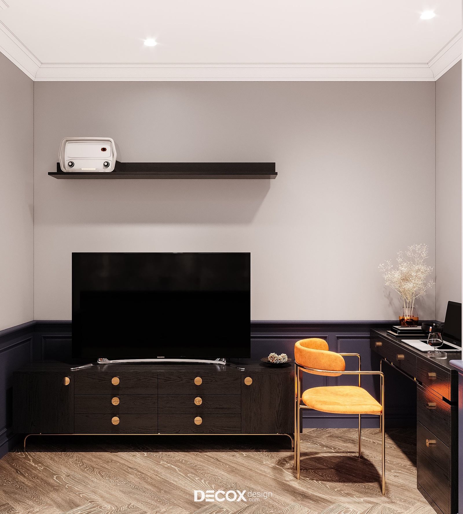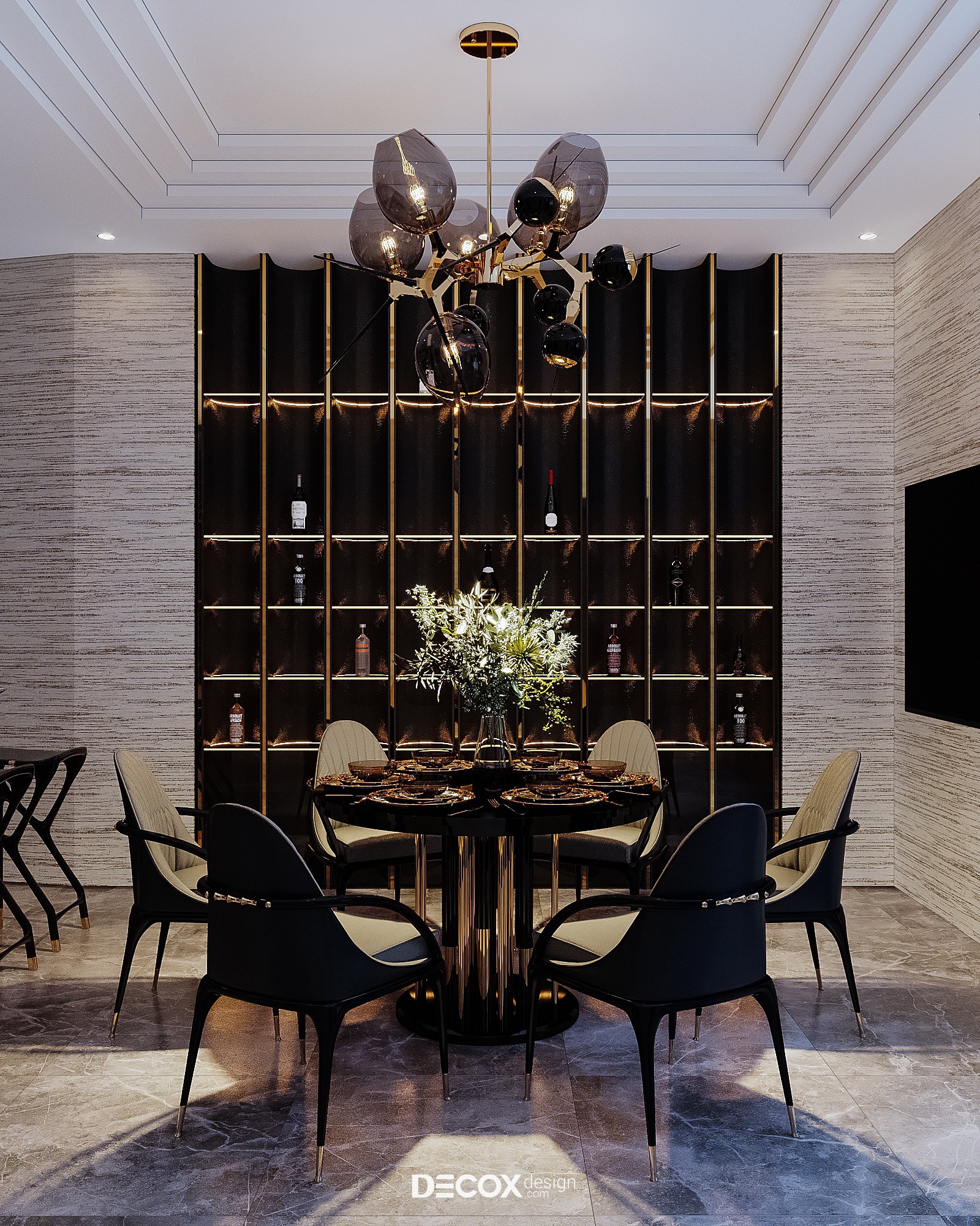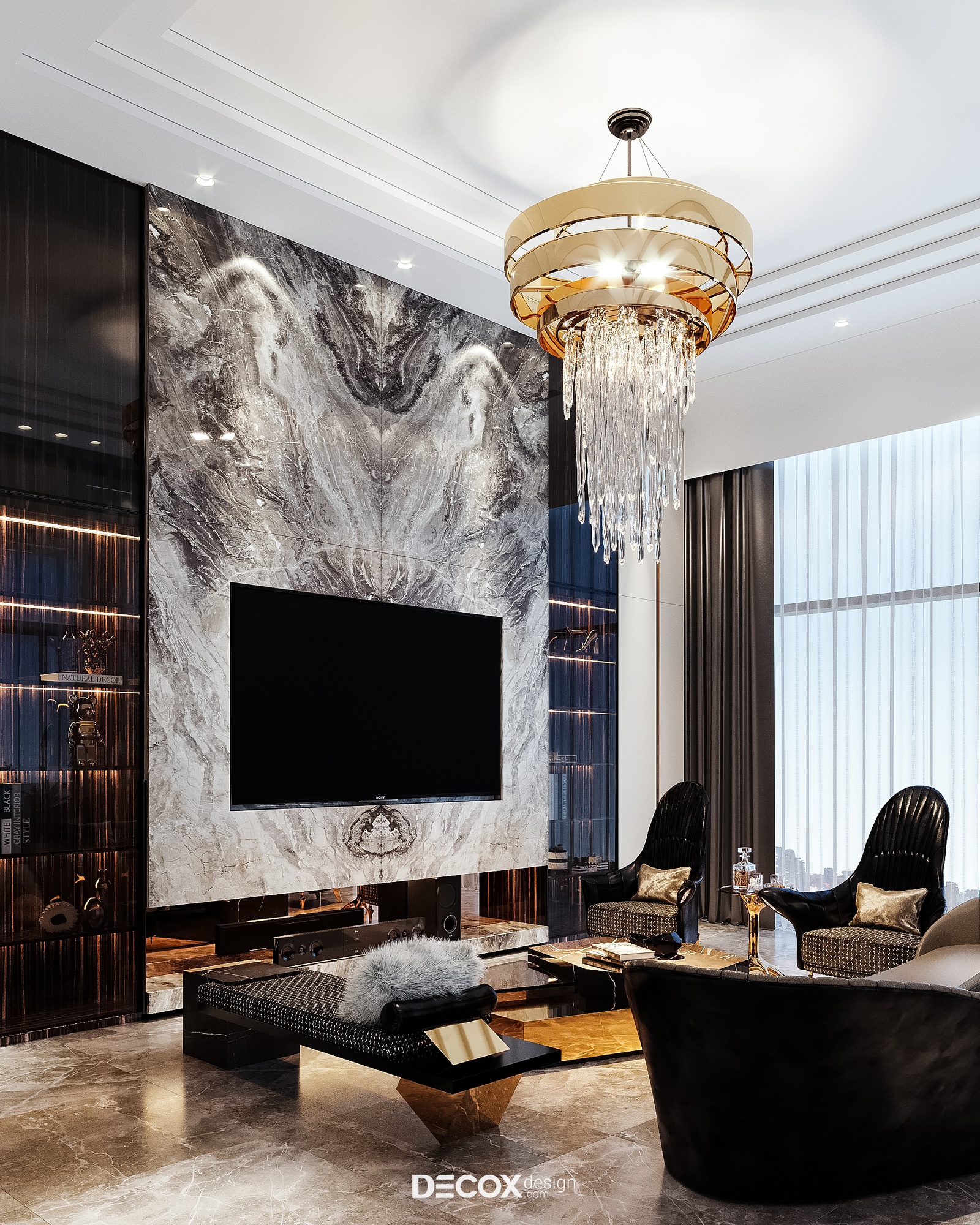 Không giấu diếm chủ đích tạo nên một không gian phòng khách sang trọng, khẳng định vị thế gia chủ cũng như đẳng cấp căn hộ hạng sang trên cao, Decox đã ứng dụng phong cách hiện đại luxury, đơn giản mà hào nhoáng. Thiết kế sử dụng bảng màu trung tính, nền nã mà cá tính với cặp màu kinh điển trắng đen chủ đạo đồng thời nhấn điểm cùng những chi tiết mạ vàng sang trọng. Có thể thấy tỷ lệ, chất liệu và chi tiết đã được phối trộn một cách hoàn hảo nhằm đem đến một tổng thể thống nhất và kết nối. Đẳng cấp của phòng khách không chỉ nằm ở sự đắt đỏ trong chất liệu sử dụng mà còn thể hiện trọn vẹn thông qua nội thất được đặt thiết kế riêng làm nên sự khác biệt, khẳng định chất riêng.