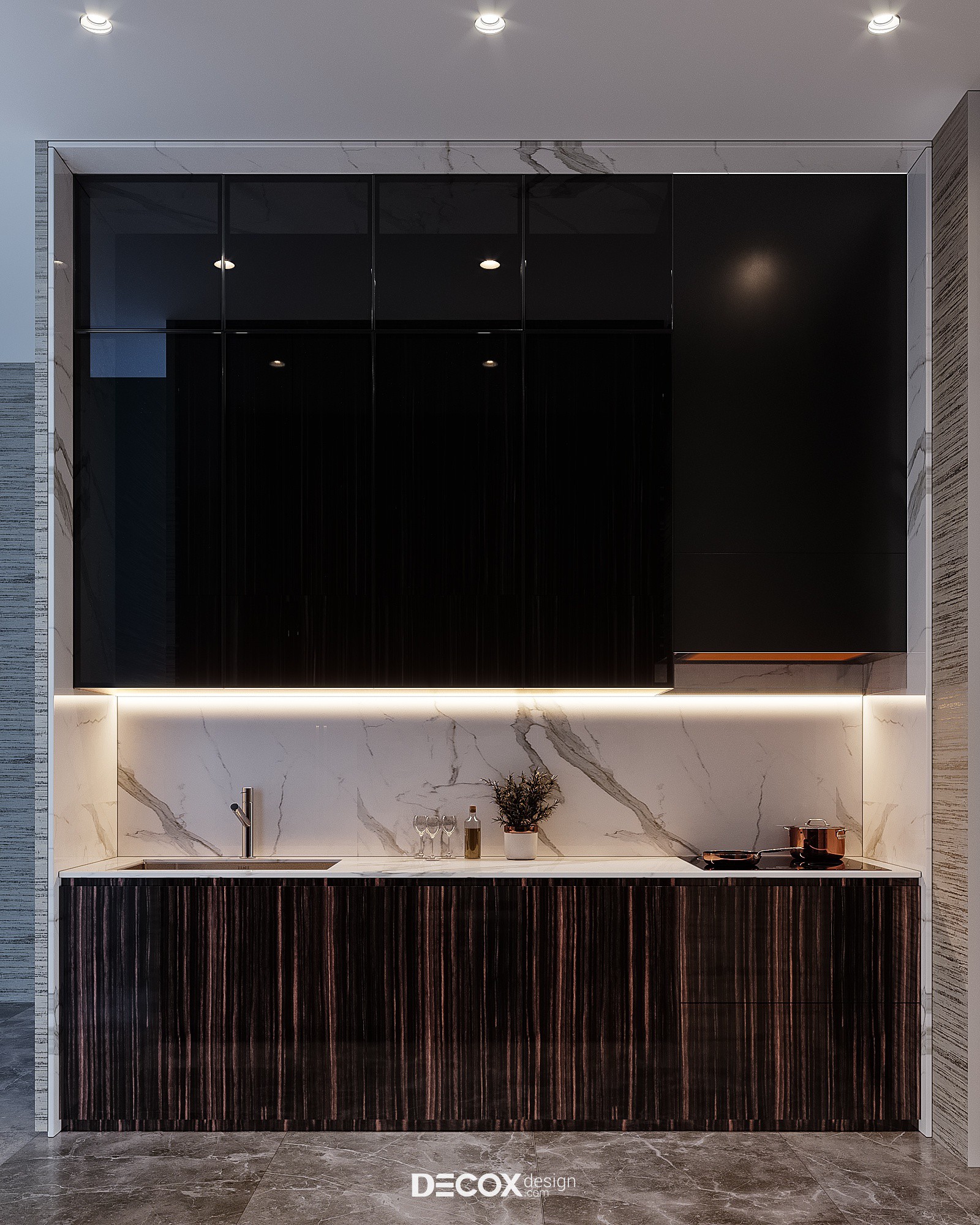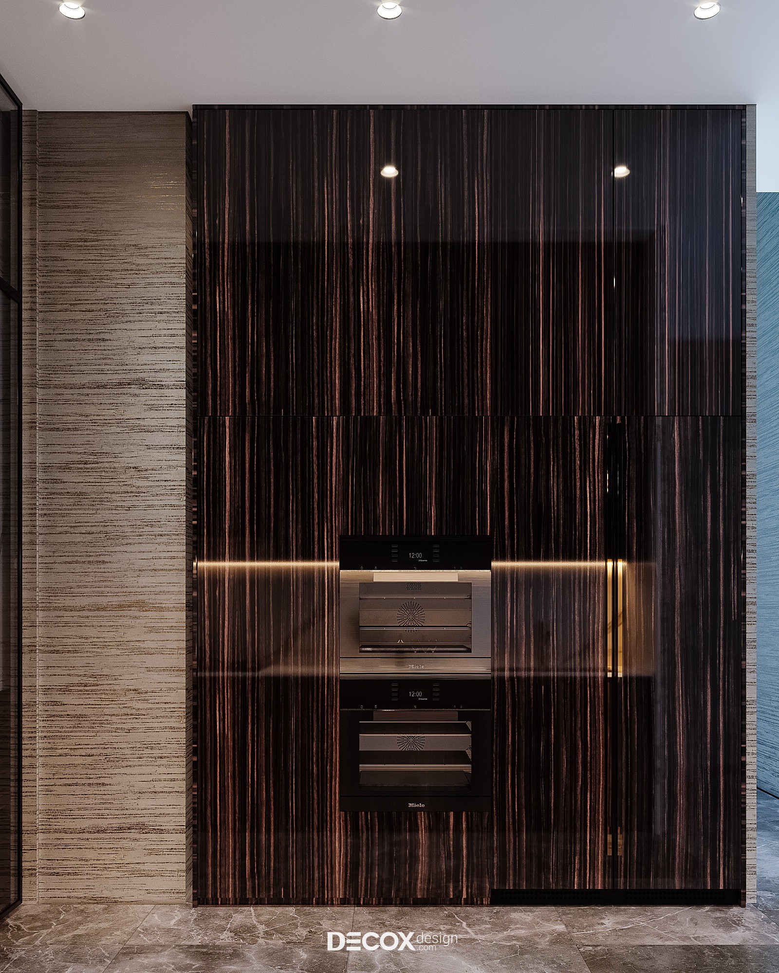 Không gian bếp nấu được thiết kế tách biệt so với những khu vực khác trong nhà, mục đích của thiết kế là đảm bảo tính riêng tư và tạo sự thoải mái cho người đứng bếp. Bếp được bố trí theo dạng chữ I đơn giản, song song đó là hệ tủ lưu trữ phục vụ cho sinh hoạt cũng như tăng khả năng lưu trữ cho không gian này. Không cầu kỳ trong thiết kế thế nhưng phòng bếp vẫn ghi được ấn tượng ngay từ khi vừa chạm mắt. Tương phản với sự “bóng loáng” của hệ tủ bếp trên, những đường vân gỗ kẻ sọc với sắc độ không đồng nhất ở tủ bếp dưới lại đem đến sự phá cách đầy mới lạ.