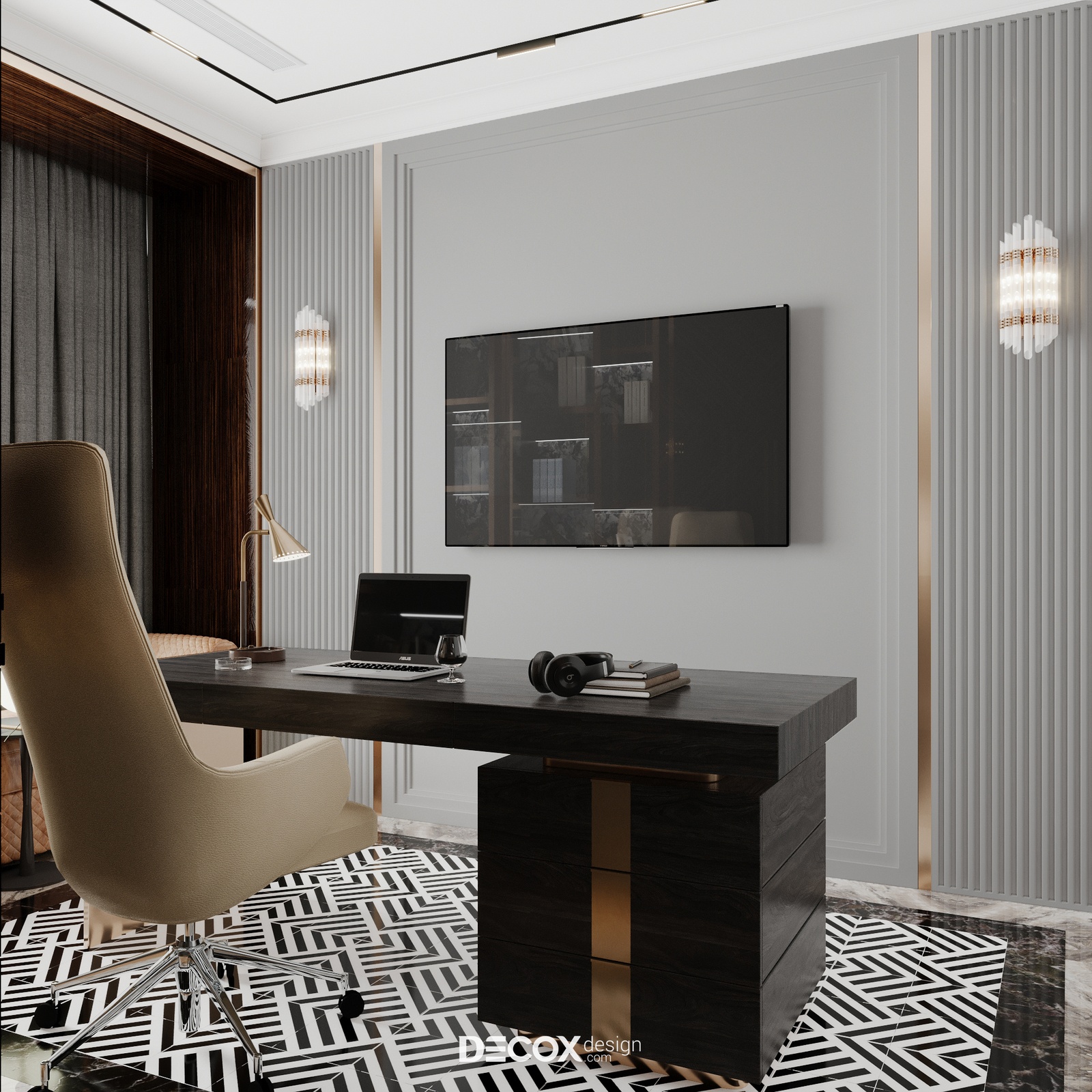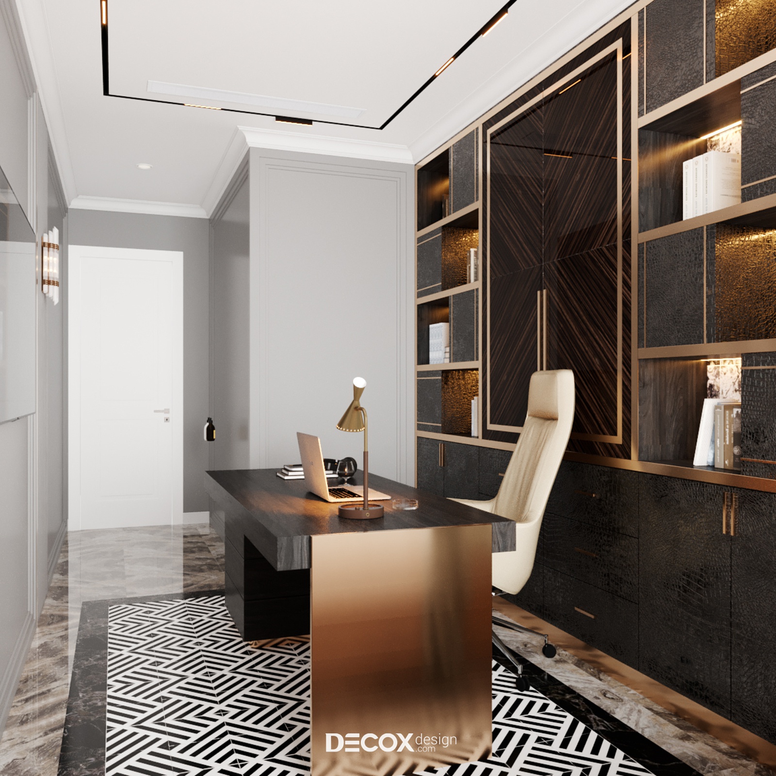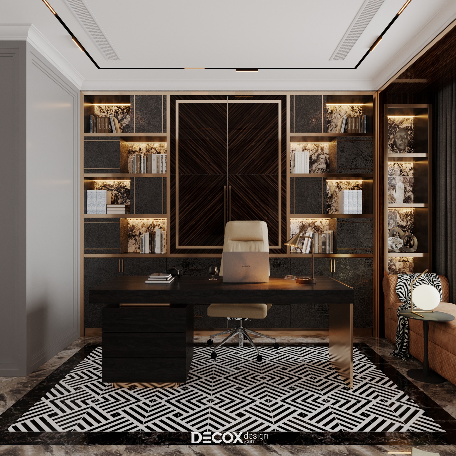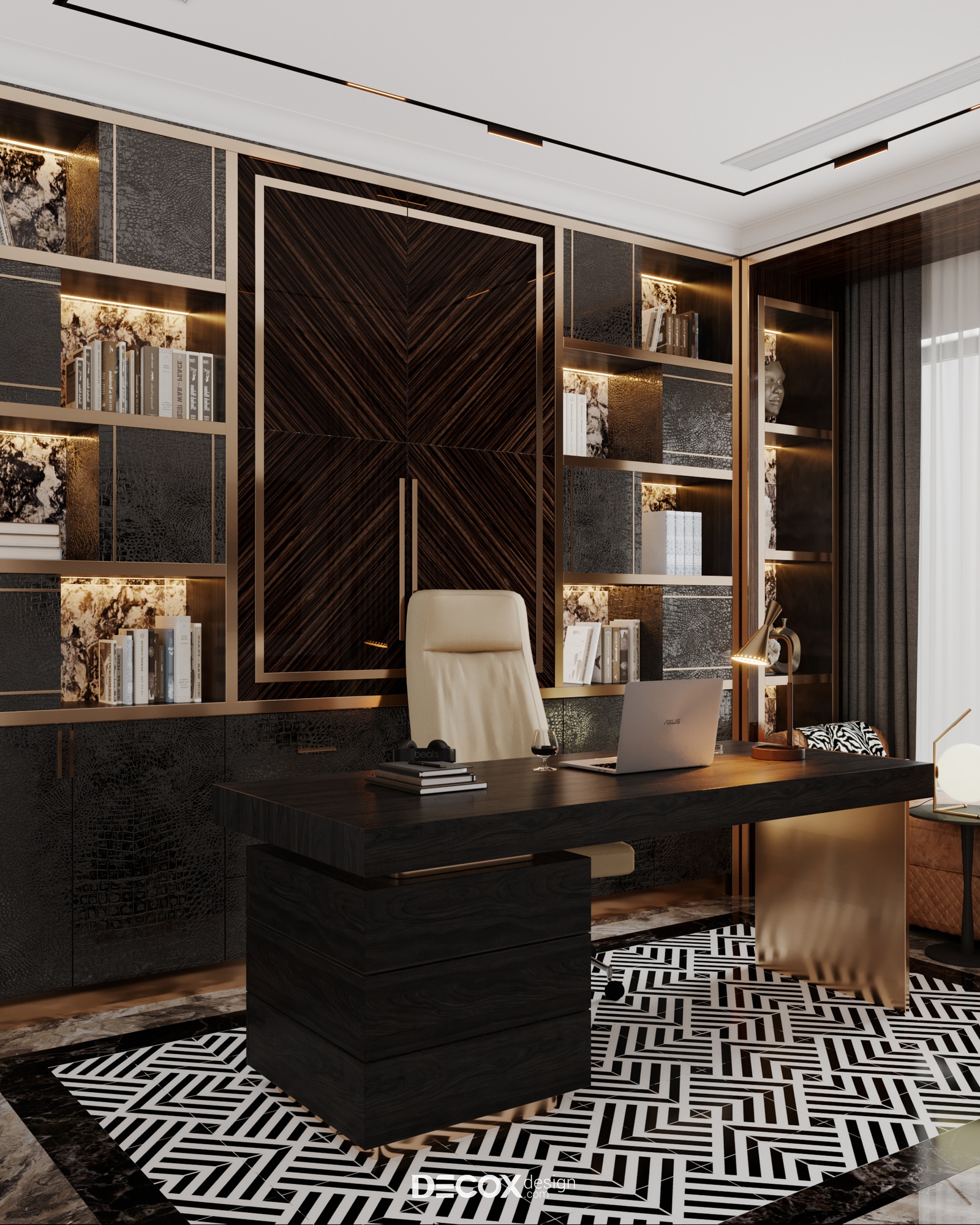 Phòng làm việc tại gia độc lập và riêng tư giúp gia chủ có không gian riêng để tập trung và giải quyết công việc. Thiết kế mang đến màu sắc trầm ấm, hiện đại và sang trọng như đúng tinh thần mà căn hộ phô diễn. Chất liệu sử dụng trong không gian này vẫn xoay quanh những chất liệu quen thuộc như đá, gỗ, vải và kim loại mạ sang trọng. Ngoài bàn làm việc đúng chuẩn thì một chiếc bay-windows đặt cạnh cửa sổ giúp tái tạo năng lượng tinh thần, khơi gợi cảm hứng sáng tạo hay đơn giản là nơi thả mình thư giãn, nhìn ngắm dòng người ngược xuôi.