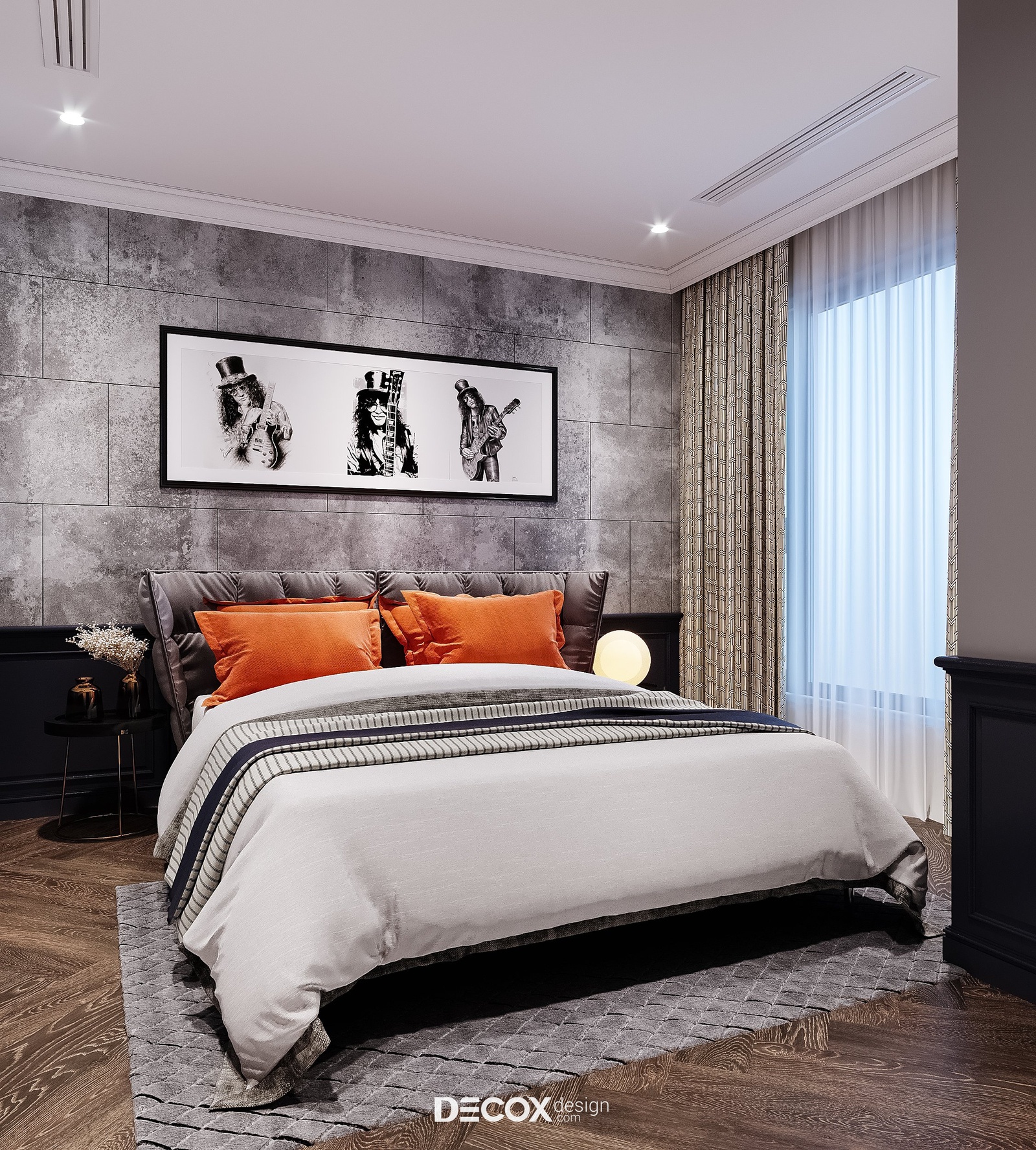 Lấy cảm hứng từ dòng nhạc Jazz đầy ngẫu hứng và độc đáo, KTS đã kiến tạo nên một không gian vừa hiện đại lại vừa cá tính. Điểm nhấn đặc sắc trong không gian phòng ngủ này nằm ở chất liệu sử dụng cũng như các chi tiết trang trí. Điển hình là bức tường gạch bê tông ốp lát phần đầu giường, một bức tranh đậm chất nghệ thuật cũng như điểm nhấn của tone màu nóng trên phông nền trung tính chủ đạo.