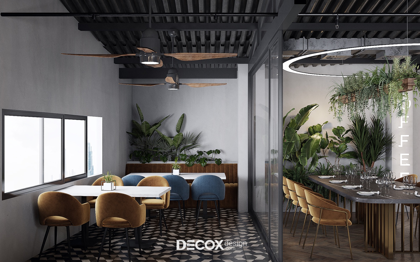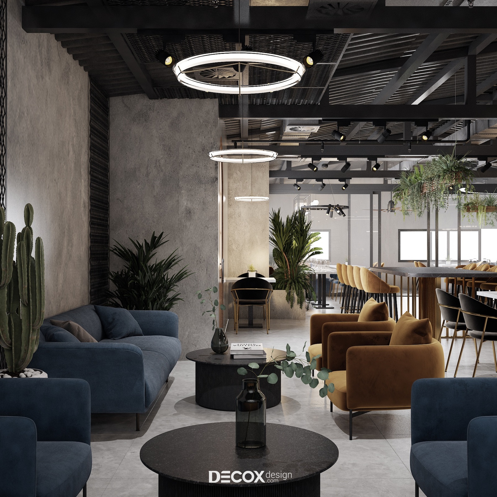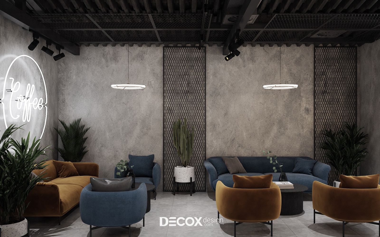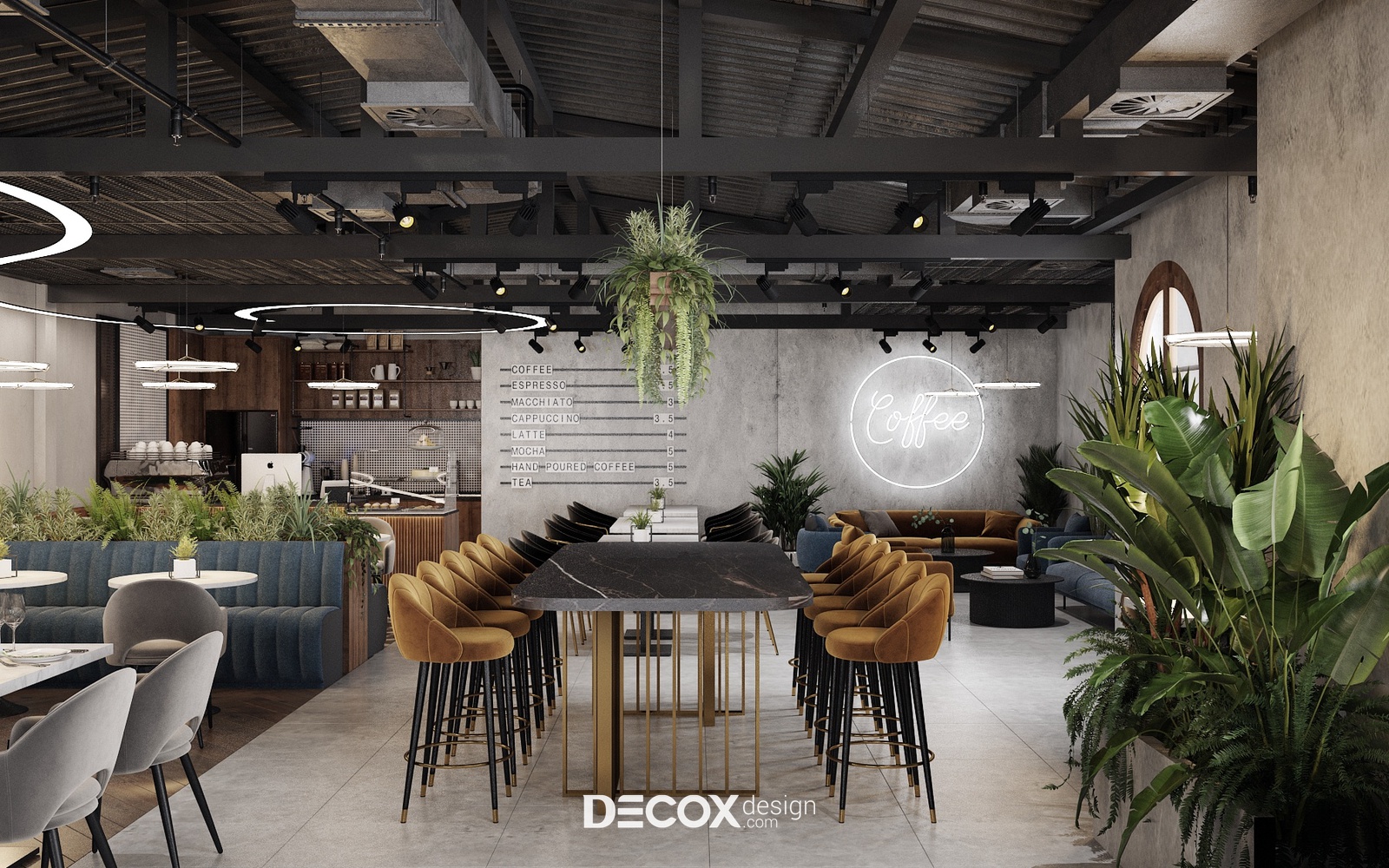 Không gian quán cafe được thiết kế theo dạng mở lấy nội thất làm điểm nhấn. Điều này được thể hiện rõ nét thông qua sự đa dạng trong nội thất sử dụng và cách decor khác nhau ở từng khu vực. Tuy không đồng bộ nhưng tổng thể vẫn giữ được sự hài hòa và kết nối nhờ bảng màu sử dụng. Đó là sắc xám, đen, nâu, xanh dương, vàng đất và sắc xanh tươi mới đến từ cây xanh trang trí xuyên suốt toàn bộ không gian quán. Những tone màu “sôi nổi” ấy đã được phô diễn hoàn hảo trên phông nền bê tông chủ đạo.