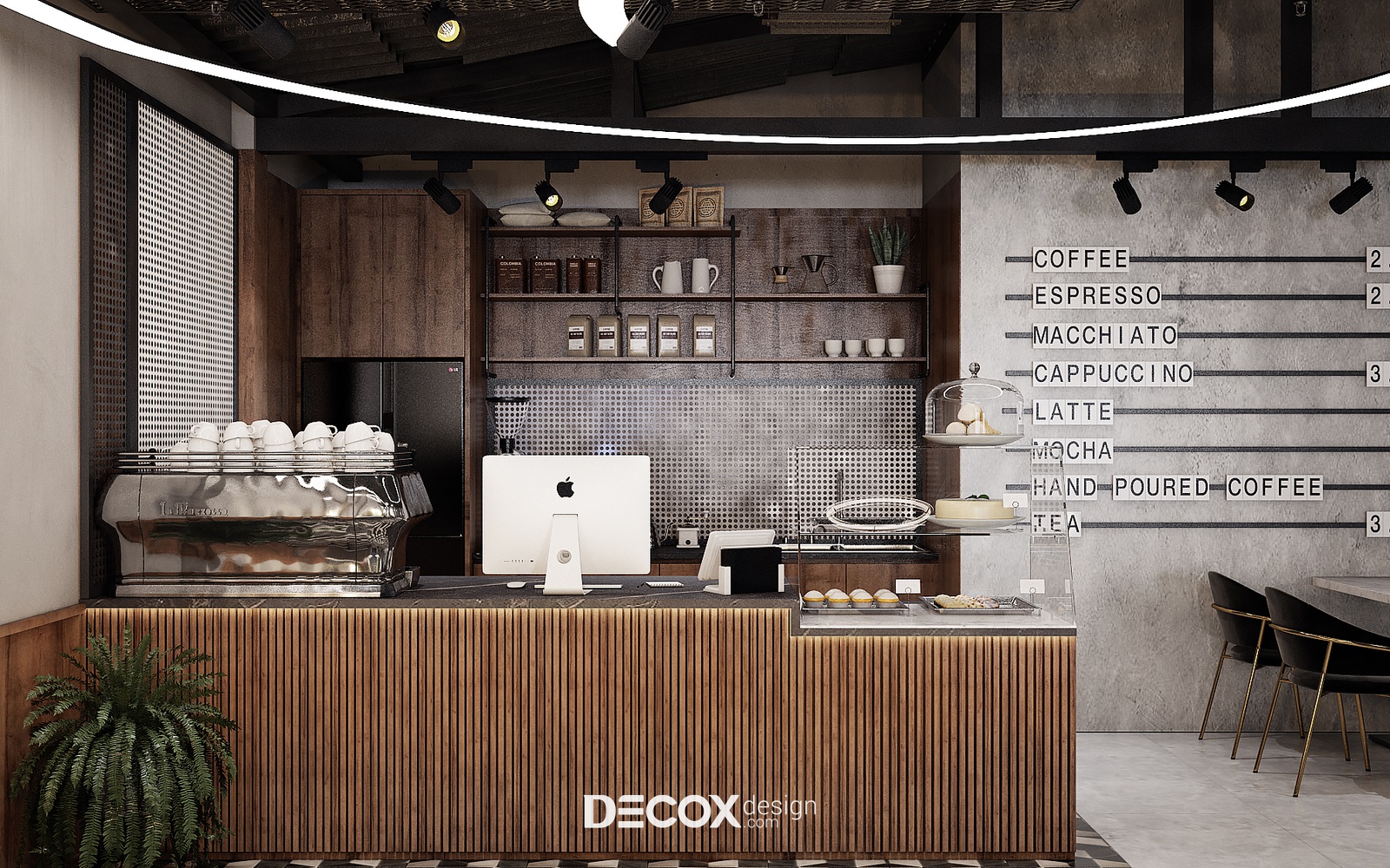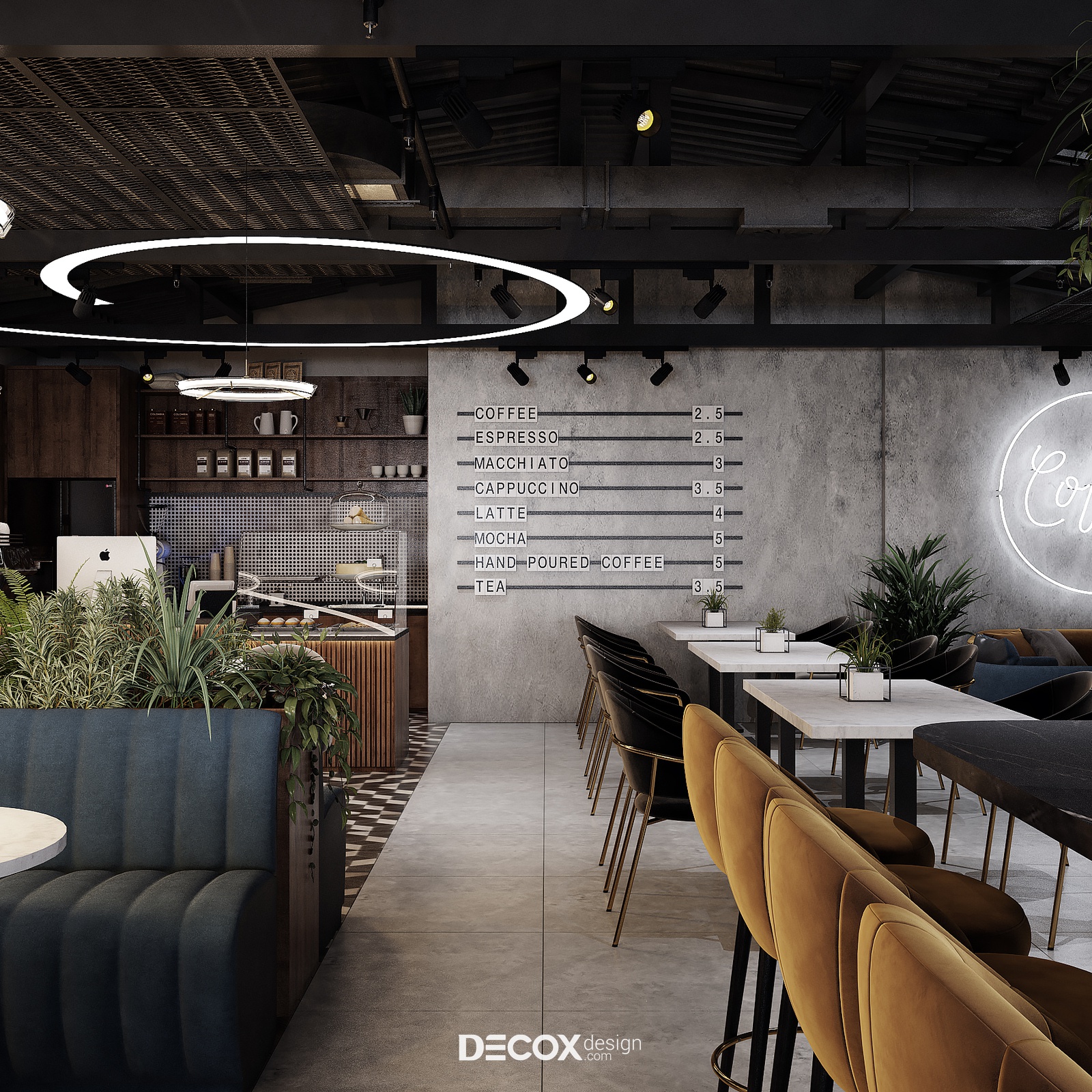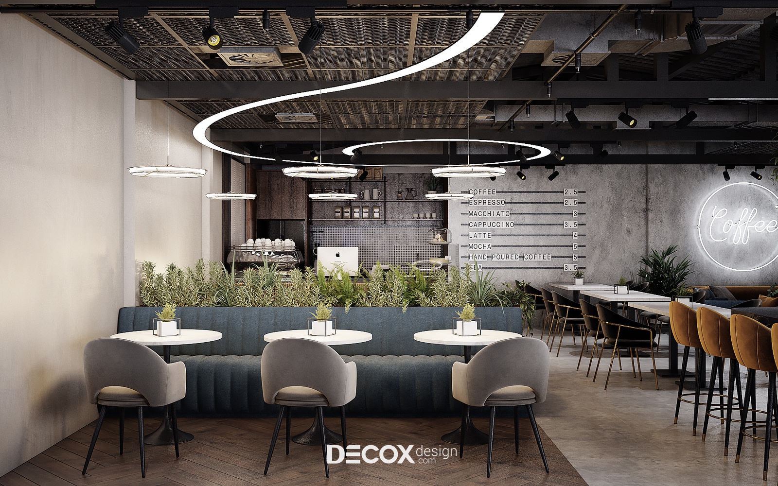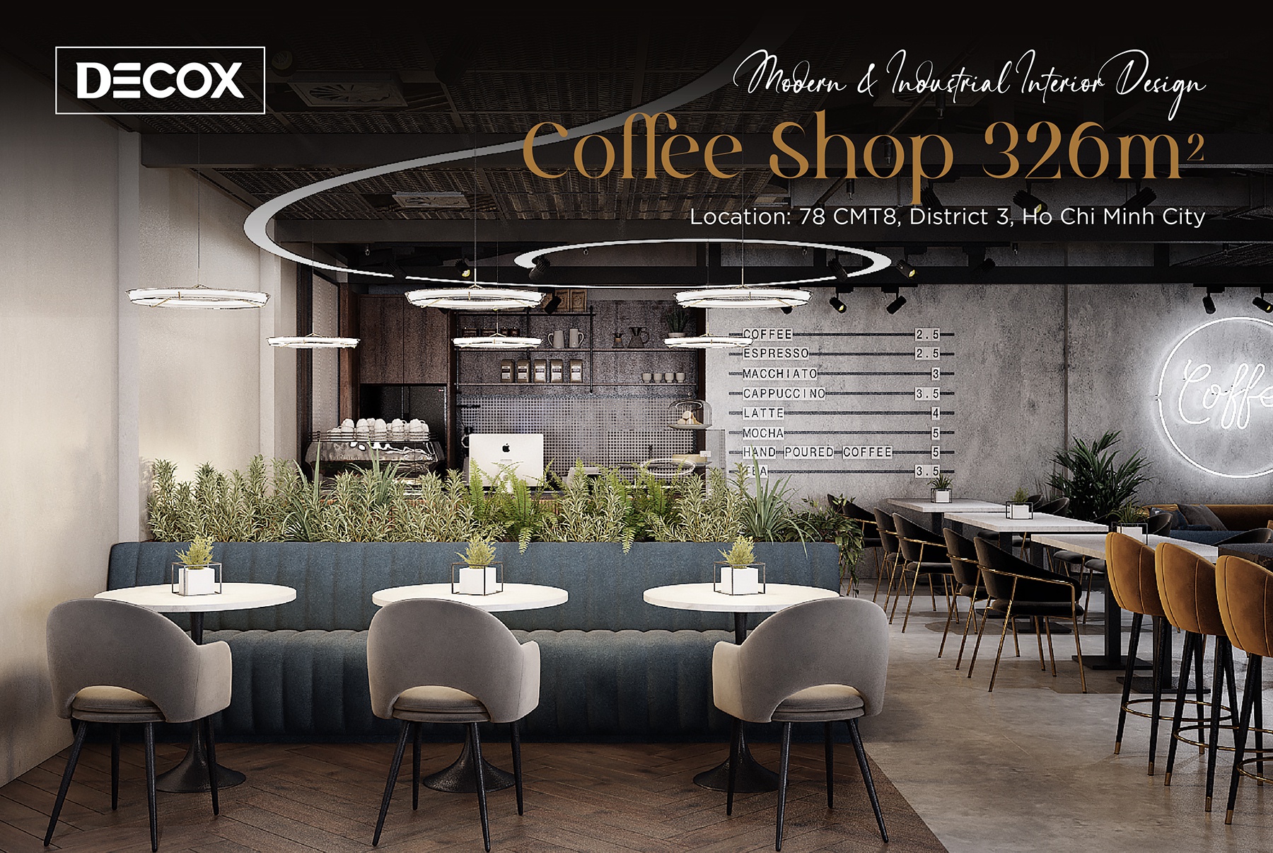 Decox Design giới thiệu đến bạn một dự án thiết kế nội thất quán cafe tại Quận 3 mà chúng tôi vừa tiếp nhận trong thời gian vừa qua. Nằm trên tuyến đường Cách Mạng Tháng Tám sầm uất, nơi dòng người hối hả tấp nập qua lại, “anh chủ” mong muốn không gian quán cafe của mình thật phá cách, khác biệt và chạm đến ngưỡng bình yên trong tâm hồn của những vị khách. Vẫn dựa trên cảm hứng từ tinh thần hiện đại kết hợp industrial đầy cá tính như trong option 1, thế nhưng ở option này các KTS đã biến tấu không gian đầy cá tính và “lột tả” rõ nét chất công nghiệp hơn thông qua màu sắc và chất liệu sử dụng. Sau đây, Decox mời bạn cùng tham quan những không gian bên trong dự án thiết kế nội thất quán cafe này nhé.