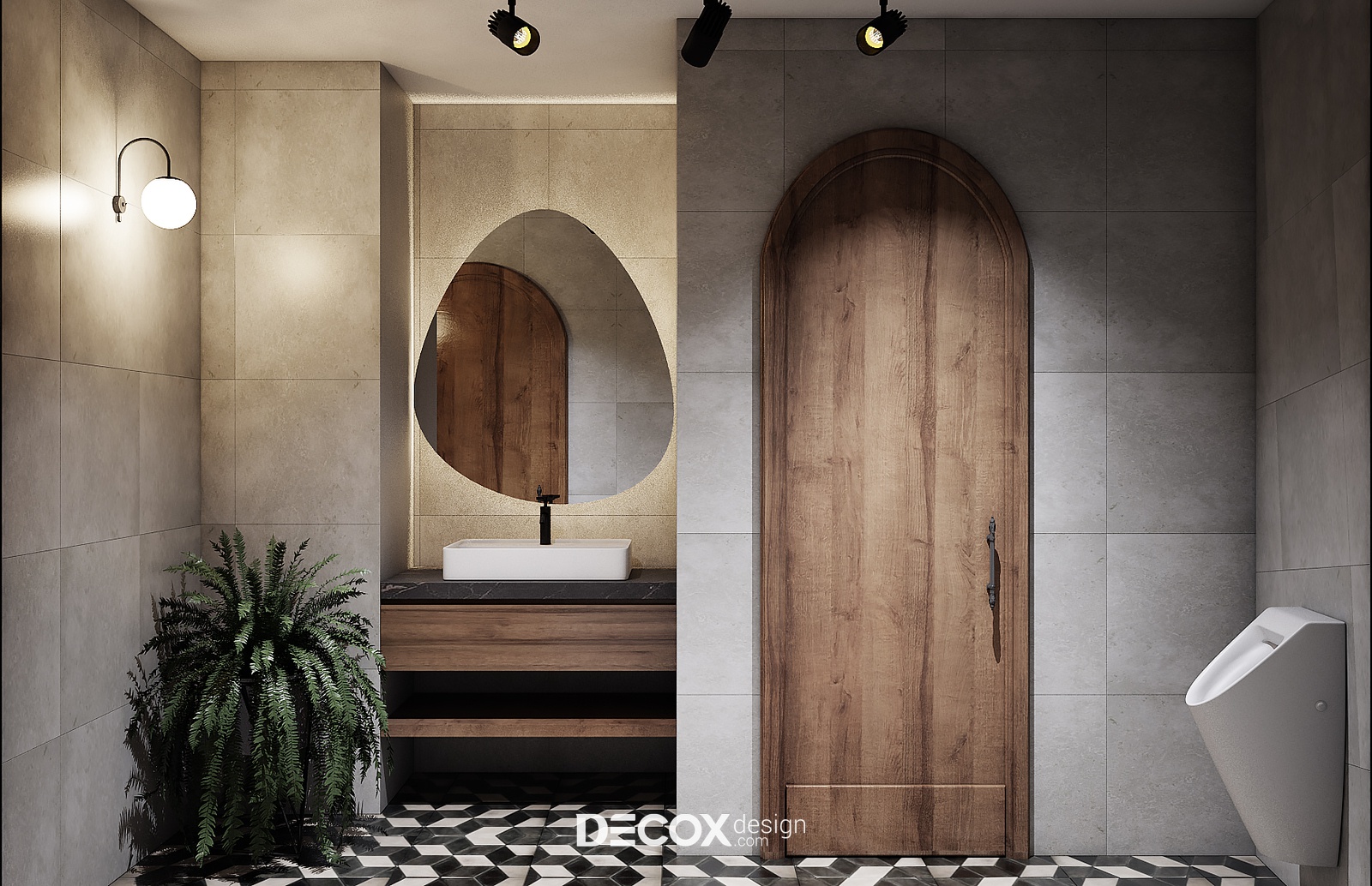 Nhằm tạo sự đồng điệu trong chất liệu, màu sắc lẫn phong cách thiết kế, KTS đã chọn lựa sử dụng chất liệu gạch giả bê tông ốp tường khu vực WC. Bên cạnh đó, nội thất gỗ kết hợp cây xanh trang trí cùng ánh đèn vàng dịu nhẹ cũng góp phần làm tăng yếu tố thư giãn, thể hiện sự đầu tư và tính chuyên nghiệp của quán.