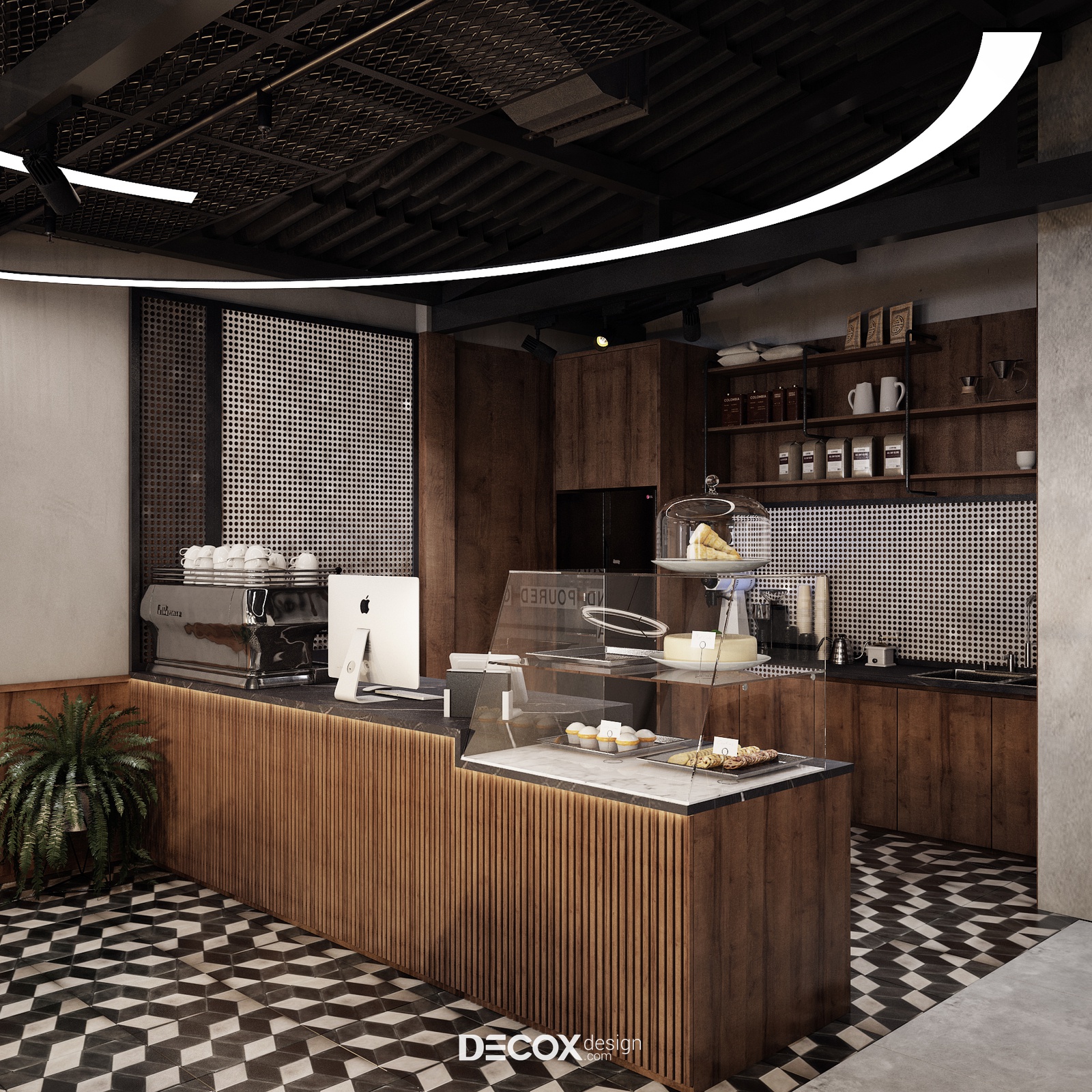 Không gian quầy order - thu ngân và pha chế của quán được decor theo phong cách mộc mạc, giản dị lấy chất liệu gỗ chủ đạo. Điều này mang đến sự tương phản đầy ý nhị so với sự cá tính mà tổng thể đang hướng đến. Nội thất khu vực này bao gồm hệ bếp nấu chữ I đơn giản đặt sát vách tường kết hợp cùng quầy thu ngân có kích thước tương đồng đặt song song. Chất liệu nội thất lấy gỗ chủ đạo, tuy nhiên, để không gian không bị nhạt nhòa và kém thu hút KTS đã chọn lựa sử dụng chất liệu đá marble sang trọng trên mặt bàn bếp và mặt quầy thu ngân. Chi tiết này khi cộng hưởng cùng ánh đèn hắt dịu nhẹ càng làm tăng thêm sức hút giản dị, ấm cúng mà cao cấp của quán.