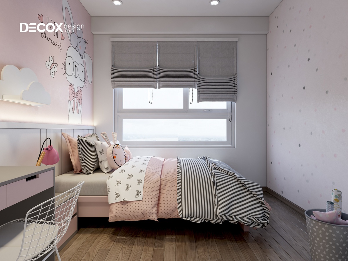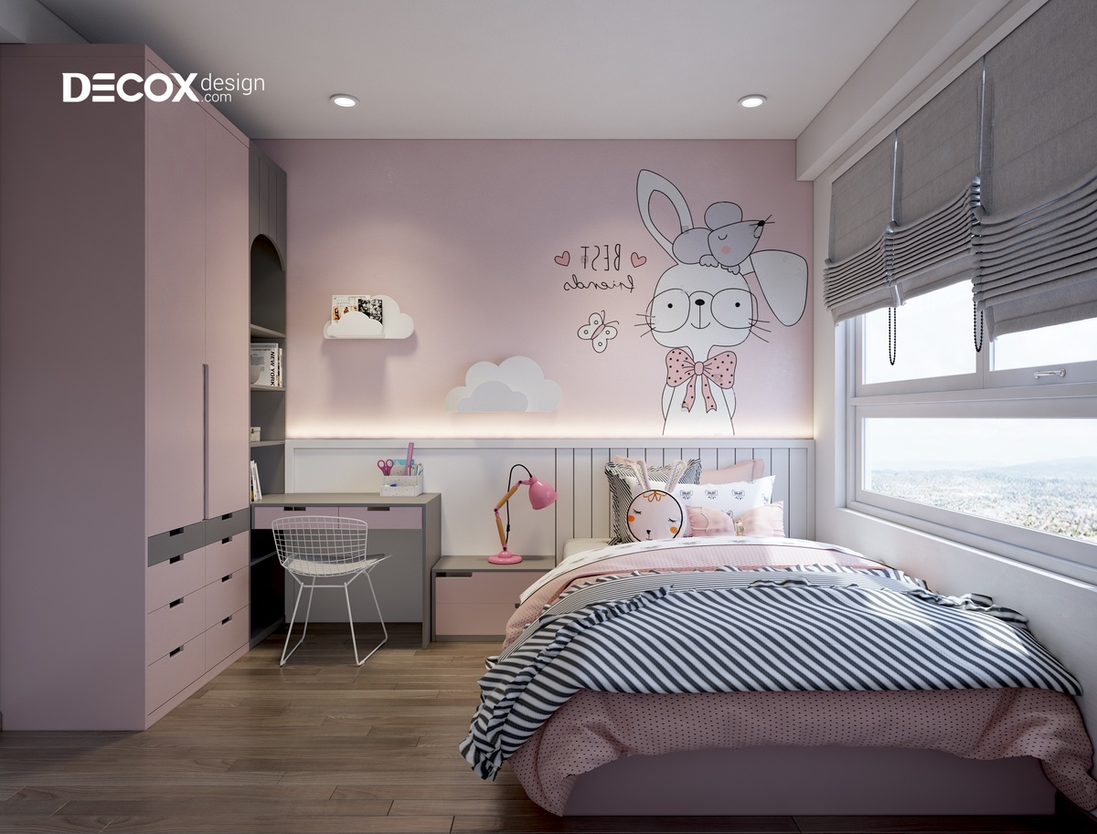 Phòng ngủ cho bé gái được trang trí với tông màu hồng dịu dàng, kết hợp với các hình thỏ con vui mắt. Điều này sẽ tạo cảm giác gần gũi và thú vị hơn cho các bé khi sinh hoạt trong phòng. Phía bên trái là bàn học và kệ tủ được bố trí khoa học để bé có thể dễ dàng sử dụng và sắp xếp vật dụng cá nhân của mình.