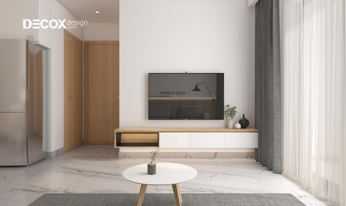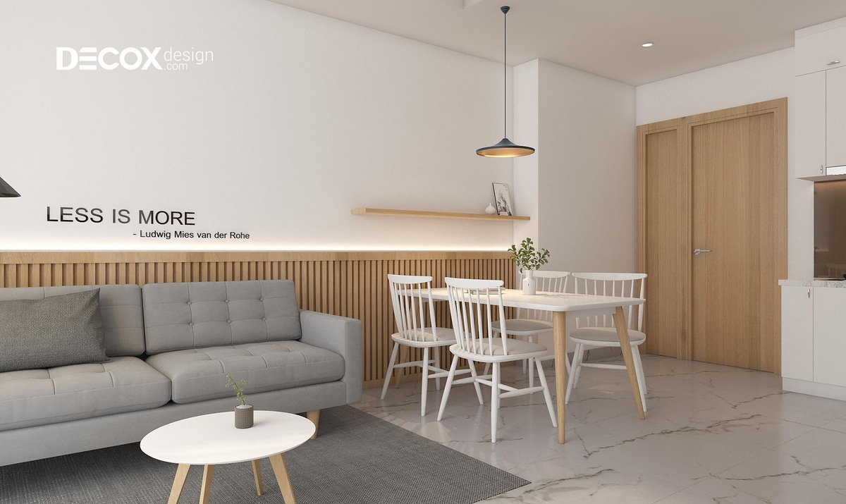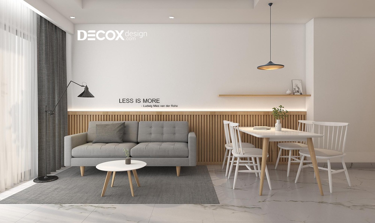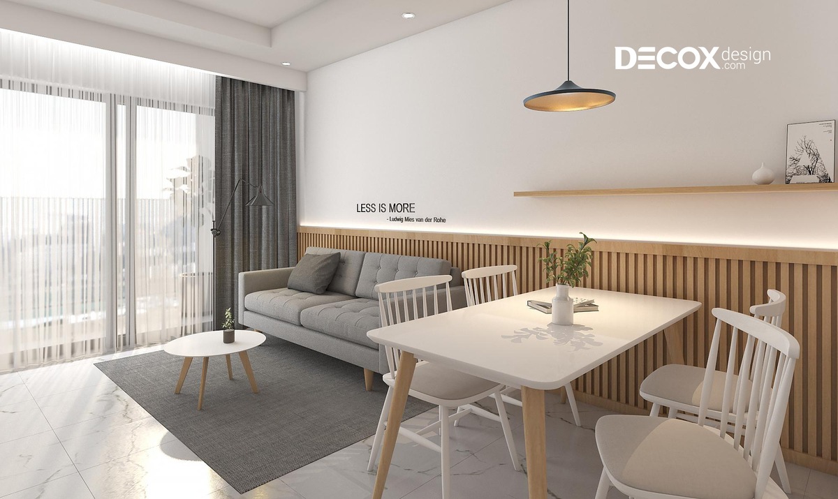 Decox Design mang đến mẫu thiết kế căn hộ chung cư cho những khách hàng không thích sự rườm rà, màu sắc. Họ chỉ thích những gì đơn giản, gọn gàng và để lại ấn tượng tốt cho khách đến chơi nhà.