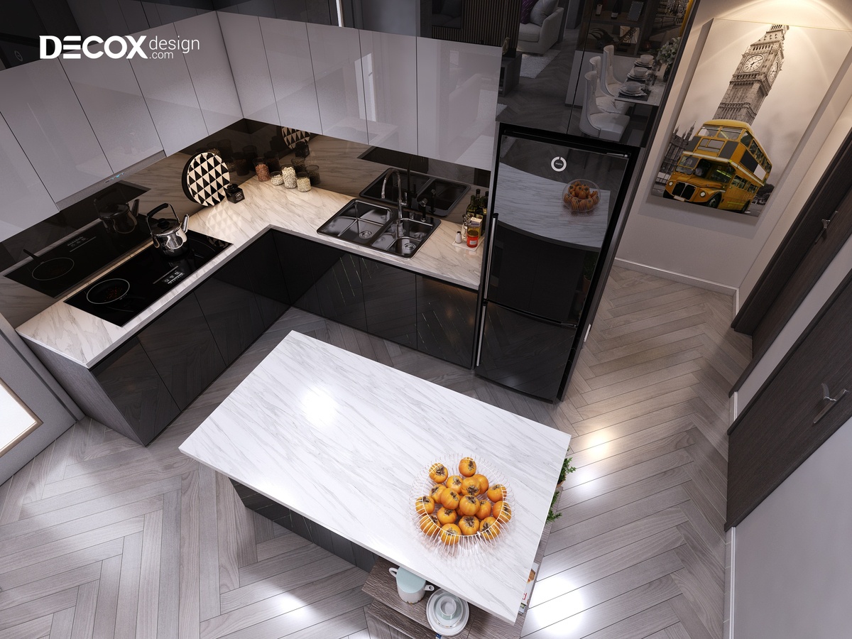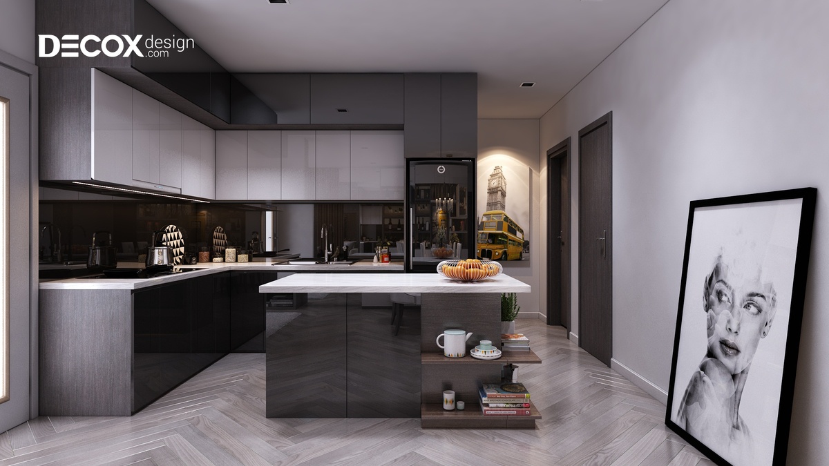 Vì diện tích của căn hộ khá lớn nên không gian bếp cũng rộng rãi, thoải mái. Với concept căn hộ sang trọng, gian bếp được thiết kế có nhiều mặt kính đen, cửa tủ gỗ thì phun sơn trắng tạo không gian rất khang trang, đẹp mắt.