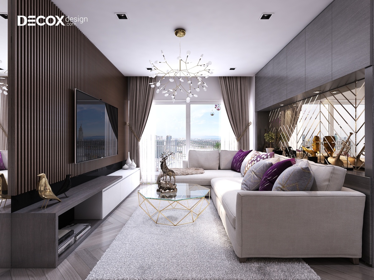 Tạo thêm sự đặc sắc cho gian phòng, người thiết kế thêm điểm nhấn như gối sofa màu hồng tím, bàn kính chân đa giác thanh thoát và tường tivi là những thanh gỗ sọc dài giúp tạo cảm giác tăng chiều cao cho gian phòng.