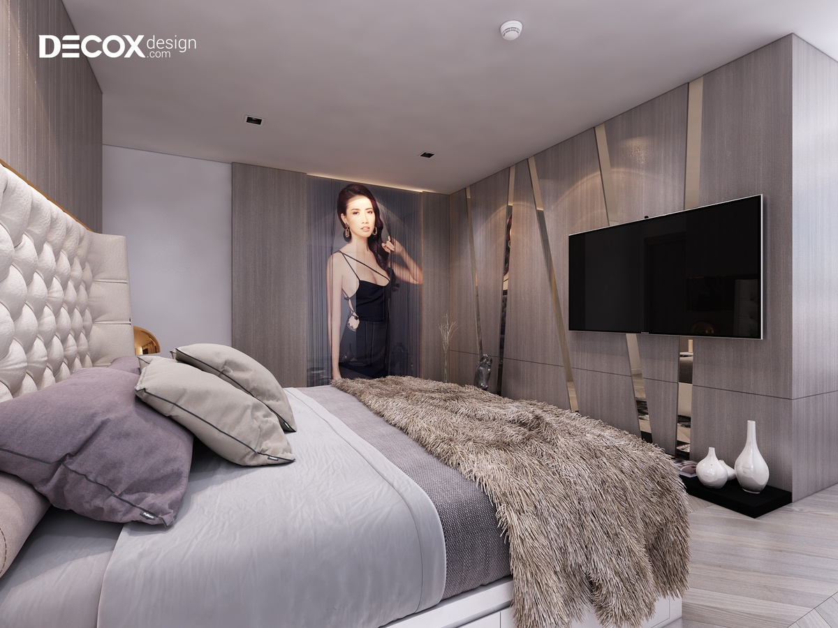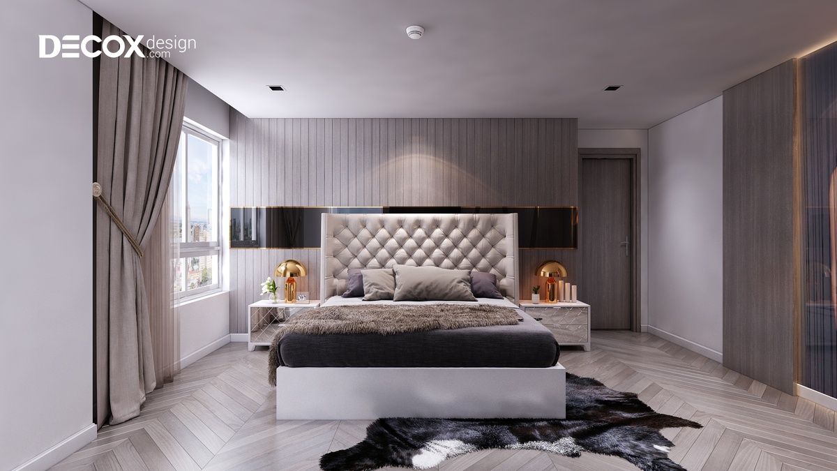 Tông màu be được kết hợp với màu nâu tạo cảm giác dễ chịu, thoải mái cho gia chủ dễ dàng đi vào giấc ngủ sâu sau một ngày dài mệt mỏi. Để tạo thêm điểm nhấn cho không gian, trên tường được thêm đường viền kim loại đẹp mắt, tuy nổi bật nhưng vẫn hòa hợp, nhẹ nhàng.