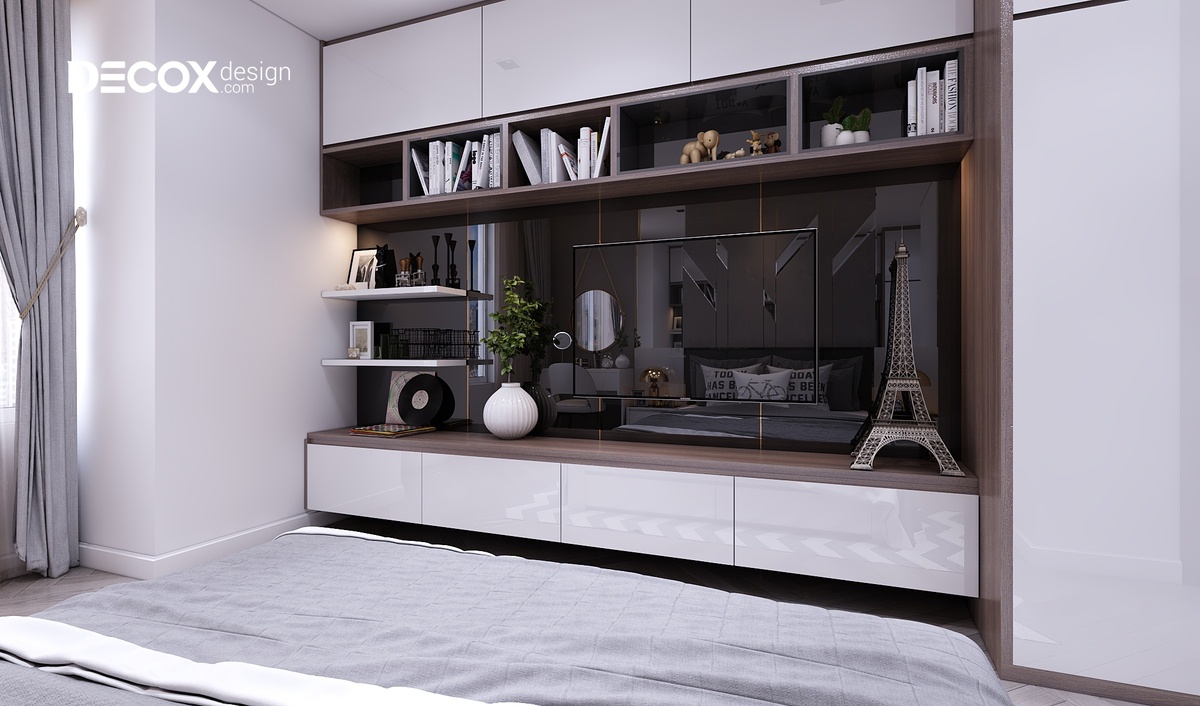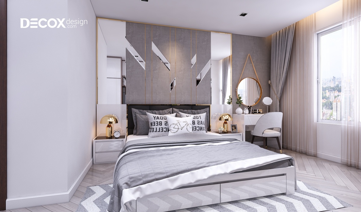 Sinh động và tươi mới hơn là phòng ngủ nhỏ. Với gam màu xám trung tính, phòng ngủ nhỏ được thêm các điểm nhấn như gương treo kim loại, những đường kính nhỏ phản chiếu cho không gian rộng hơn và kệ tivi nhiều ngăn có thể trưng bày hay trang trí những cuốn sách, khung hình mà mình yêu thích.