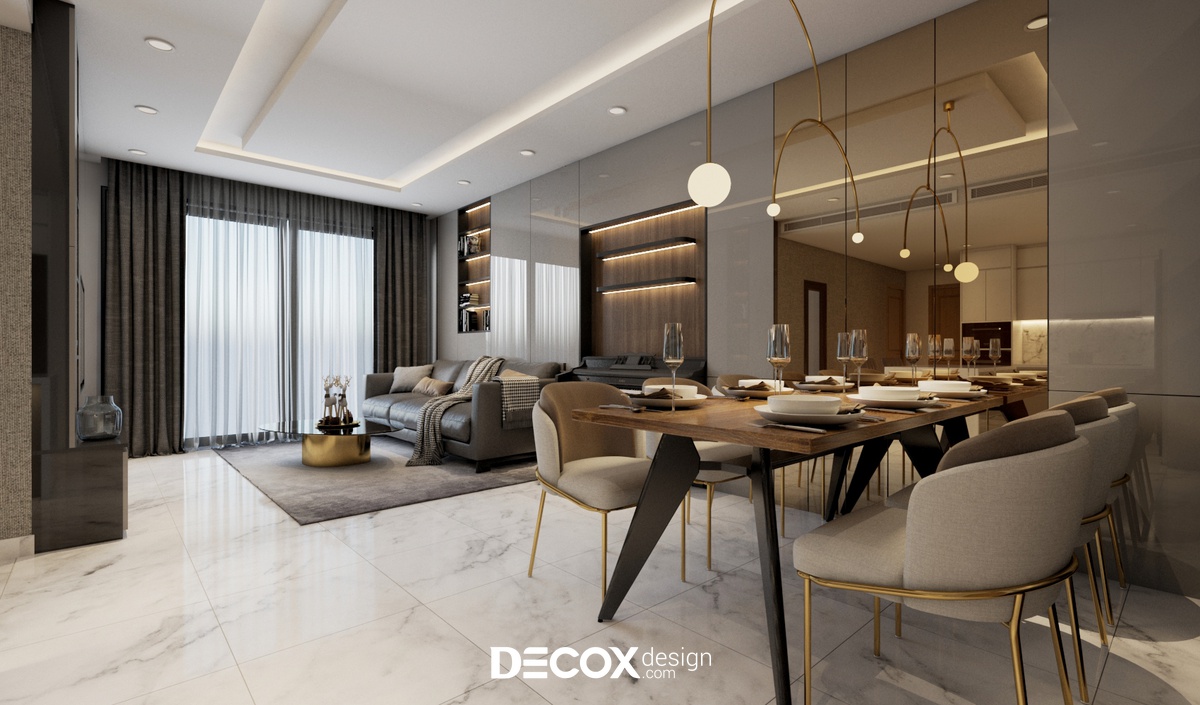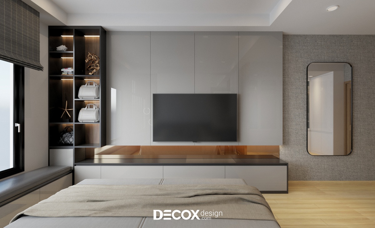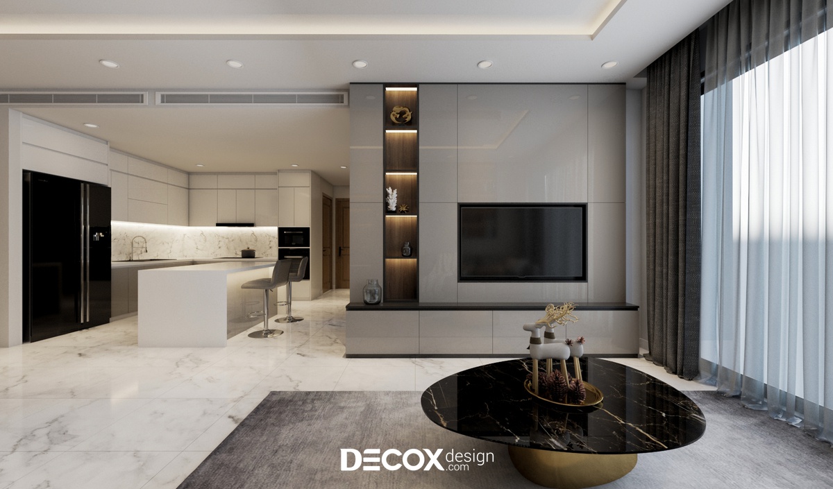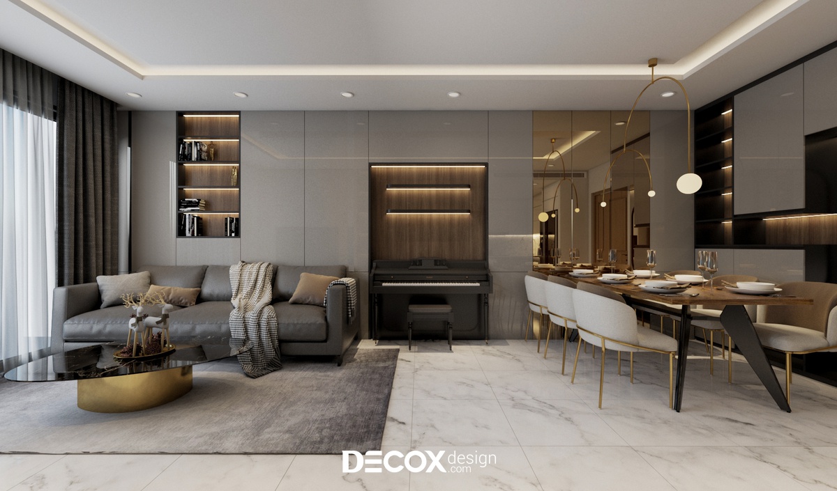 Lựa chọn thiết kế nội thất chung cư theo phong cách hiện đại với 3 tone màu: xám - trắng - gỗ walnut chủ đạo cùng những đường nét thẳng giúp không gian căn hộ bộc lộ được nét khỏe khoắn, trẻ trung. Bên cạnh đó, KTS của Decox Design còn bố trí thêm hệ thống đèn LED ở vị trí tủ kệ giúp không gian thêm ấm cúng và ấn tượng.