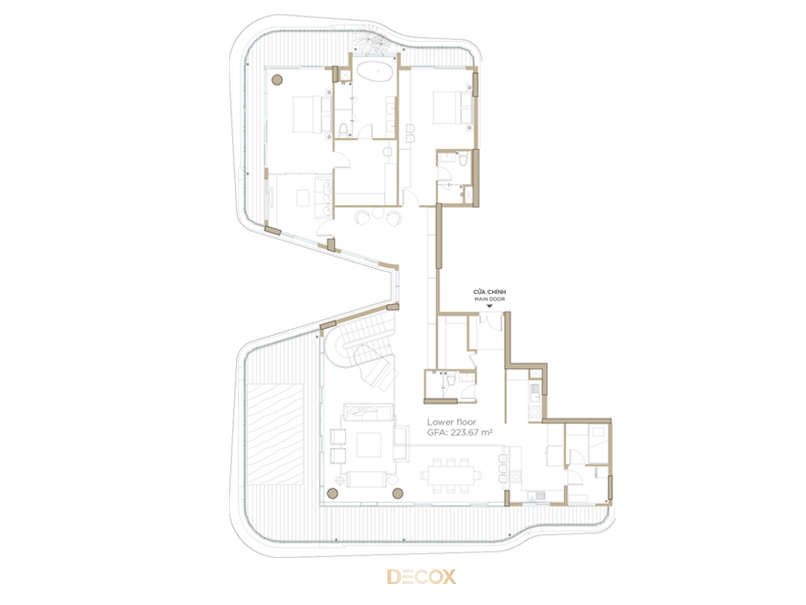 Khu vực phòng khách - bếp và phòng ăn được đặt trong cùng một không gian với lối thiết kế mở mang đến sự kết nối và rộng thoáng về mặt tầm nhìn. Tinh thần phong cách indochine trên phông nền hiện đại pha trộn một chút yếu tố thuộc về tương lai cũng được thể hiện rõ nét trong không gian này. Sự đan xen giữa tính truyền thống và hiện đại được “phô diễn” hoàn hảo trên chất liệu, màu sắc và nội thất. Đó là hệ đồ fur sử dụng các texture hoa văn truyền thống kết hợp với những vật liệu mang tính hiện đại như đá xuyên sáng, kim loại, kính… Ngoài ra, tinh thần hiện đại còn nằm ở hệ thang xoắn đúc nguyên khối với lan can kính, các hệ background bằng đá xuyên sáng,...